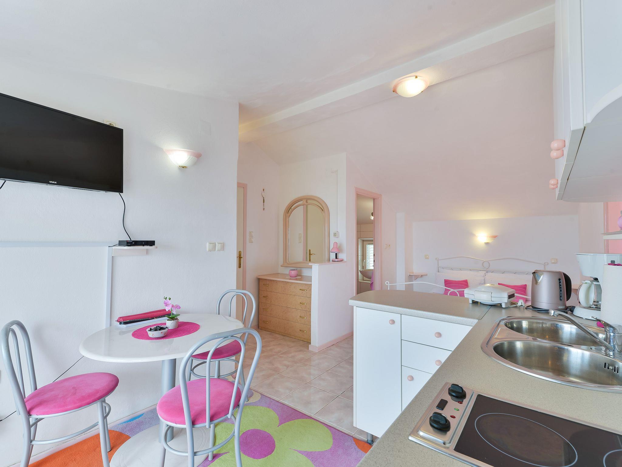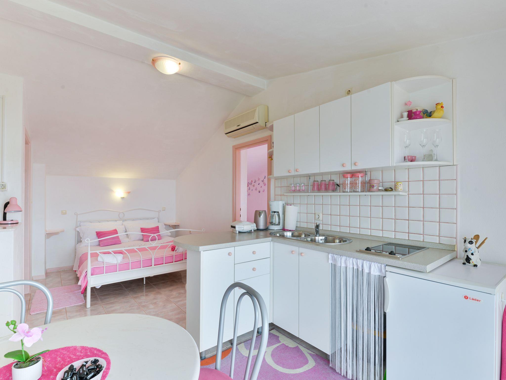 Studio bietet Platz für 3 Gäste. Die Betten sind in Schlafzimmern, die es 2 gibt, innerhalb einer Gesamtfläche von 31m2, angeordnet. Die Gäste haben eine eigene Terrasse zur Verfügung, auf der sie in warmen Sommernächten genießen können. Das Studio-Apartment bietet Meerblick. Es ist erlaubt, Speisen auf dem Gemeinschafts-Grill vorzubereiten. In der Unterkunftseinheit besteht die Möglichkeit des Mitbringens von Haustieren gegen Aufpreis. IM PREIS INBEGRIFFEN: Kurtaxe, Endreinigung, Parkplatz, Internet, Föhn, Sonnenschirm. VERBINDLICHE ZUSÄTZLICHE KOSTEN: Aufzahlung für Kurzaufenthalte (prozentualer Zuschlag pro Nächtigungsanzahl: 30% - 1, 20% - 2, 10% - 3). UNVERBINDLICHE ZUSÄTZLICHE KOSTEN: Klimatisierung (5,00 € pro Nacht), Haustiere (5,00 € pro Nacht). Die Verfügbarkeit zusätzlicher Dienstleistungen in Ihrem reservierten Termin und die Preise derselben (falls nicht aufgeführt) müssen im Voraus überprüft werden. Zusätzliche Dienstleistungen die in der Zahlungsaufforderung nicht aufgeführt sind werden direkt beim Vermieter bezahlt, angenommen der Gast nutzt auch diese.