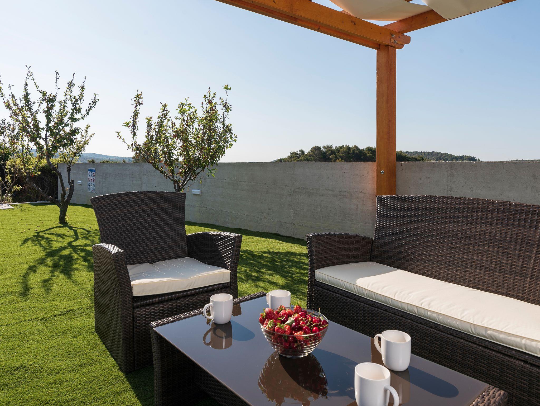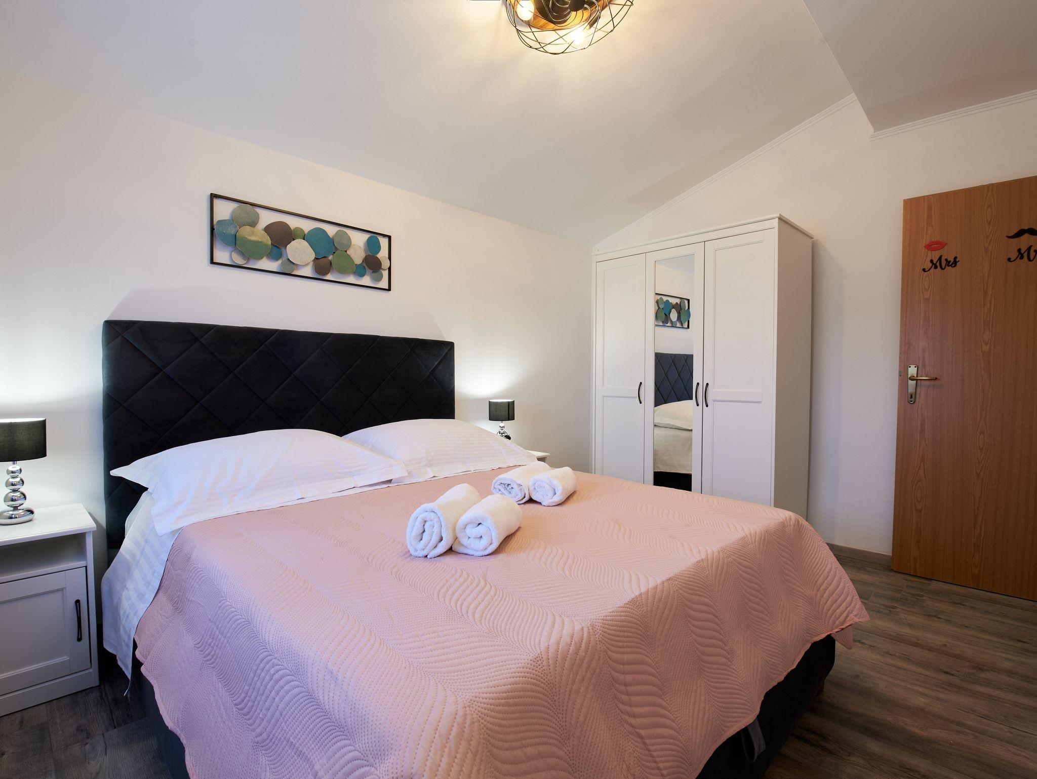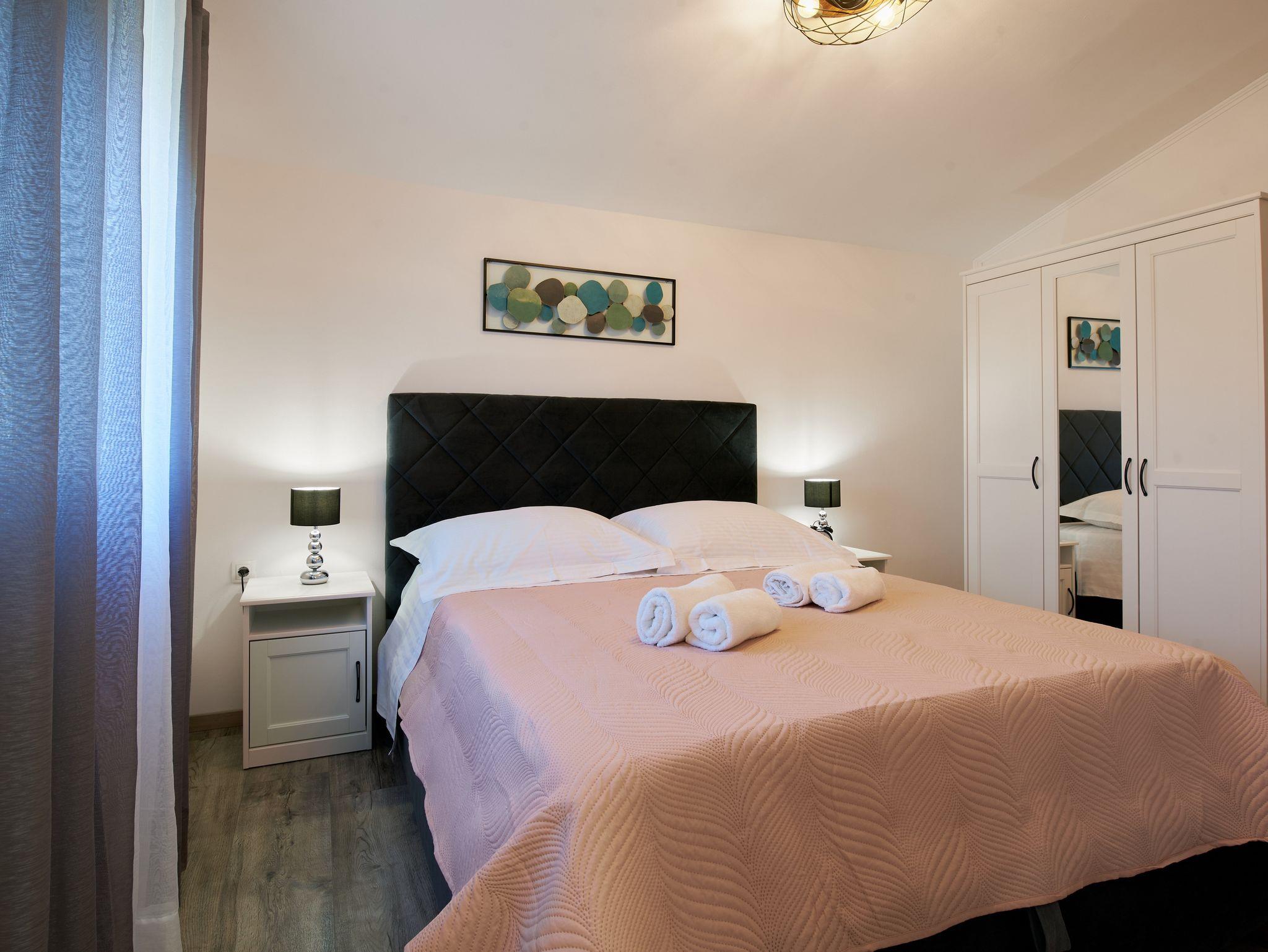 Ferienwohnung bietet Platz für 6 Gäste. Die Betten sind in Schlafzimmern, die es 3 gibt, innerhalb einer Gesamtfläche von 77m2, angeordnet. Die Gäste haben eine eigene Terrasse zur Verfügung, auf der sie in warmen Sommernächten genießen können. Das Apartment bietet Meerblick. Es ist erlaubt, Speisen auf dem Gemeinschafts-Grill vorzubereiten. Während ihres Aufenthalts können sich Gäste im privaten Schwimmbad entspannen. IM PREIS INBEGRIFFEN: Kurtaxe, Endreinigung, Klimatisierung, Pool, Parkplatz, Internet, Kinderbett, Bügeleisen, Bügelbrett, Föhn. VERBINDLICHE ZUSÄTZLICHE KOSTEN: Aufzahlung für Kurzaufenthalte (prozentualer Zuschlag pro Nächtigungsanzahl: 30% - 1, 20% - 2, 10% - 3). Die Verfügbarkeit zusätzlicher Dienstleistungen in Ihrem reservierten Termin und die Preise derselben (falls nicht aufgeführt) müssen im Voraus überprüft werden. Zusätzliche Dienstleistungen die in der Zahlungsaufforderung nicht aufgeführt sind werden direkt beim Vermieter bezahlt, angenommen der Gast nutzt auch diese.