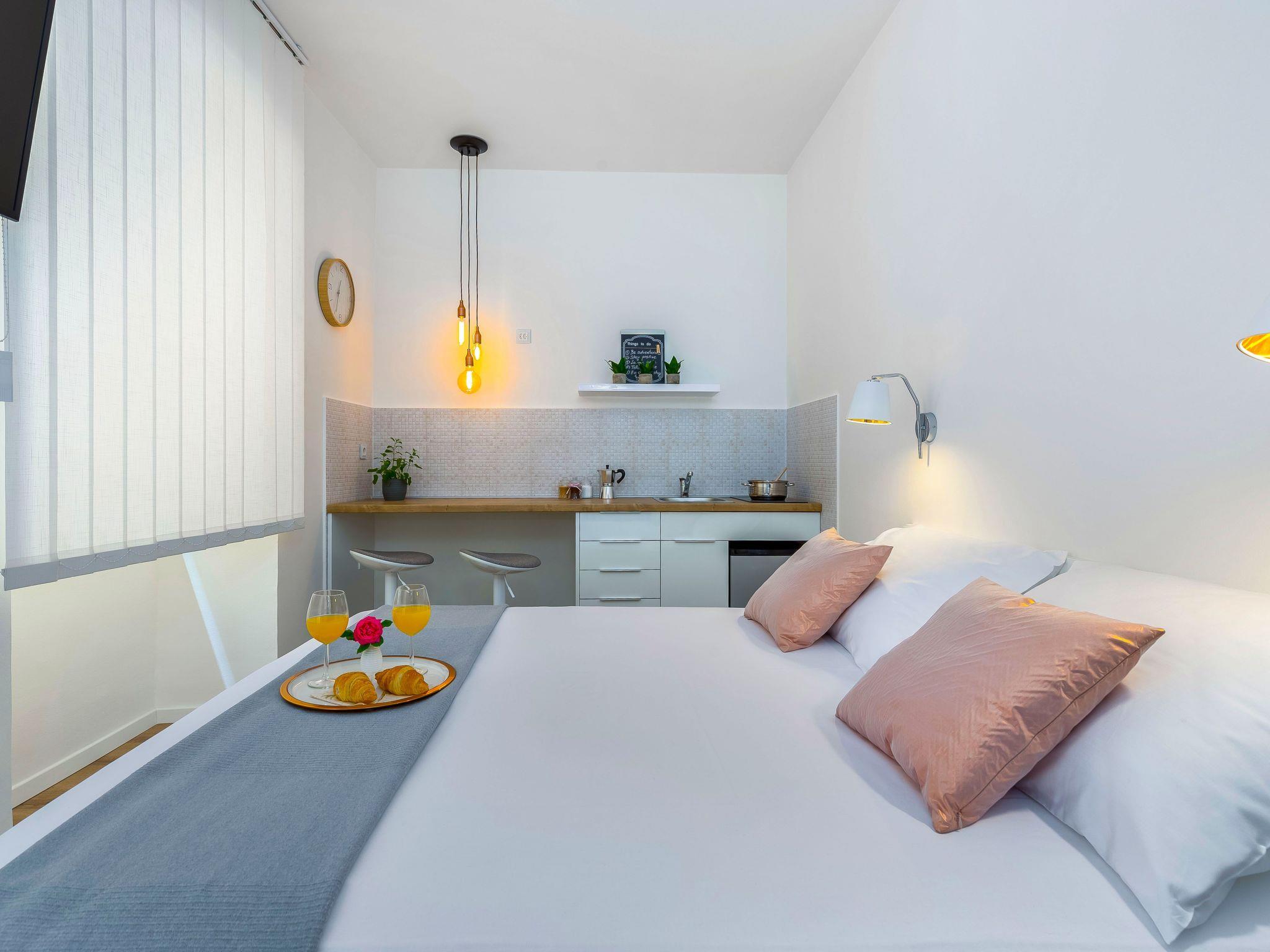 Step inside this 22 m2 studio apartment where minimalist tradition meets modern elegance, creating a stylish and comfortable living space. The apartment boasts a king-size bed, a kitchenette complete with dishes, a cozy two-person dinette set, ample closet space, inviting armchairs with a tea table, and a chic bathroom. The thoughtful layout connects the kitchenette with the dining area and bedroom, ensuring convenience and ease of living. Complete technical equipment, including new appliances and furniture, smart access via PIN for quick check-in and check-out, air conditioning, complimentary Wi-Fi and unlimited internet, a smart TV box with Netflix, touch switches, a walk-in digital shower, and a towel warmer, adds a special value to your stay.