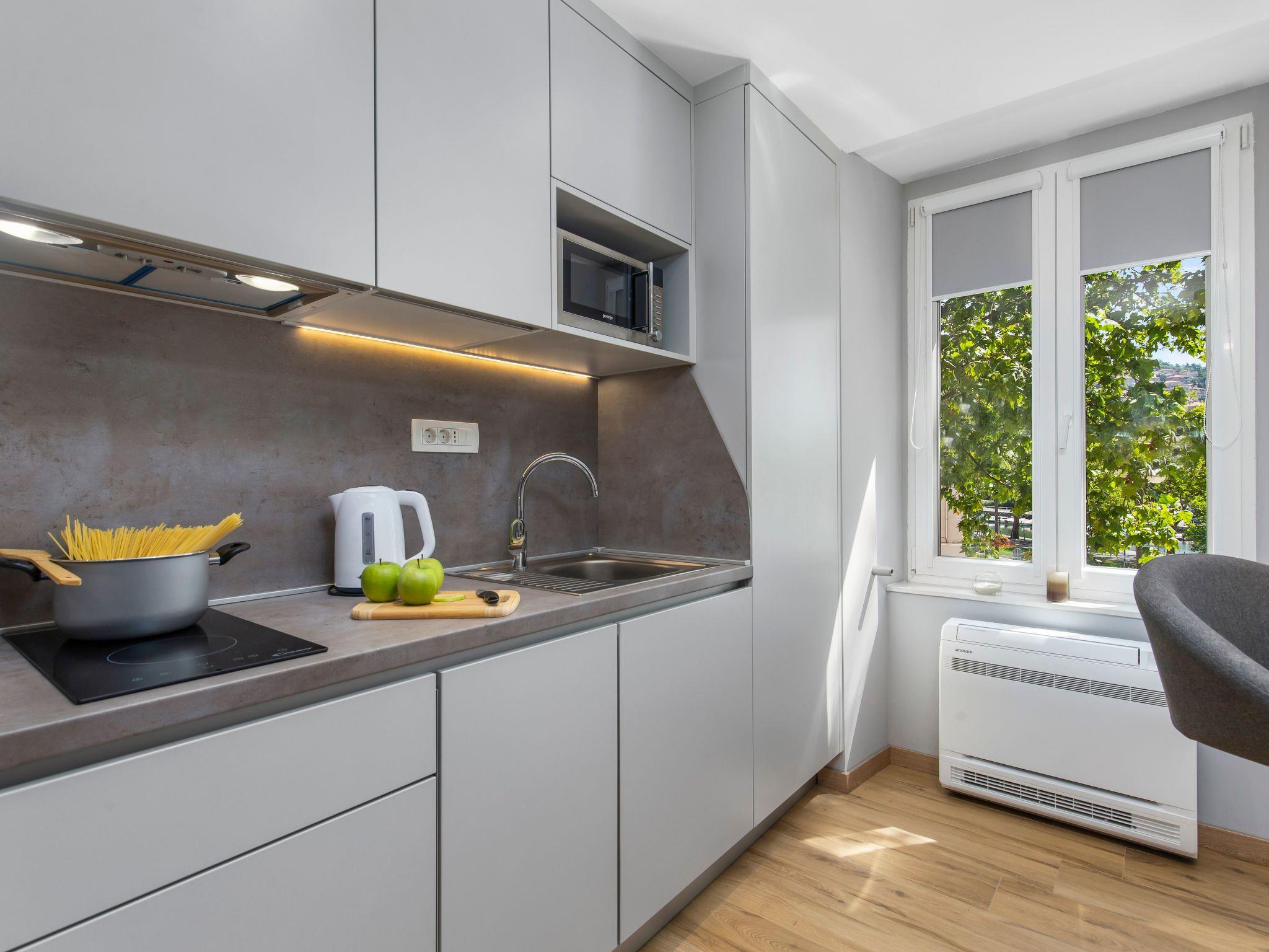 InCenter Apartments Rijeka are located in the heart of Rijeka at the beginning of the main city promenade. . The studios are new, modernly equipped, and exudes positive energy. The combined living/sleeping area is fitted with a King-sized bed, complete with high-tech facilities including air conditioning and a android flatscreen ambient light TV. Kitchen equipment includes dishwasher, Cooker, cooking utensils, plates, cutlery, and glasses, microwave, kettle, and refrigerator. Everything you need for a cozy evening at home is available in the kitchen. The bathroom is of very high quality and offers a lot of space. It is equipped with a spacious walk-in shower. Iron, ironing board, and a hairdryer are also provided as standard. Public parking/garage nearby. The price includes tourist tax, all utilities, and super-fast fiber optic internet connection, quality linens, a final cleaning service, and continuous assistance to solve any problem which may occur during your stay in Rijeka.