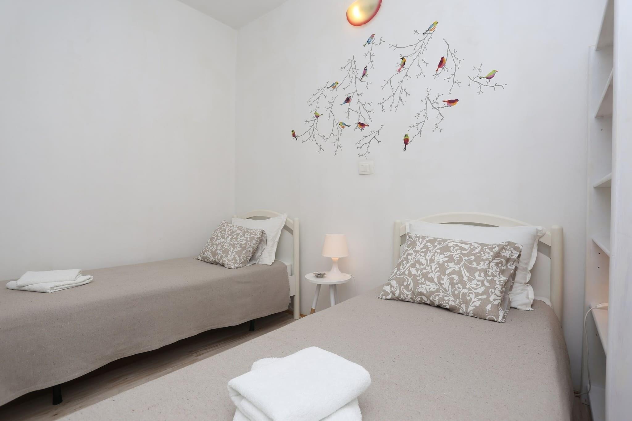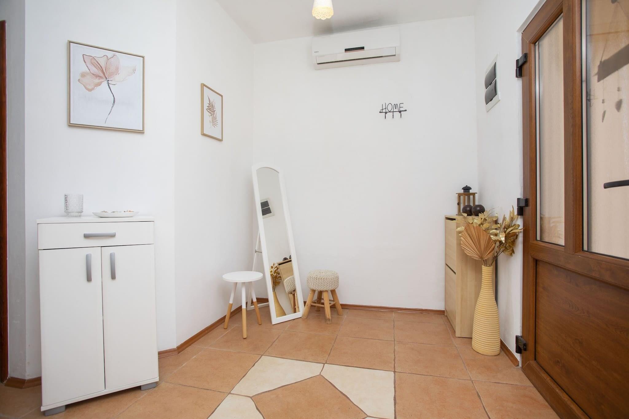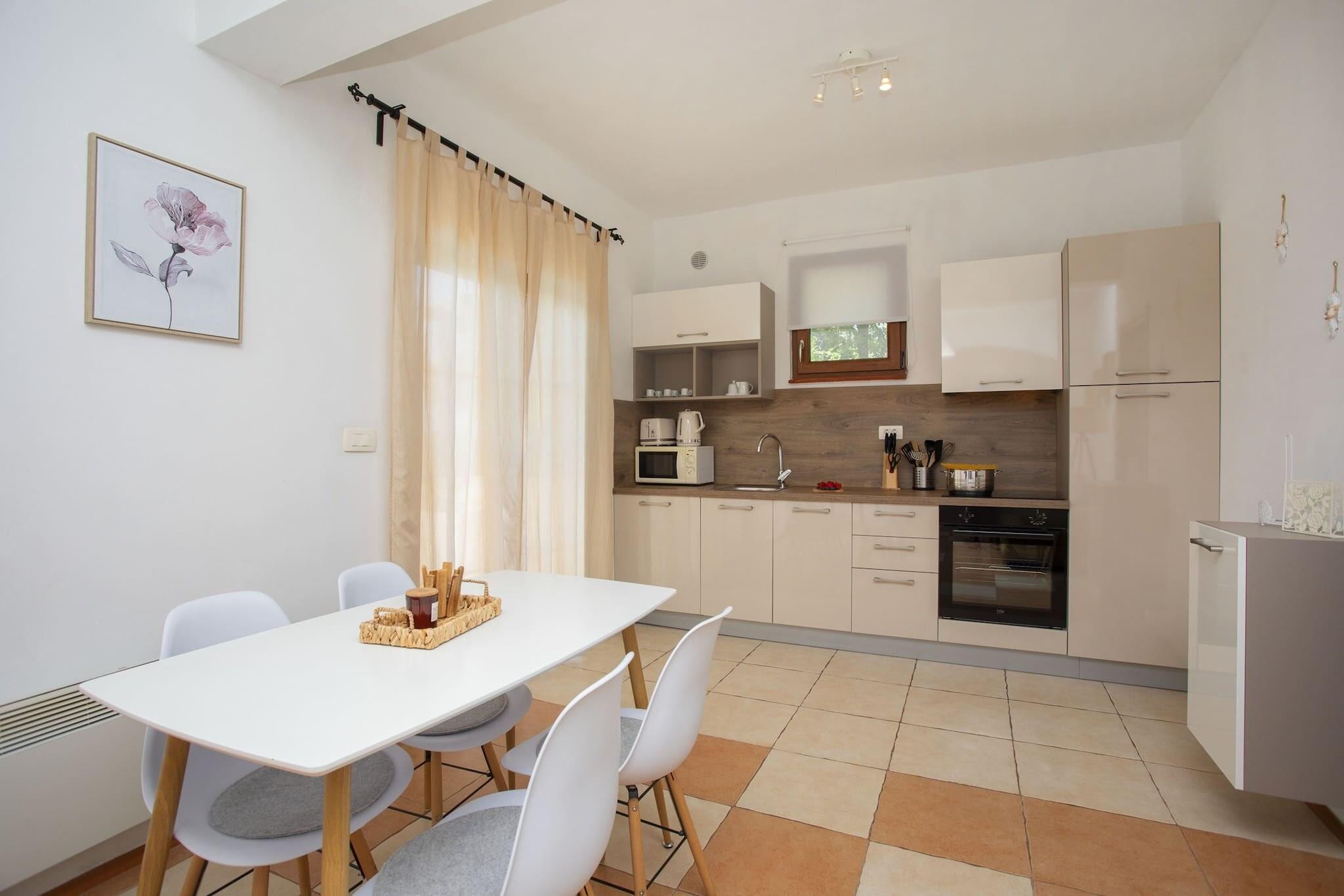 Dette indbydende feriehus har to komfortable soveværelser: det ene med en queen-size seng og det andet med to enkeltsenge, der byder på rigelig plads til en familie eller en lille gruppe. Ejendommen kan rumme op til fire personer, med yderligere faciliteter såsom en barneseng og højstol tilgængelige efter anmodning. Gæsterne kan nyde den private swimmingpool, som er ideel til at køle af på varmere dage. Ejendommen er kæledyrsvenlig og tillader små kæledyr mod et ekstra gebyr. Et fuldt udstyret køkken, herunder en glaskeramisk kogeplade, køleskab, mikroovn, ovn og opvaskemaskine, gør det nemt for gæsterne at tilberede måltider. Gæsterne kan slappe af på terrassen, nyde måltider tilberedt på grillen eller slappe af i den fredelige have. Wi-Fi, aircondition og en parkeringsplads er gratis. Feriehuset ligger i Ripenda Verbanci, et roligt område væk fra byens larm, og tilbyder et perfekt tilflugtssted. I nærheden kan gæsterne udforske de charmerende byer Labin og Rabac. Labins gamle bydel er rig på historie, med museer og gallerier, der viser lokal arv, herunder gamle minemodeller, der er unikke for regionen. Rabac, kun 5 km væk, er hjemsted for Blå Flag-strande såsom Maslinica, Sv. Andrea og Lanterna, der tilbyder rent hav og forskellige aktiviteter. Boligen har et rummeligt åbent køkken udstyret med moderne apparater såsom køleskab, mikroovn, ovn og kaffemaskine. Badeværelset er komplet med bruser og hårtørrer, hvilket øger bekvemmeligheden. Gæsterne kan nyde underholdning med satellit-tv, og en hyggelig pejs forbedrer opholdsområdets atmosfære.