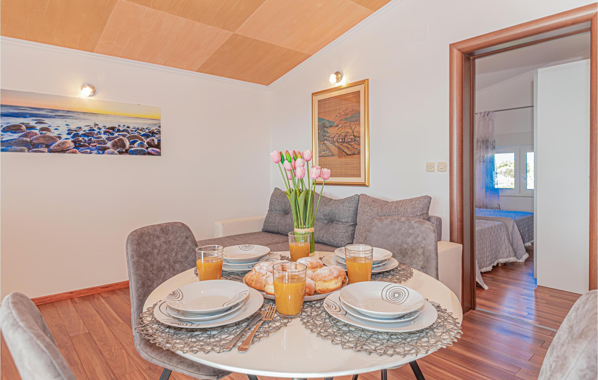 Lejligheden er lys og moderne, så her får I en rar base til jeres solferie i Kroatien. Tilbered en lækker morgenmad i det lille køkken og træd ud på balkonen, hvor I kan nyde dagens første solstråler foran en vidunderlig udsigt, som sikkert giver jer masser af energi til en dag fyldt med oplevelser. Når I kommer tilbage fra stranden eller en spændende udflugt, kan I læne jer tilbage på den lækre terrasse og nyde det fantastiske blik ud på omgivelserne, mens I nyder noget koldt i glassene.