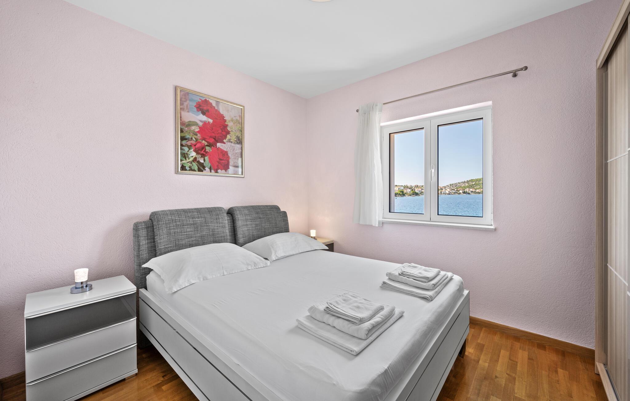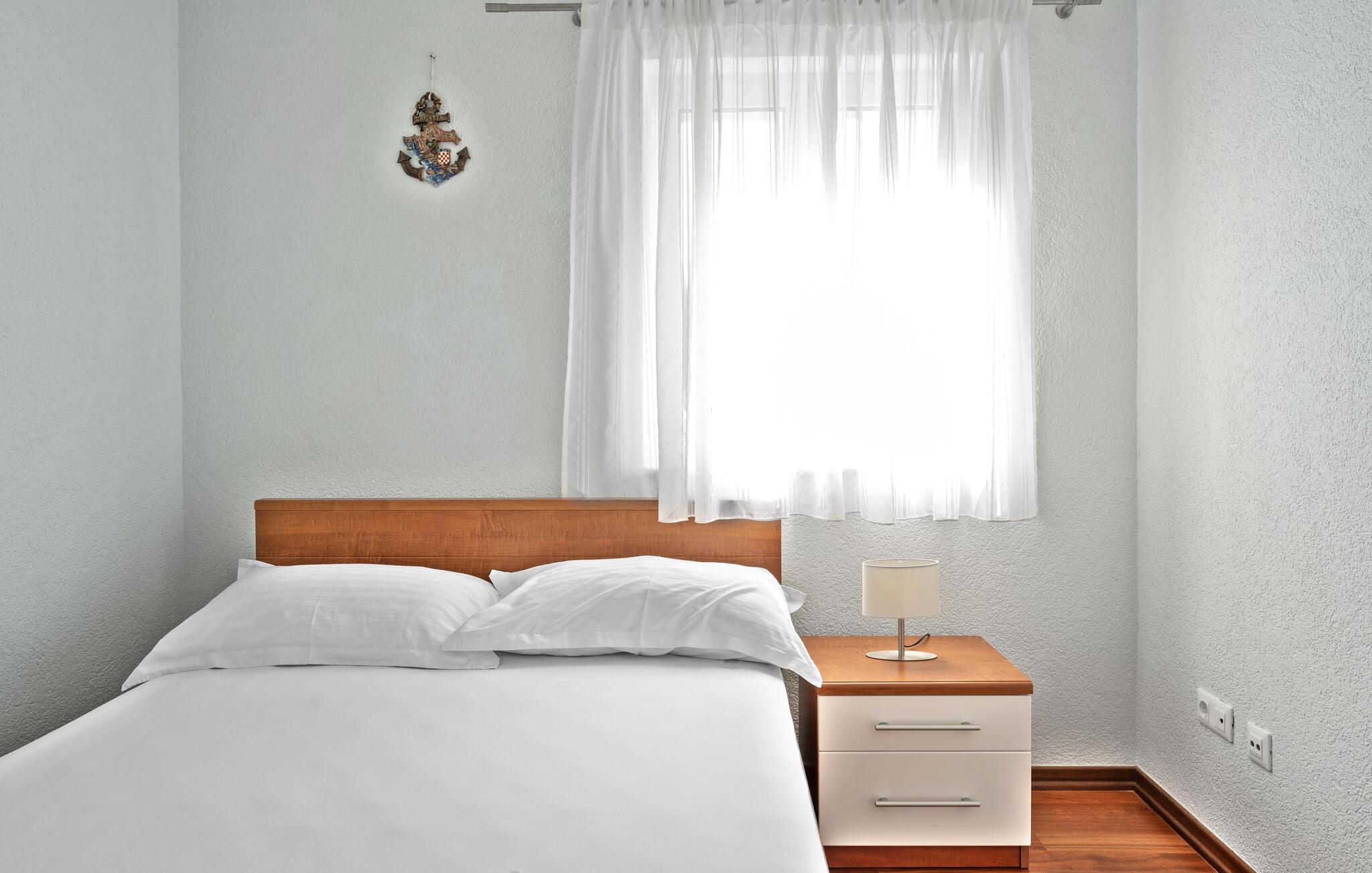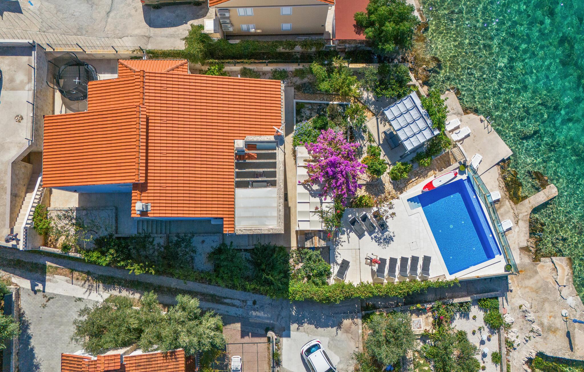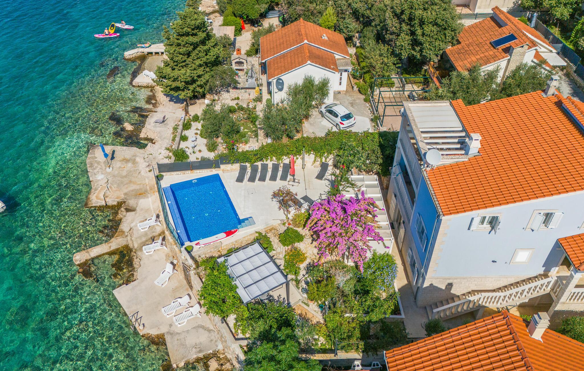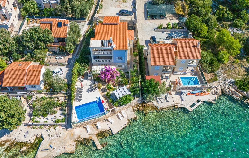 Dyk ned i en autentisk mediterran atmosfære når I nydere jeres sommerferie i dette skønne feriehus med pool i den lille by Kalebova luka i nærheden af Rogoznica. I huset er der tre lejligheder der er forbundet med ydre trapper og I har fælles adgang til terrassen med grill. Der er en skøn børnevenlig kiesstrand i nærheden, mens der lige foran huset er en plateaustrand. Den skønne by Rogoznica ligger på denne halvø, der ikke ligger langt fra Primošten og Šibenik. Besøg naturfænomenerne Drageøjesøen og Frapa, som er en marina der regnes som en af de smukkeste ved Adriaterhavskysten. Vi kan anbefale naturelskere at besøge nationalparkerne Krka og øgruppen Kornati.