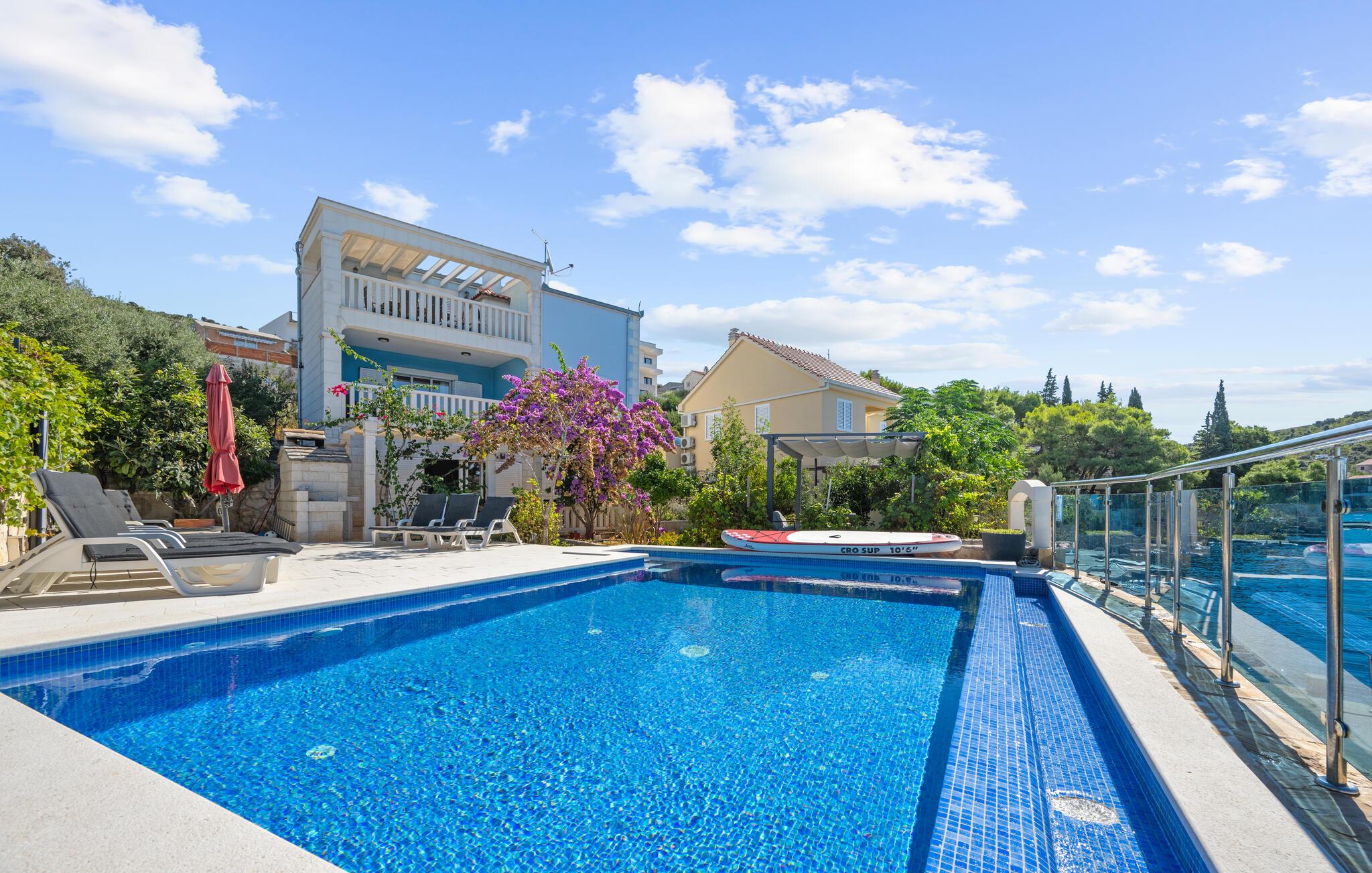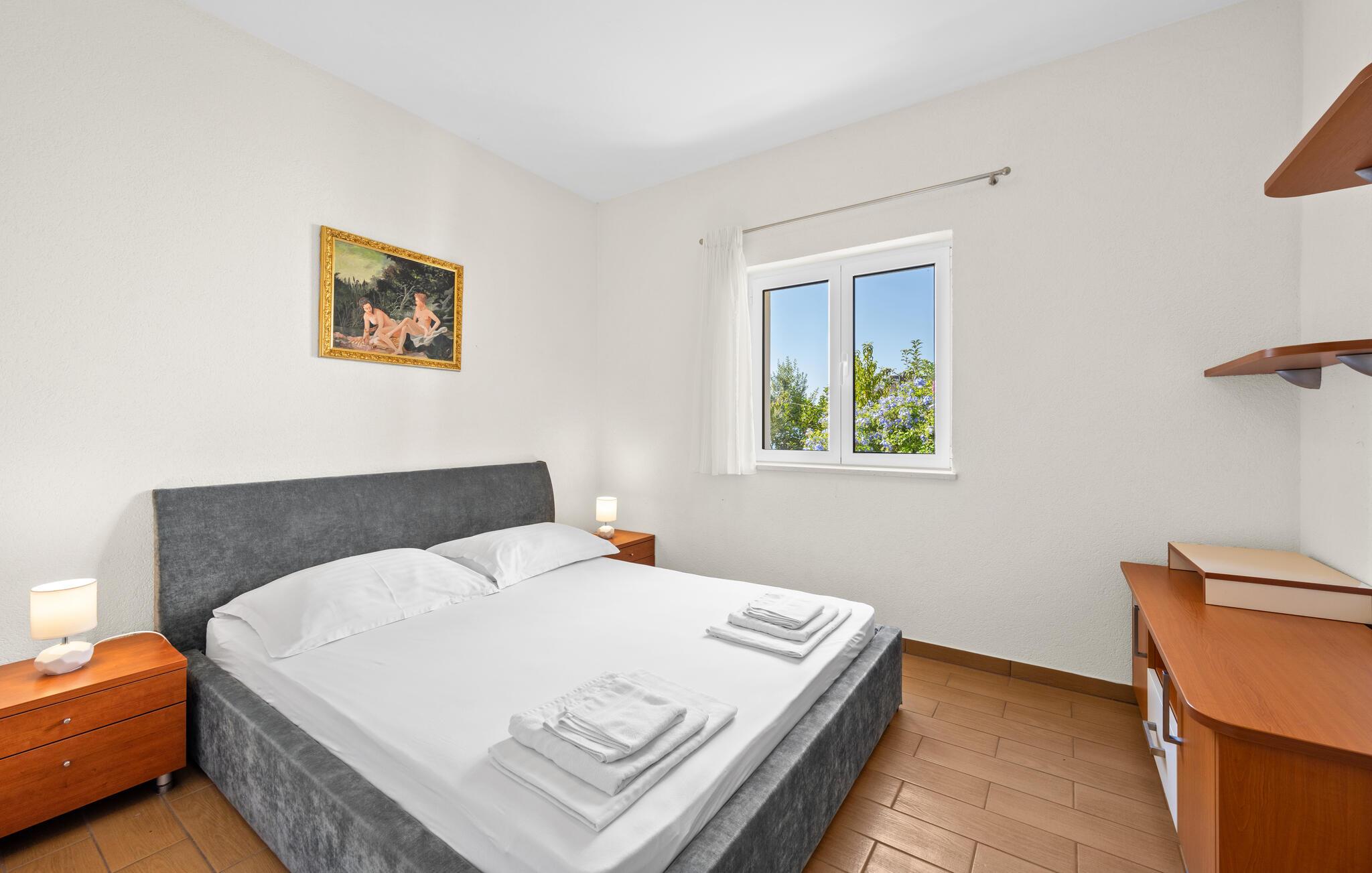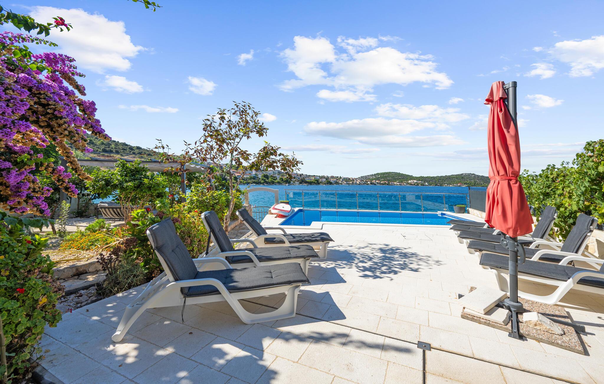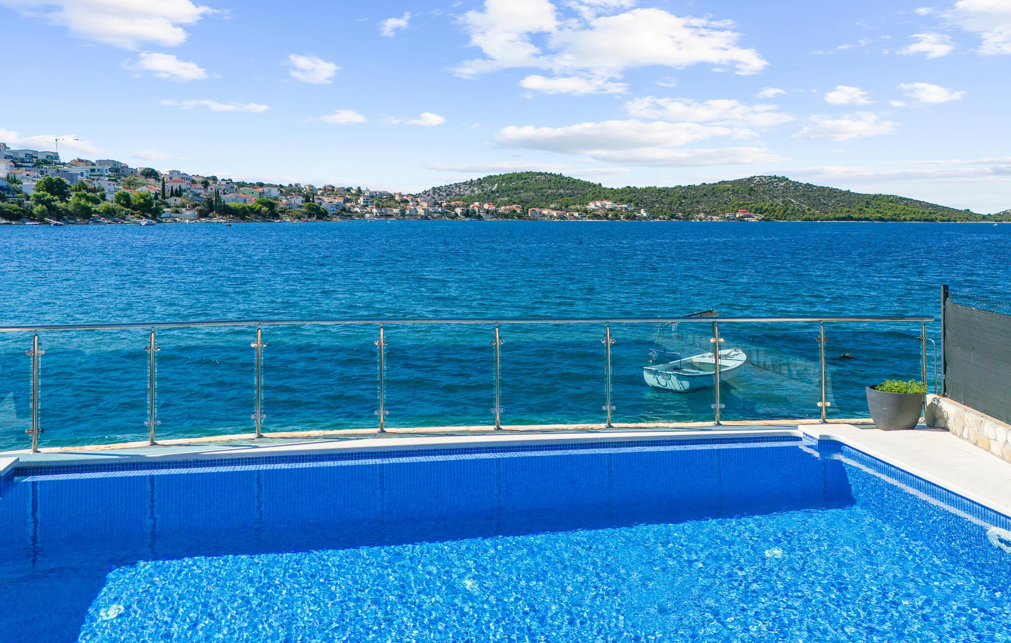 Dyk ned i en autentisk mediterran atmosfære når I nydere jeres sommerferie i dette skønne feriehus med pool i den lille by Kalebova luka i nærheden af Rogoznica. I huset er der tre lejligheder der er forbundet med ydre trapper og I har fælles adgang til terrassen med grill. Der er en skøn børnevenlig kiesstrand i nærheden, mens der lige foran huset er en plateaustrand. Den skønne by Rogoznica ligger på denne halvø, der ikke ligger langt fra Primošten og Šibenik. Besøg naturfænomenerne Drageøjesøen og Frapa, som er en marina der regnes som en af de smukkeste ved Adriaterhavskysten. Vi kan anbefale naturelskere at besøge nationalparkerne Krka og øgruppen Kornati.