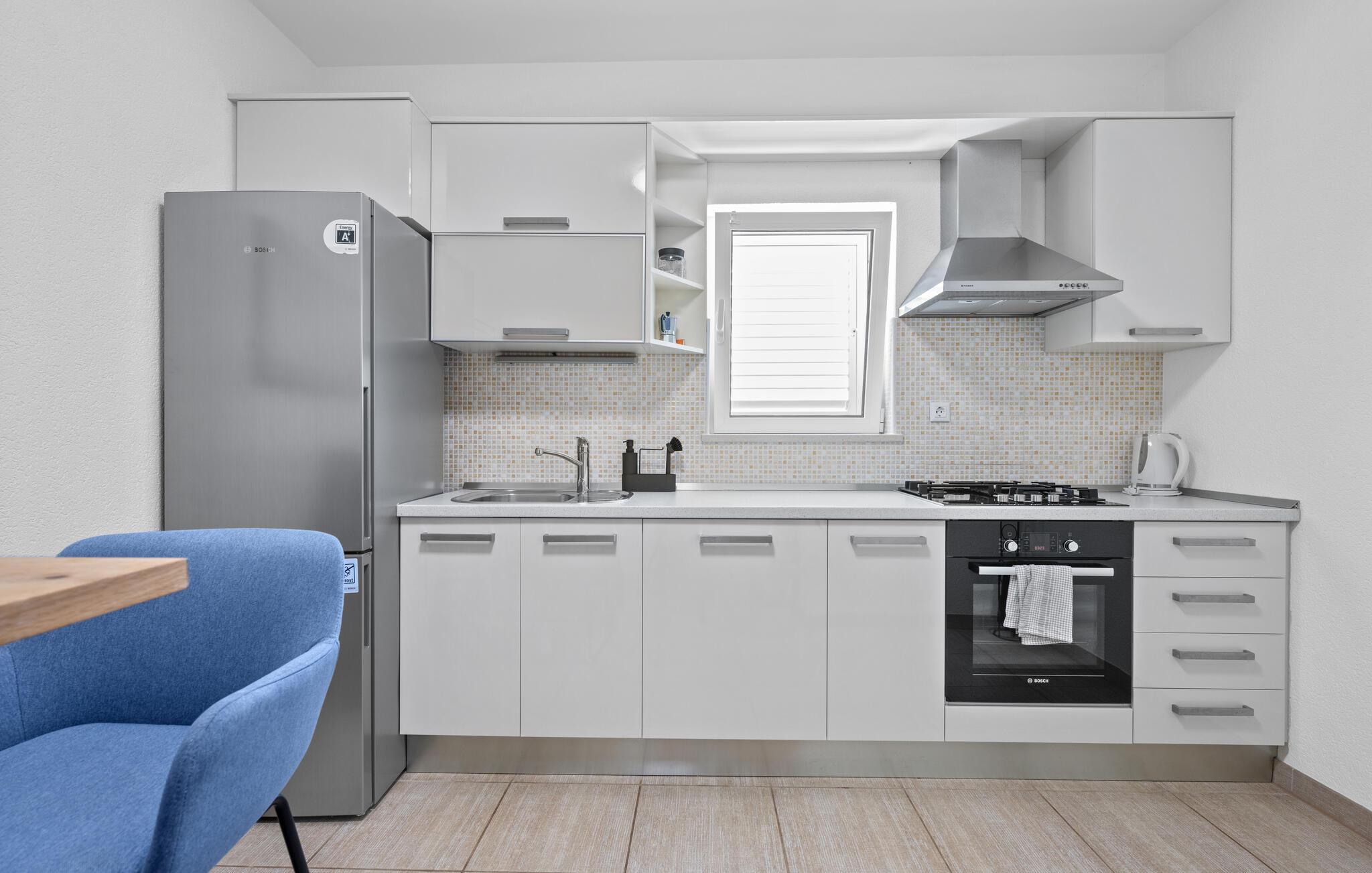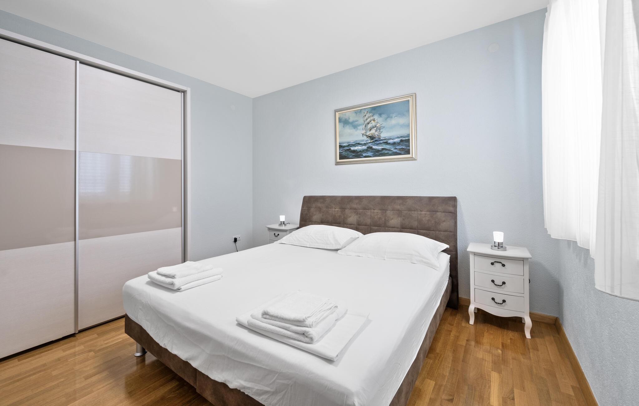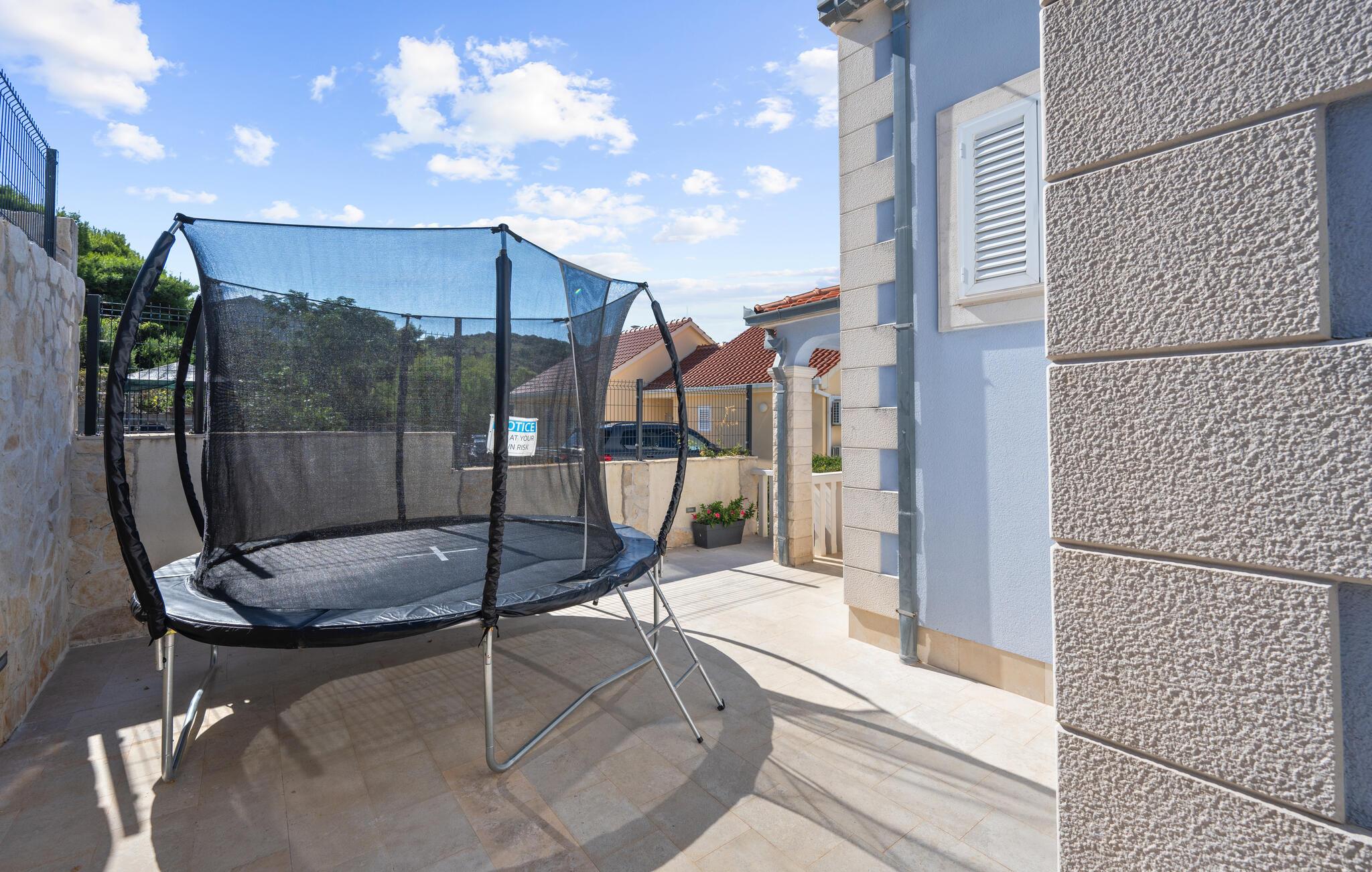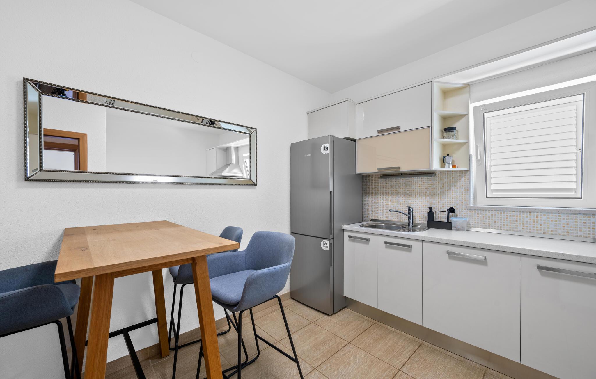 Dyk ned i en autentisk mediterran atmosfære når I nydere jeres sommerferie i dette skønne feriehus med pool i den lille by Kalebova luka i nærheden af Rogoznica. I huset er der tre lejligheder der er forbundet med ydre trapper og I har fælles adgang til terrassen med grill. Der er en skøn børnevenlig kiesstrand i nærheden, mens der lige foran huset er en plateaustrand. Den skønne by Rogoznica ligger på denne halvø, der ikke ligger langt fra Primošten og Šibenik. Besøg naturfænomenerne Drageøjesøen og Frapa, som er en marina der regnes som en af de smukkeste ved Adriaterhavskysten. Vi kan anbefale naturelskere at besøge nationalparkerne Krka og øgruppen Kornati.