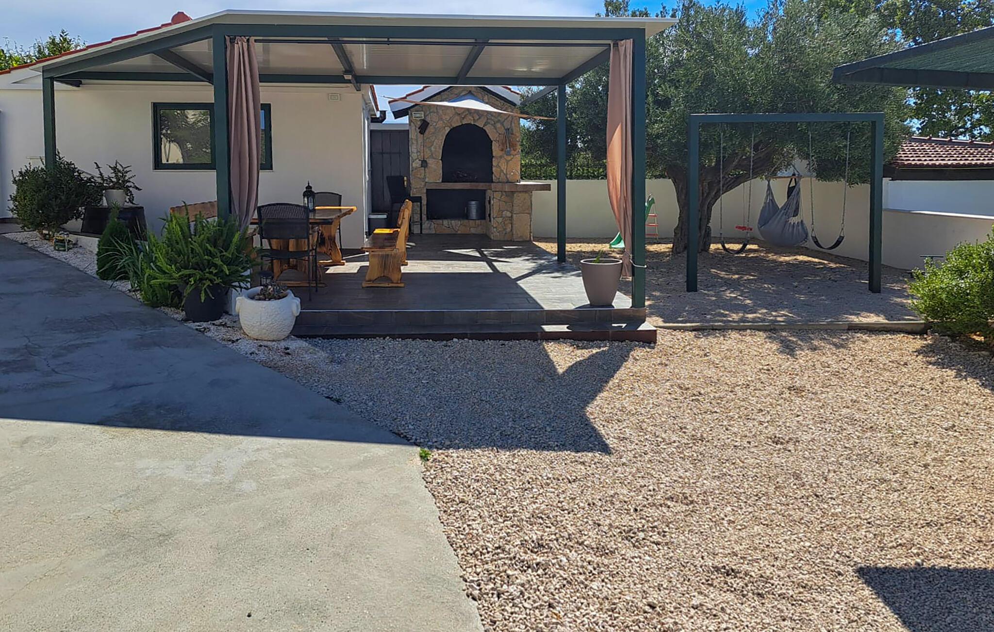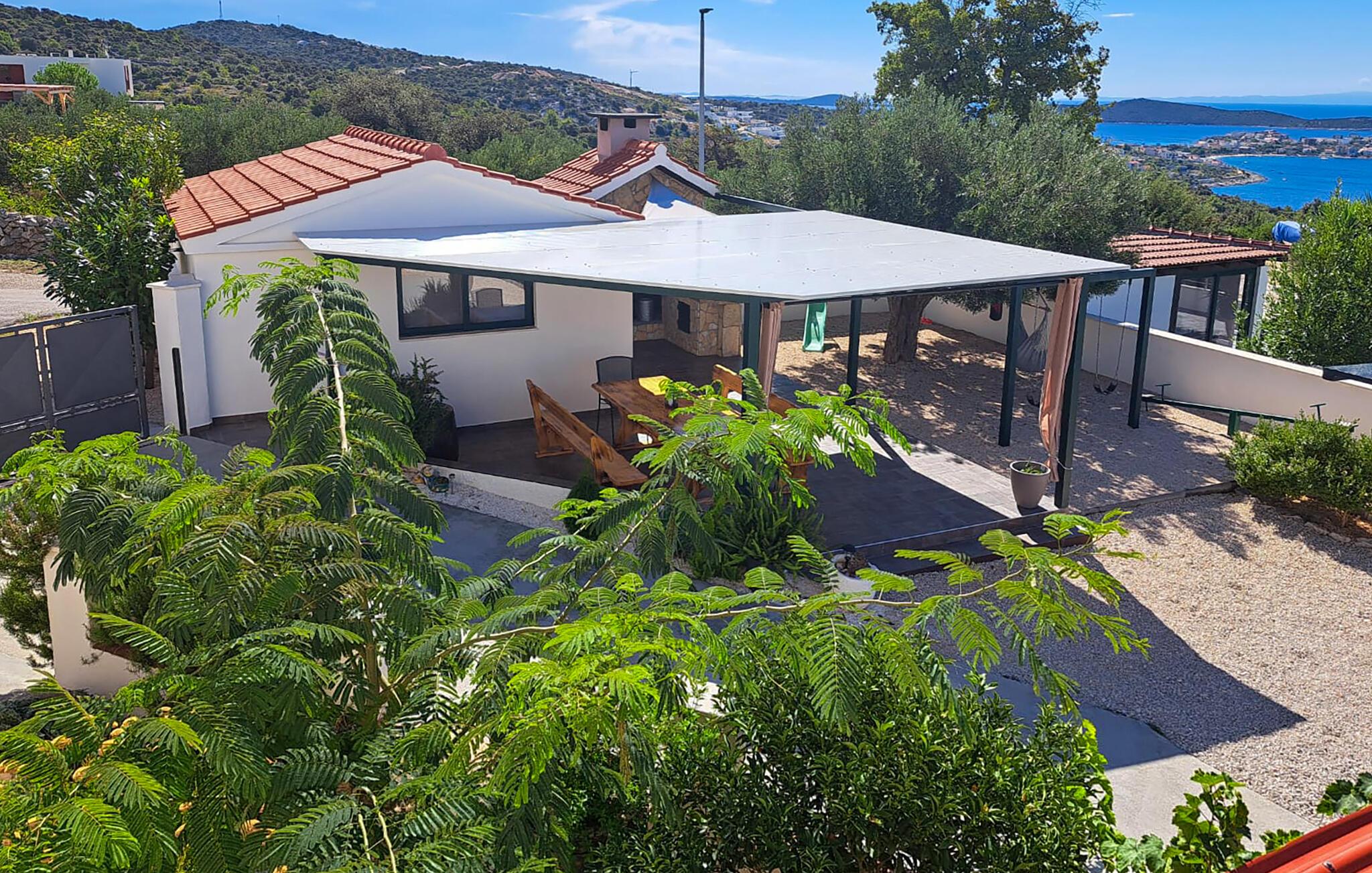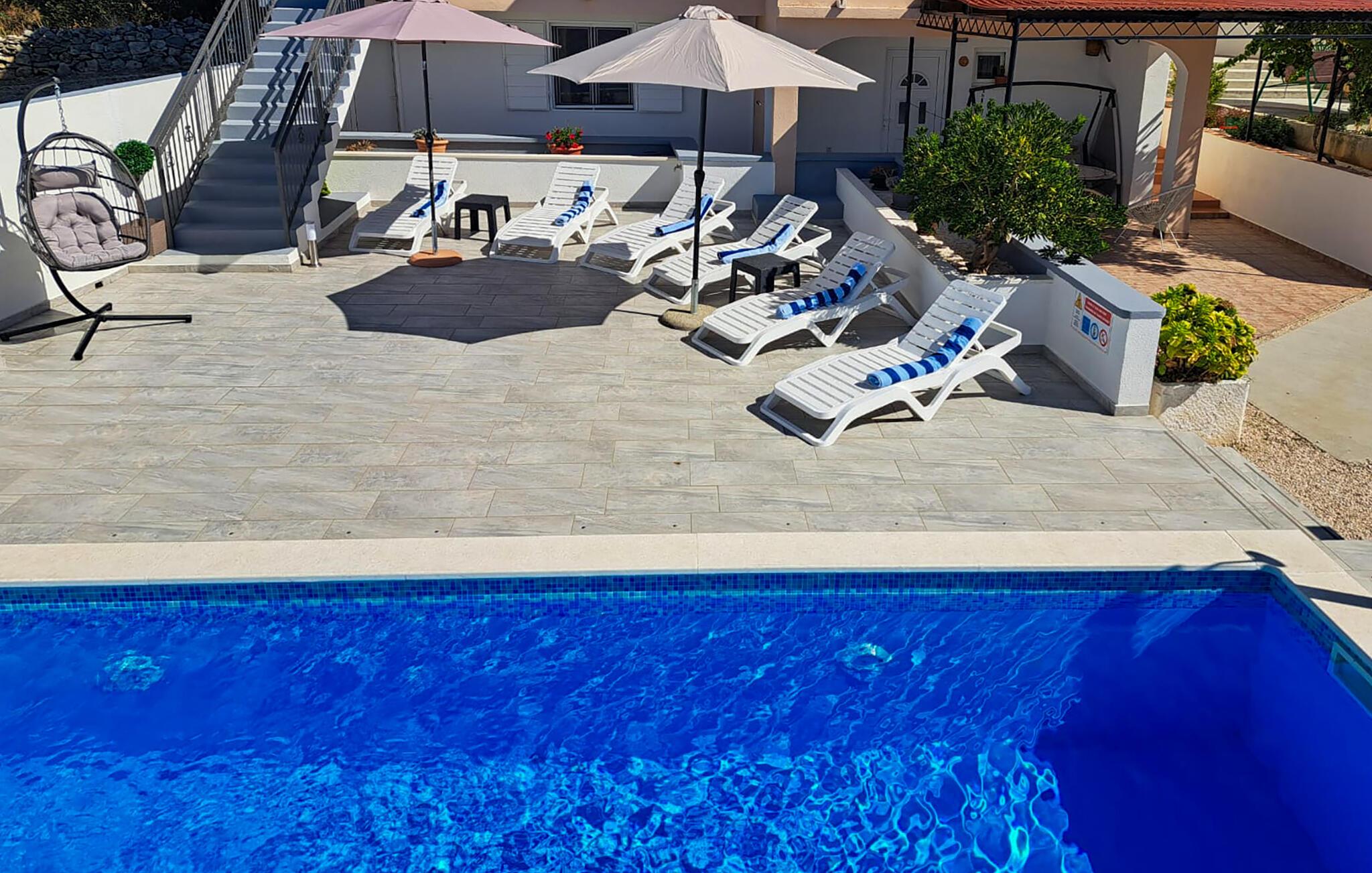 I haven kan I nyde det skønne klima ved den forfriskende pool og tilberede jeres måltider ved grillen. På terrassen kan I drikke morgenkaffe og nyde udsigten over havet, øerne og oliventræerne.