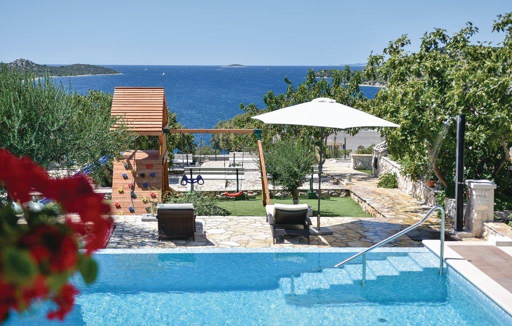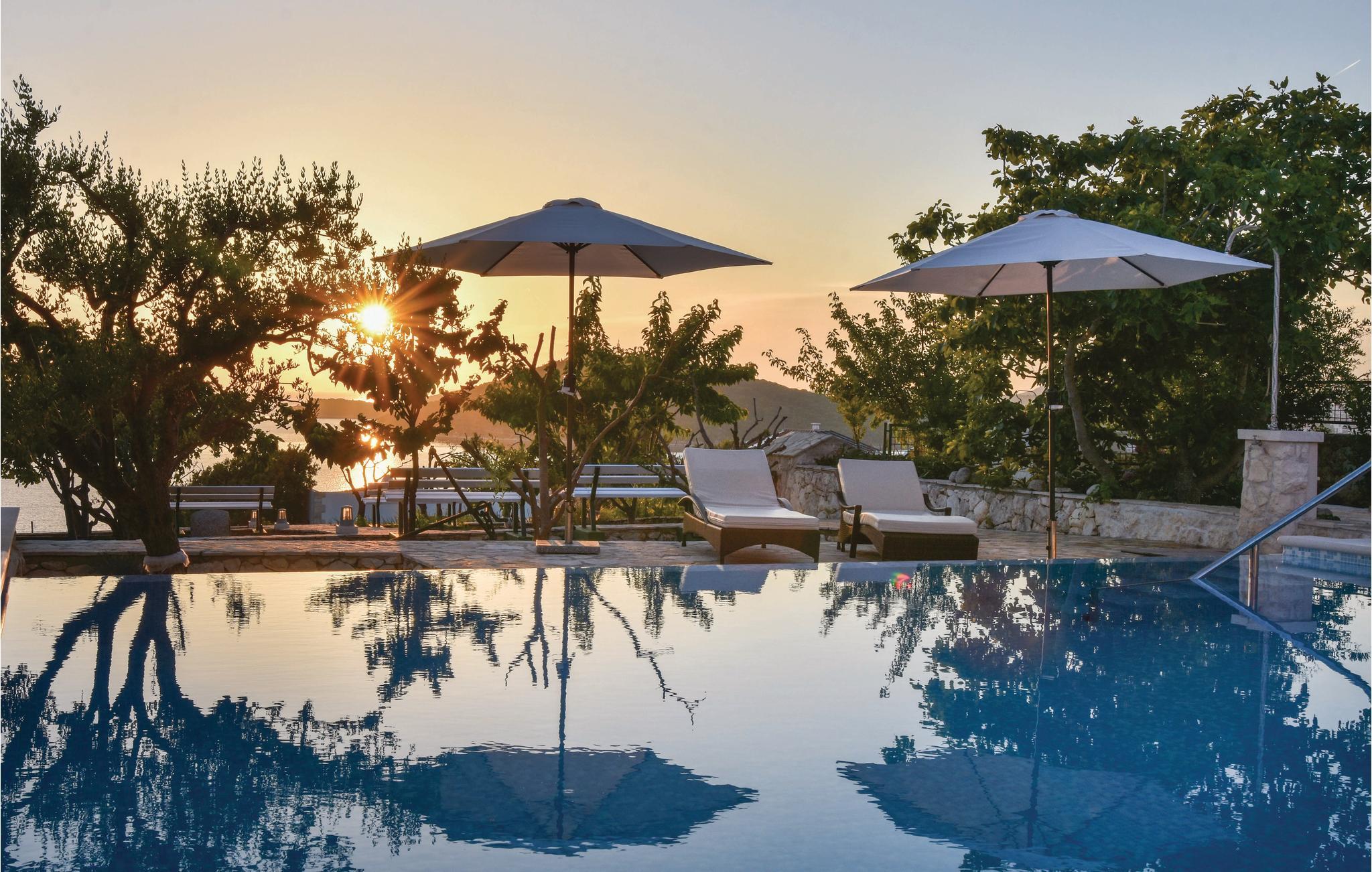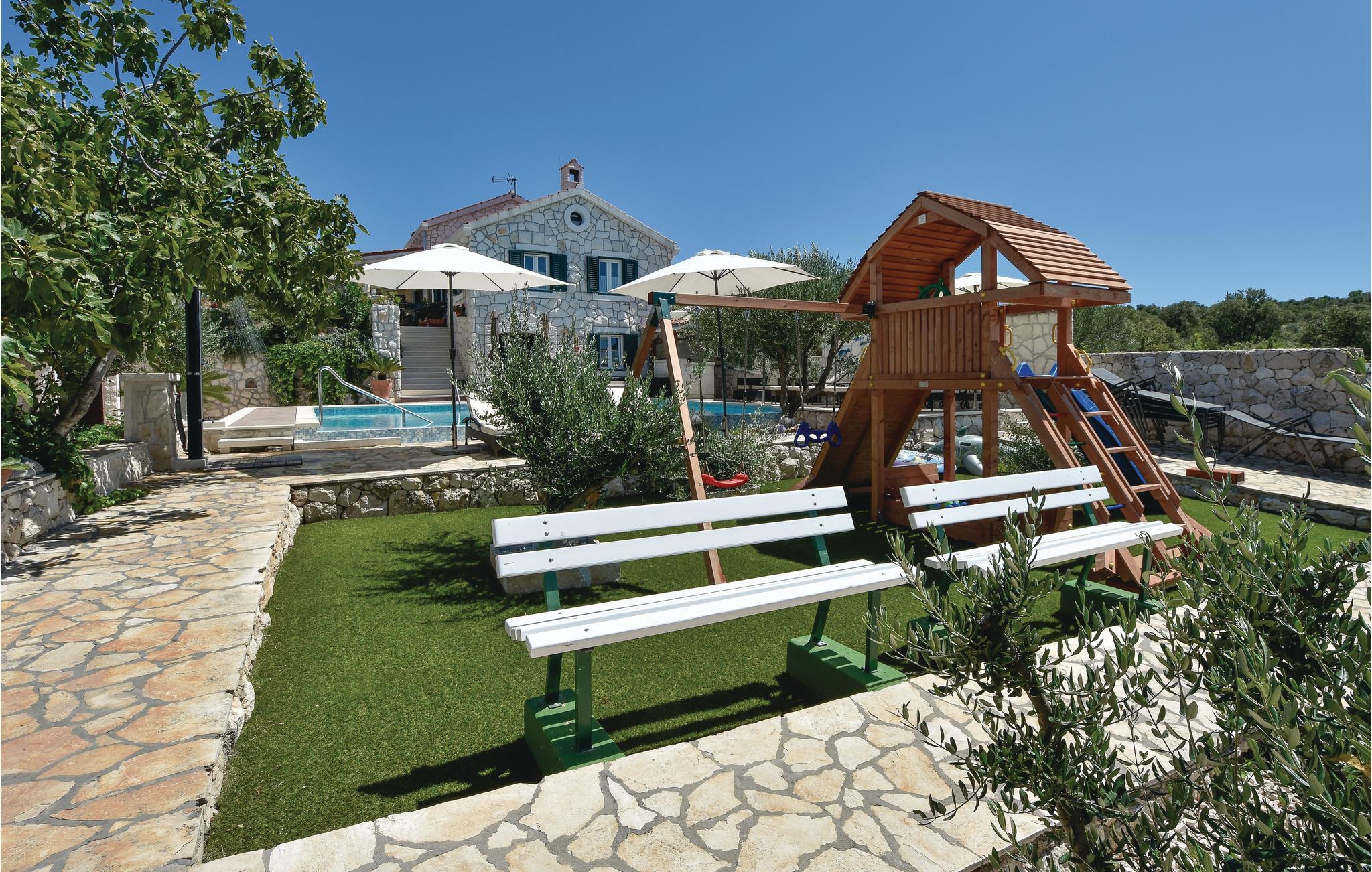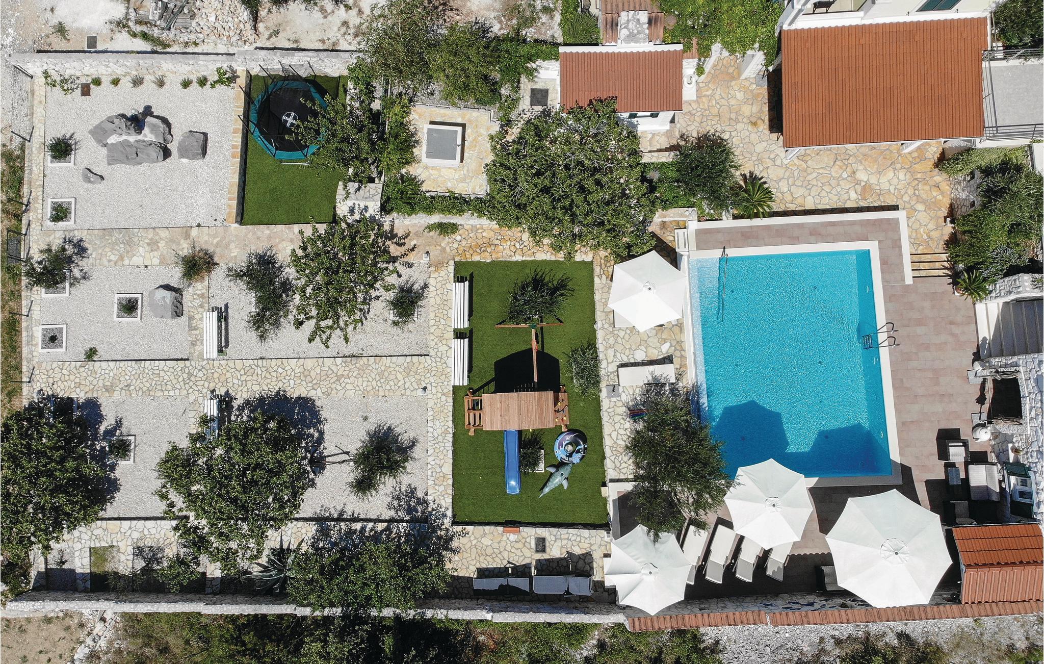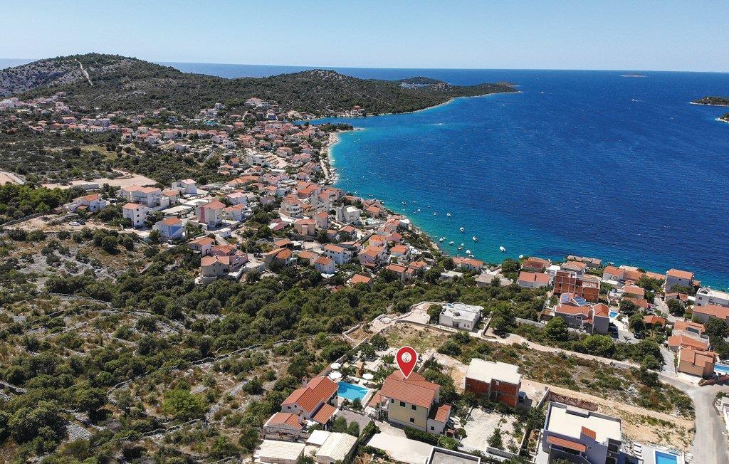 Denne grund med to huse er ideel til en skøn ferie og til den lidt større familiesammenkomst under varme himmelstrøg. I det ene hus er der tre fuldt udstyrede lejligheder, mens der i det andet er indrettet to taverner i dalmatisk stil. Tavernen i stueetagen fungerer som opholdsrum. En stor terrasse med pool ligger foran tavernen i stueetagen og inviterer til dejlige familiestunder med hyggelige måltider, kolde drinks og vandsjov for store og små. Læg jer på en solstol under parasollen og luk øjnene, mens I mærker ferielykken strømme igennem jer. Fra flere terrasser er der en betagende panoramaudsigt over havet. På naturgrunden er der et væld af legeredskaber, som jeres børn kan muntre sig med i løbet af dagen. Tag en pause fra poolen og spring i havet fra klipperne. Lige i nærheden er der desuden stier til vandring og cykling samt mountainbikeruter, der alle fører jer gennem skøn natur.