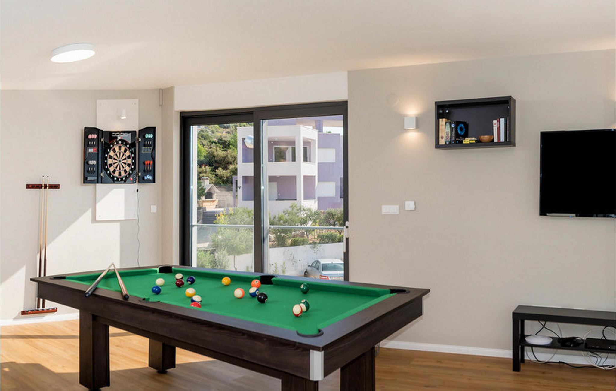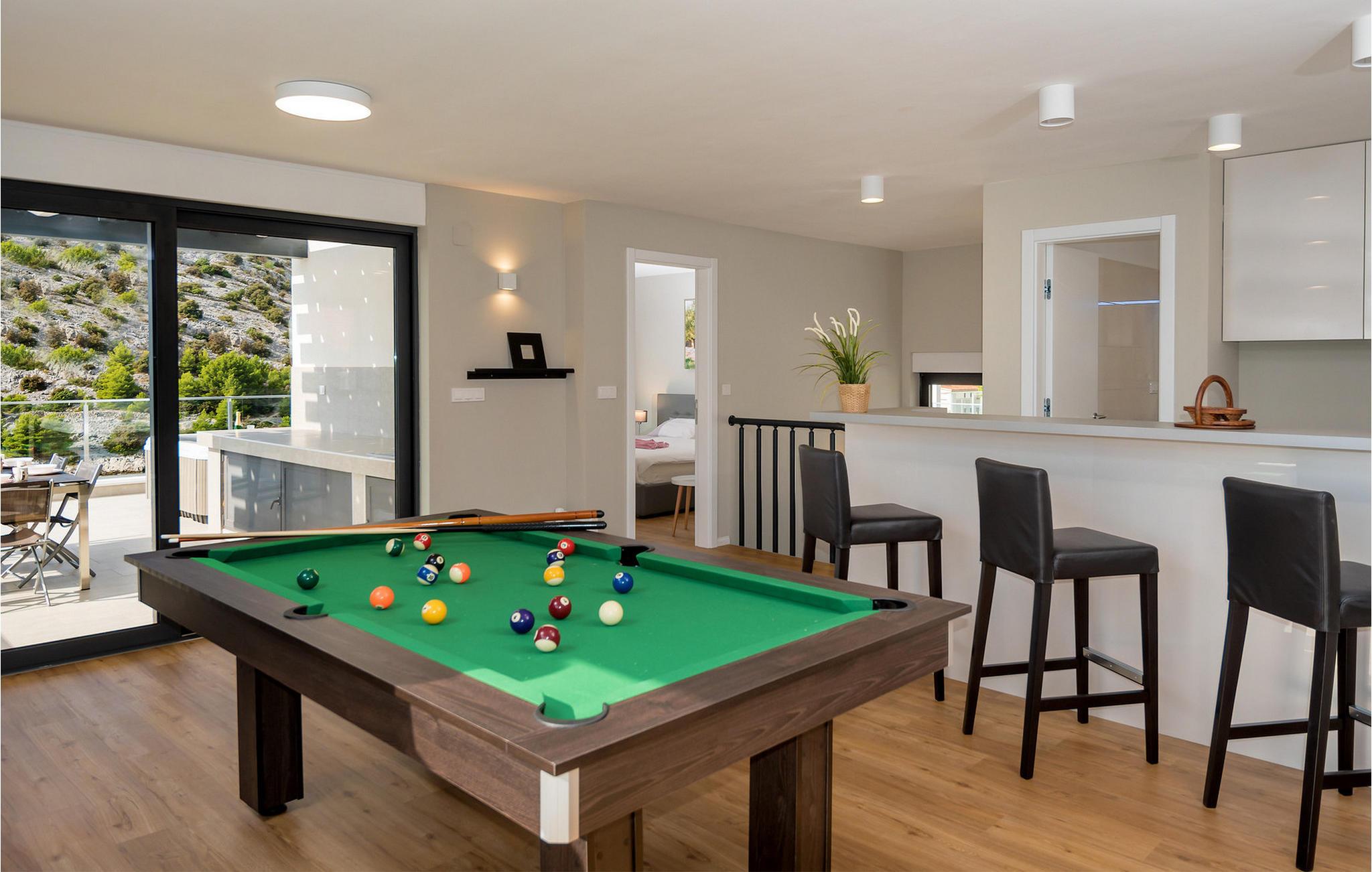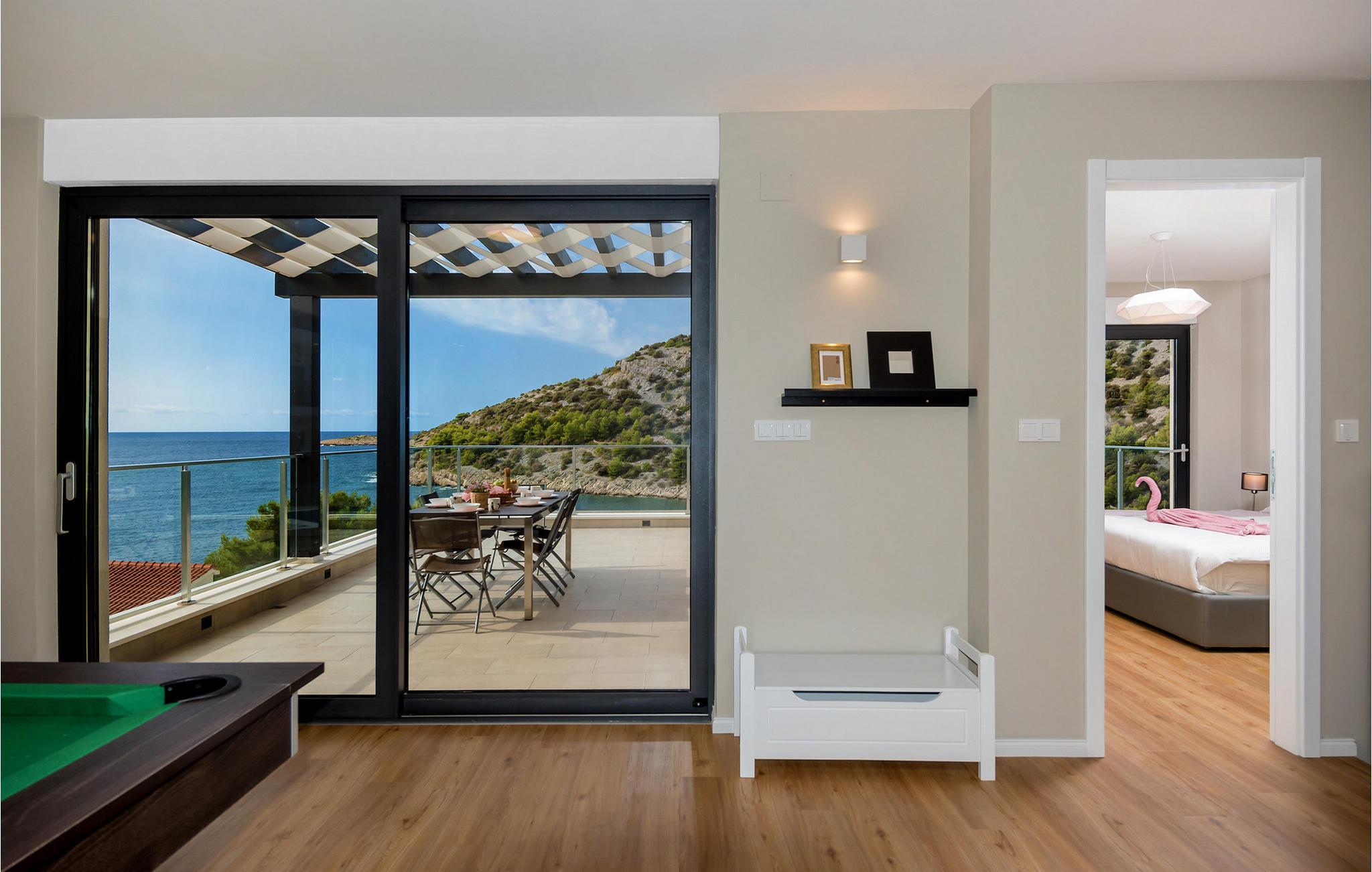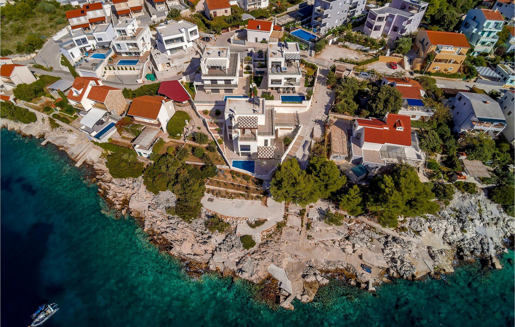 Nyd en betagende udsigt over den maleriske Stivašnica-bugt fra denne stilfulde villa. Den moderne Villa Tatjana er noget særligt med sit lyse design og tilbyder en elegant boligstemning med masser af komfort. Det åbne, fuldt udstyrede køkken med tilstødende spiseplads lægger op til at tilbringe tid sammen, mens den hyggelige stue med pejs skaber en varm atmosfære. Udover flere soveværelser med fantastisk havudsigt tilbyder huset et tiltalende underholdningsprogram. Spil billard, dart eller bordtennis, og hæng ud i de smukt indrettede stuer. På den rummelige terrasse, i den opvarmede pool eller i spabadet på tagterrassen - her finder I adskillige steder til afslapning og mindesmærker. Hvis I foretrækker at svømme i havet, kan I blot tage til stranden foran villaen og nyde en forfriskende dukkert i fuldstændig privatliv. Området omkring Ražanj er et paradis for naturelskere og aktive feriegæster. Tag på vandreture langs kysten eller udforsk den fascinerende undervandsverden, mens I dykker. De nærliggende byer Rogoznica og Primošten lokker med historiske gader, traditionelle restauranter og charmerende havne. Dagsture til Krka Nationalpark eller den UNESCO-beskyttede by Trogir er også et besøg værd og tilbyder fascinerende indblik i dalmatisk kultur og natur. Bemærk venligst: Ejendommen accepterer ikke ungdomsgrupper under 30 år eller polterabender. Bookinger fra sådanne grupper vil blive afvist, selv ved ankomst eller under opholdet, uden refusion.