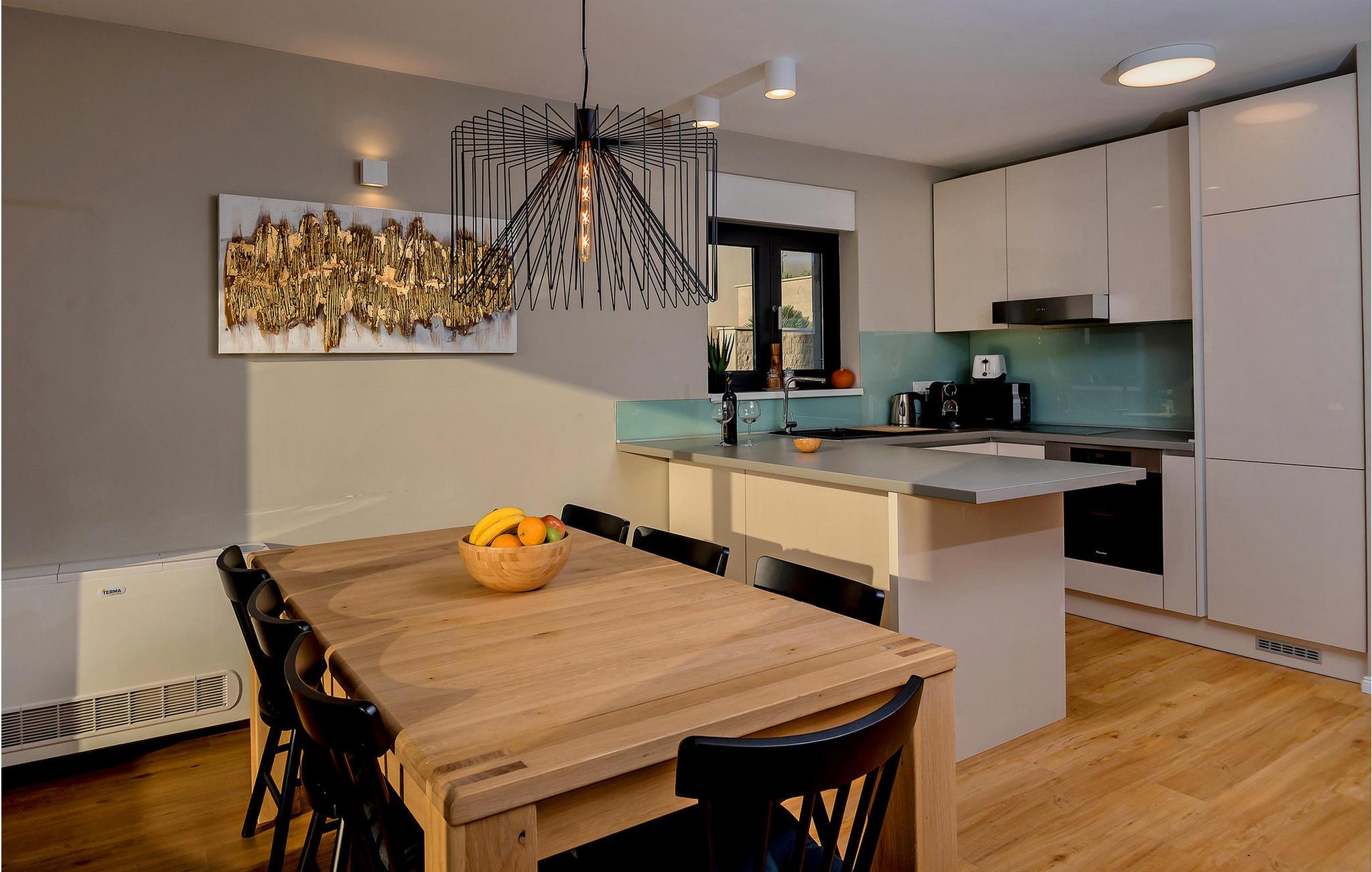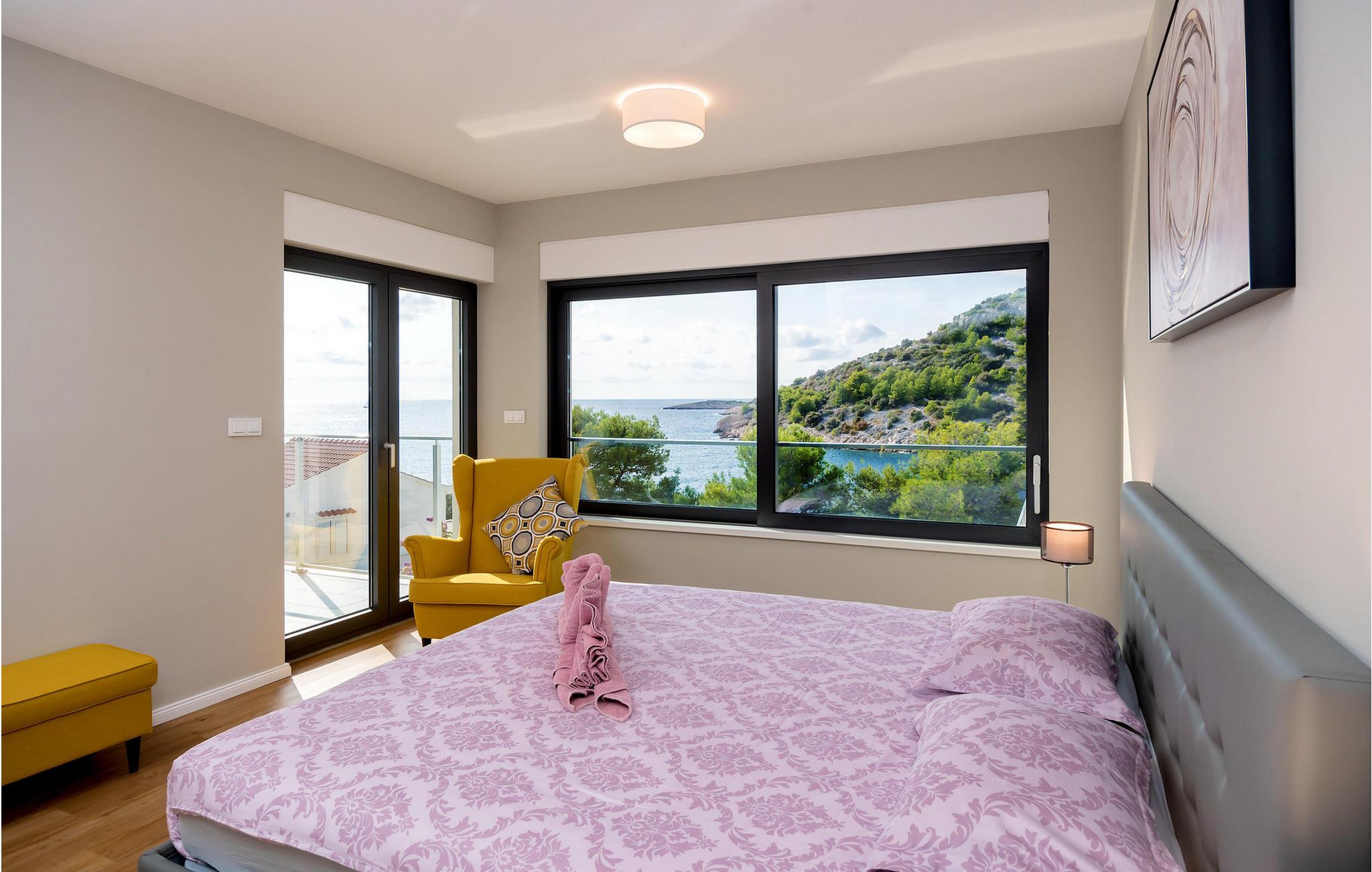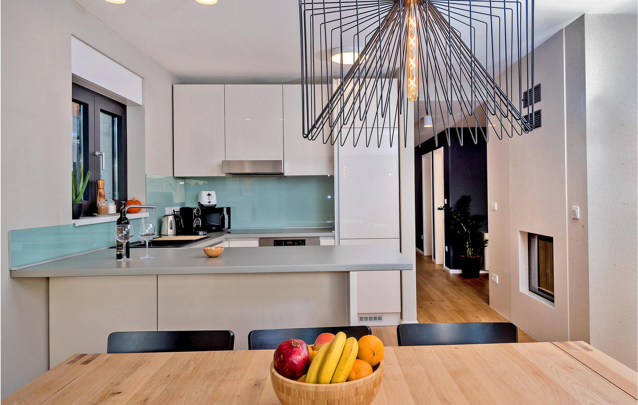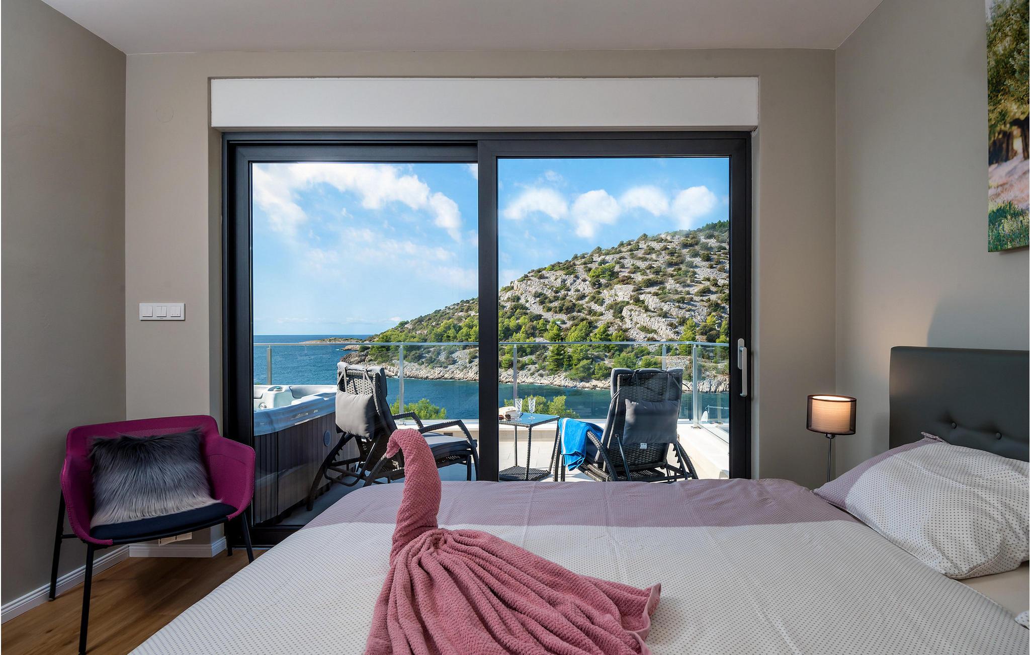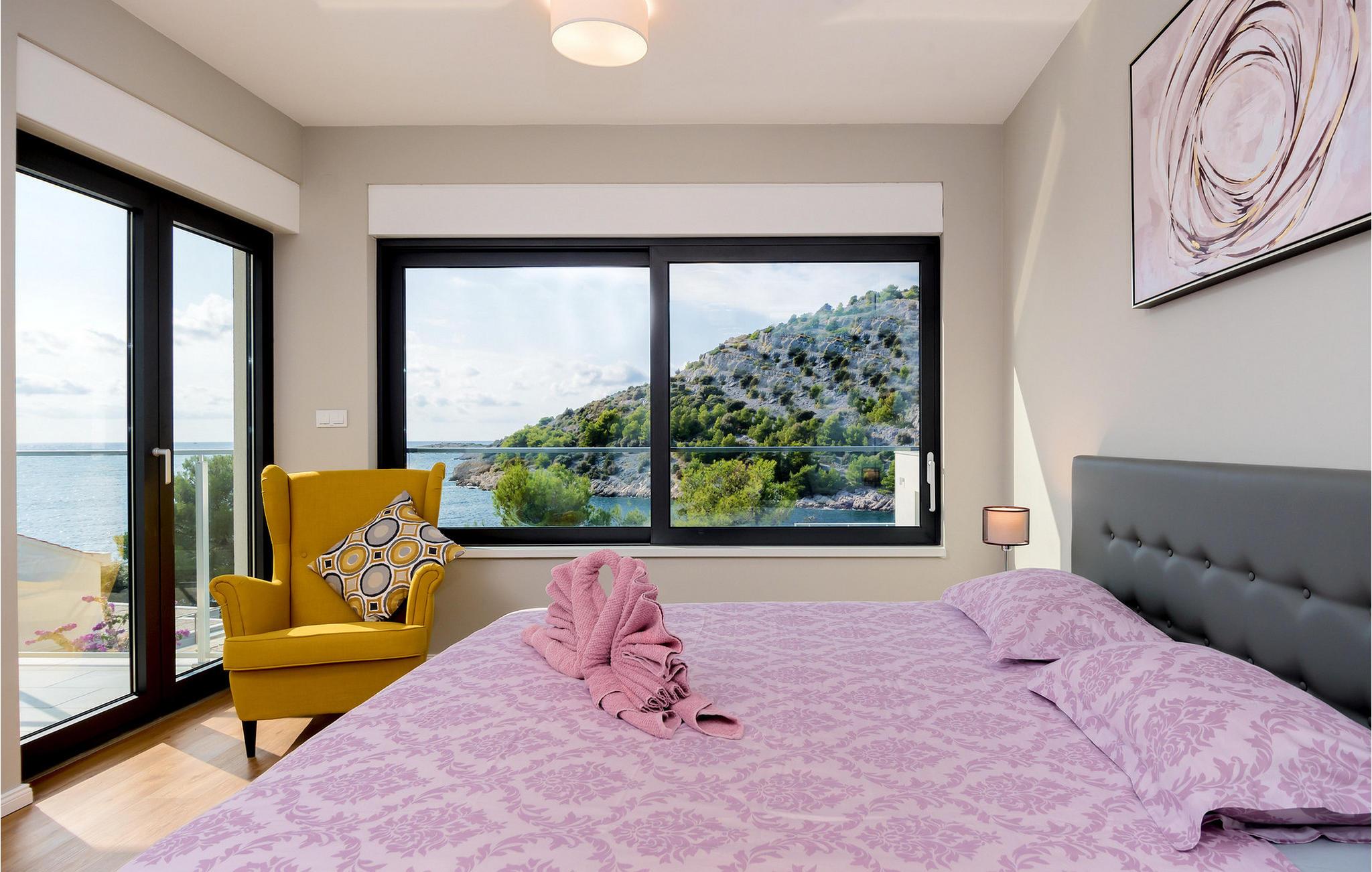 Nyd en betagende udsigt over den maleriske Stivašnica-bugt fra denne stilfulde villa. Den moderne Villa Tatjana er noget særligt med sit lyse design og tilbyder en elegant boligstemning med masser af komfort. Det åbne, fuldt udstyrede køkken med tilstødende spiseplads lægger op til at tilbringe tid sammen, mens den hyggelige stue med pejs skaber en varm atmosfære. Udover flere soveværelser med fantastisk havudsigt tilbyder huset et tiltalende underholdningsprogram. Spil billard, dart eller bordtennis, og hæng ud i de smukt indrettede stuer. På den rummelige terrasse, i den opvarmede pool eller i spabadet på tagterrassen - her finder I adskillige steder til afslapning og mindesmærker. Hvis I foretrækker at svømme i havet, kan I blot tage til stranden foran villaen og nyde en forfriskende dukkert i fuldstændig privatliv. Området omkring Ražanj er et paradis for naturelskere og aktive feriegæster. Tag på vandreture langs kysten eller udforsk den fascinerende undervandsverden, mens I dykker. De nærliggende byer Rogoznica og Primošten lokker med historiske gader, traditionelle restauranter og charmerende havne. Dagsture til Krka Nationalpark eller den UNESCO-beskyttede by Trogir er også et besøg værd og tilbyder fascinerende indblik i dalmatisk kultur og natur. Bemærk venligst: Ejendommen accepterer ikke ungdomsgrupper under 30 år eller polterabender. Bookinger fra sådanne grupper vil blive afvist, selv ved ankomst eller under opholdet, uden refusion.