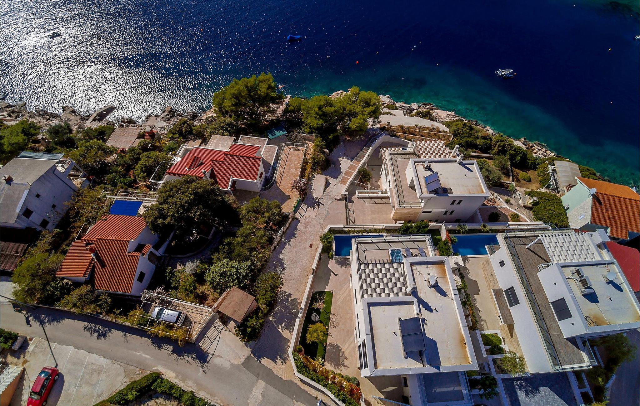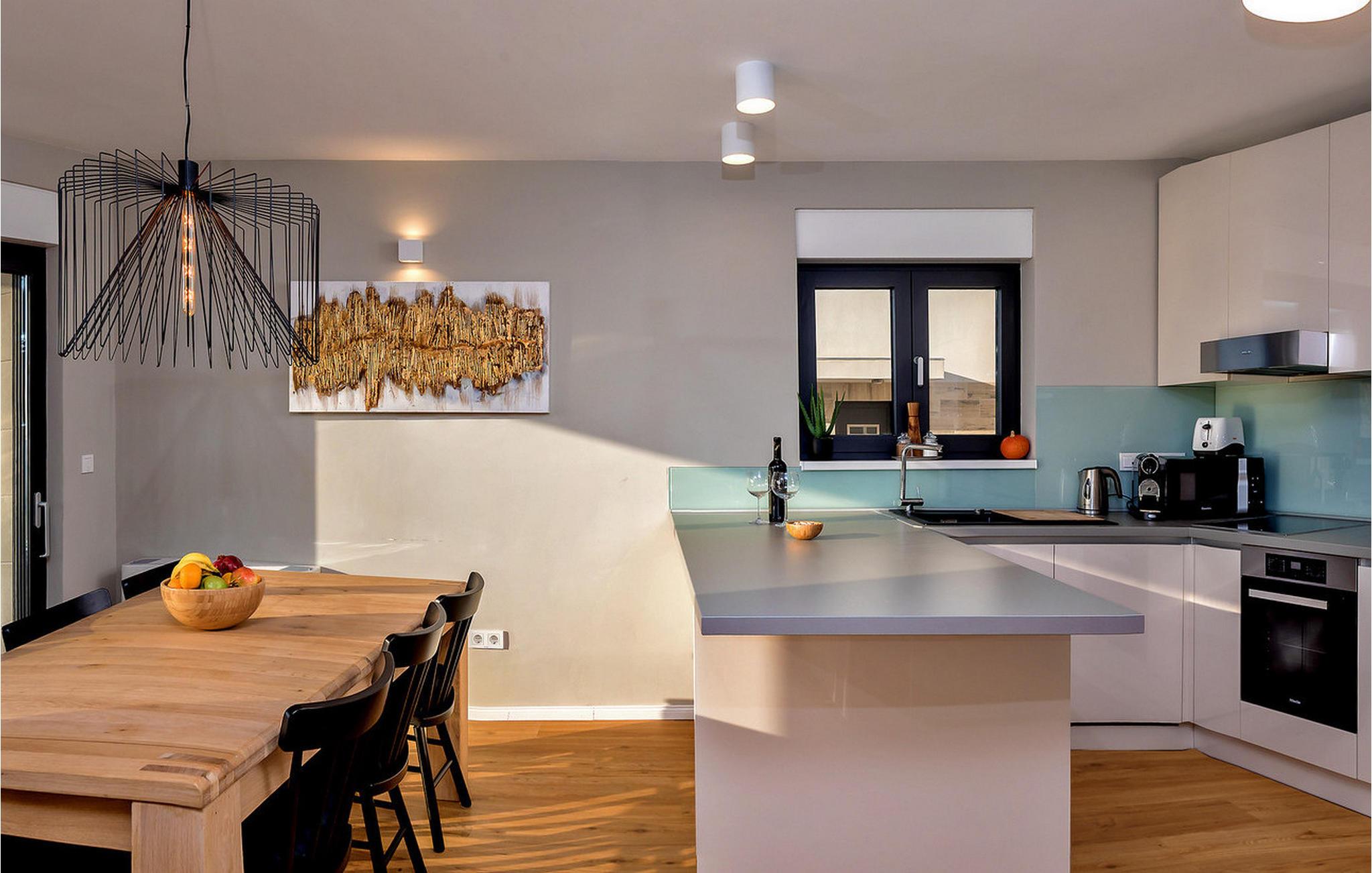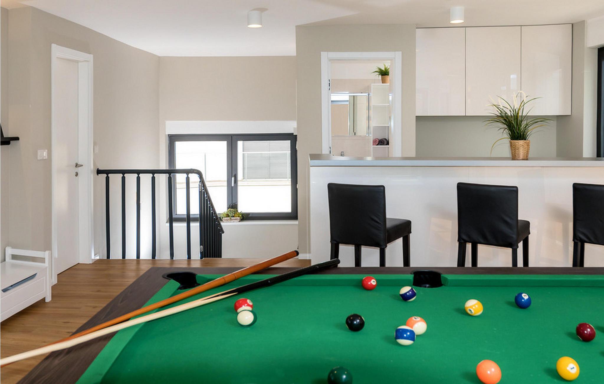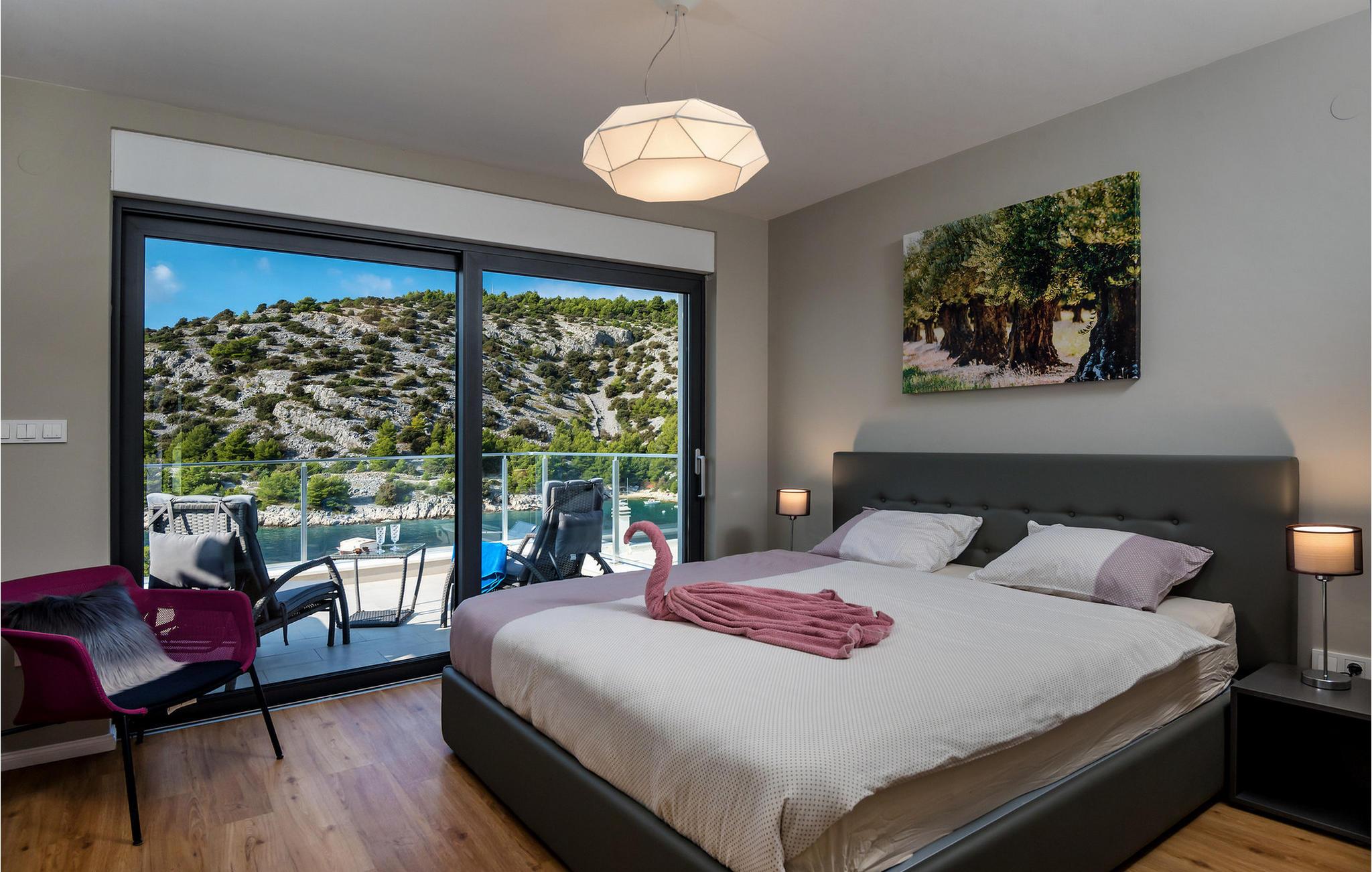 Nyd en betagende udsigt over den maleriske Stivašnica-bugt fra denne stilfulde villa. Den moderne Villa Tatjana er noget særligt med sit lyse design og tilbyder en elegant boligstemning med masser af komfort. Det åbne, fuldt udstyrede køkken med tilstødende spiseplads lægger op til at tilbringe tid sammen, mens den hyggelige stue med pejs skaber en varm atmosfære. Udover flere soveværelser med fantastisk havudsigt tilbyder huset et tiltalende underholdningsprogram. Spil billard, dart eller bordtennis, og hæng ud i de smukt indrettede stuer. På den rummelige terrasse, i den opvarmede pool eller i spabadet på tagterrassen - her finder I adskillige steder til afslapning og mindesmærker. Hvis I foretrækker at svømme i havet, kan I blot tage til stranden foran villaen og nyde en forfriskende dukkert i fuldstændig privatliv. Området omkring Ražanj er et paradis for naturelskere og aktive feriegæster. Tag på vandreture langs kysten eller udforsk den fascinerende undervandsverden, mens I dykker. De nærliggende byer Rogoznica og Primošten lokker med historiske gader, traditionelle restauranter og charmerende havne. Dagsture til Krka Nationalpark eller den UNESCO-beskyttede by Trogir er også et besøg værd og tilbyder fascinerende indblik i dalmatisk kultur og natur. Bemærk venligst: Ejendommen accepterer ikke ungdomsgrupper under 30 år eller polterabender. Bookinger fra sådanne grupper vil blive afvist, selv ved ankomst eller under opholdet, uden refusion.