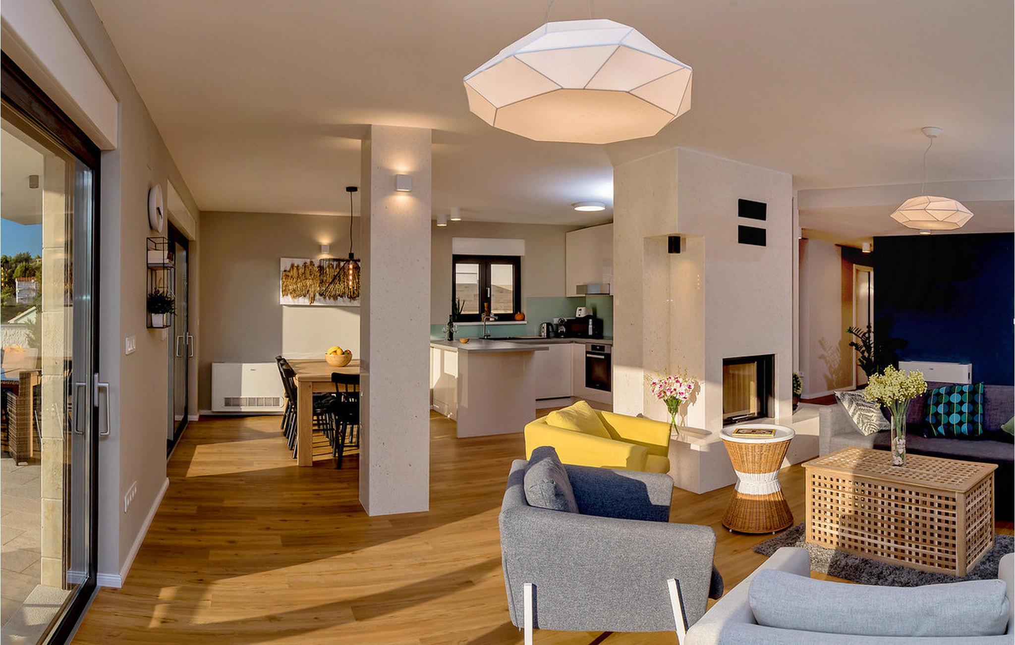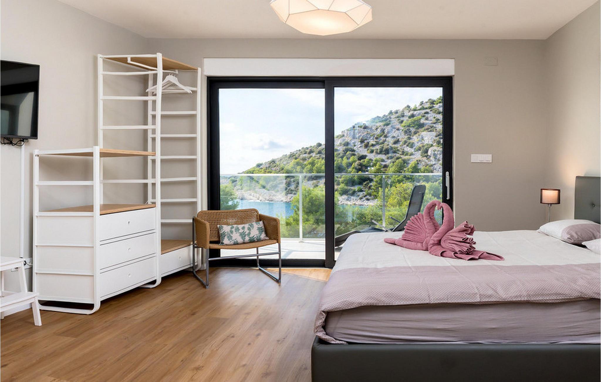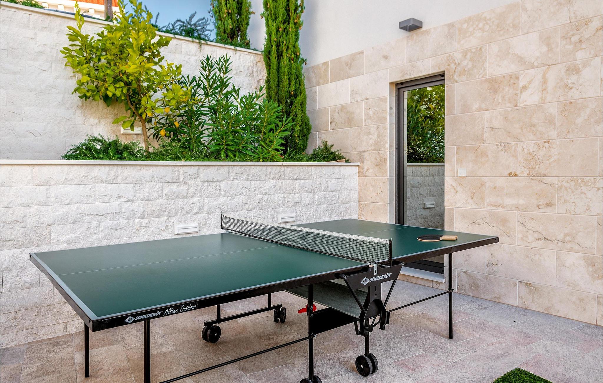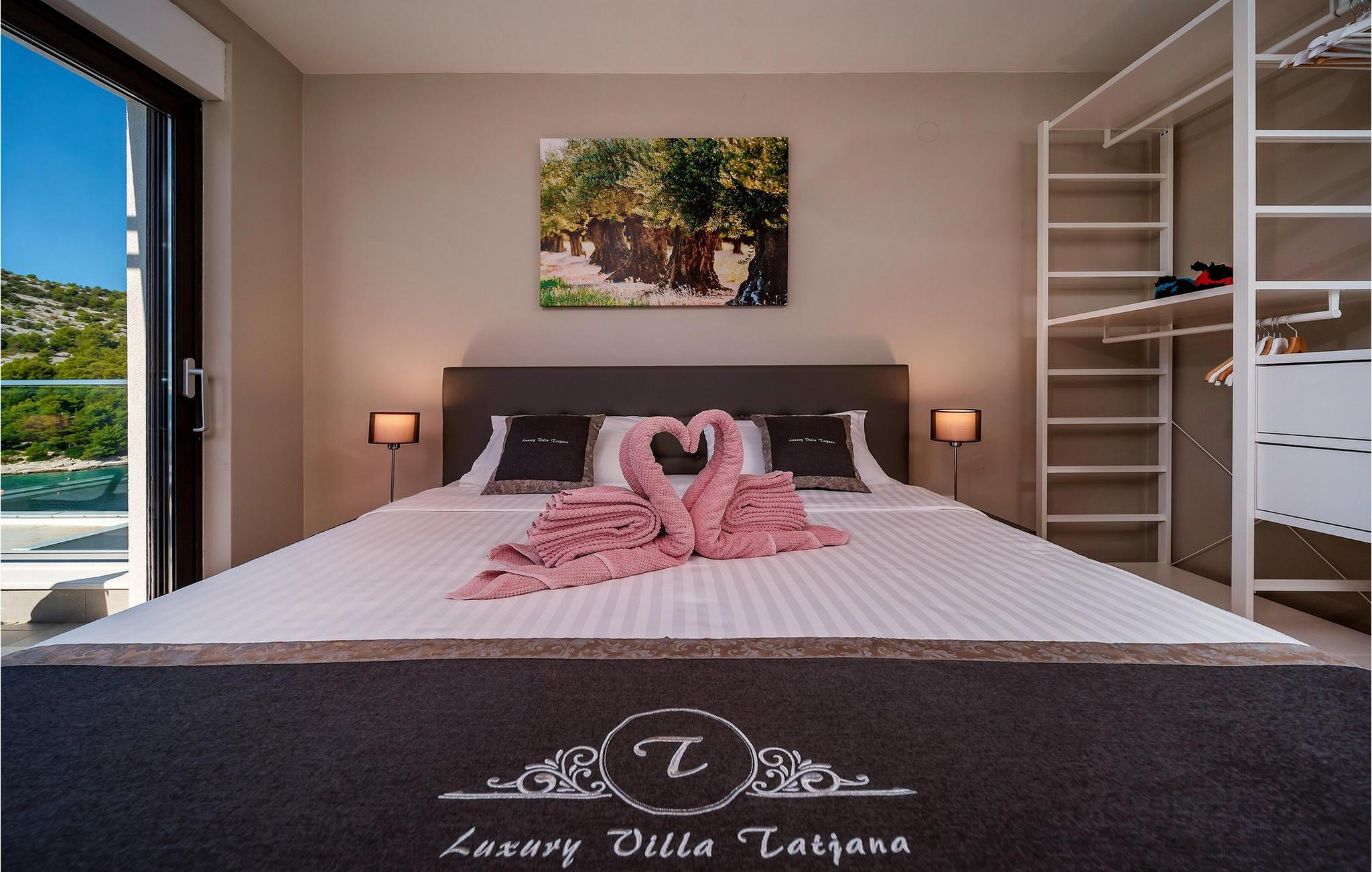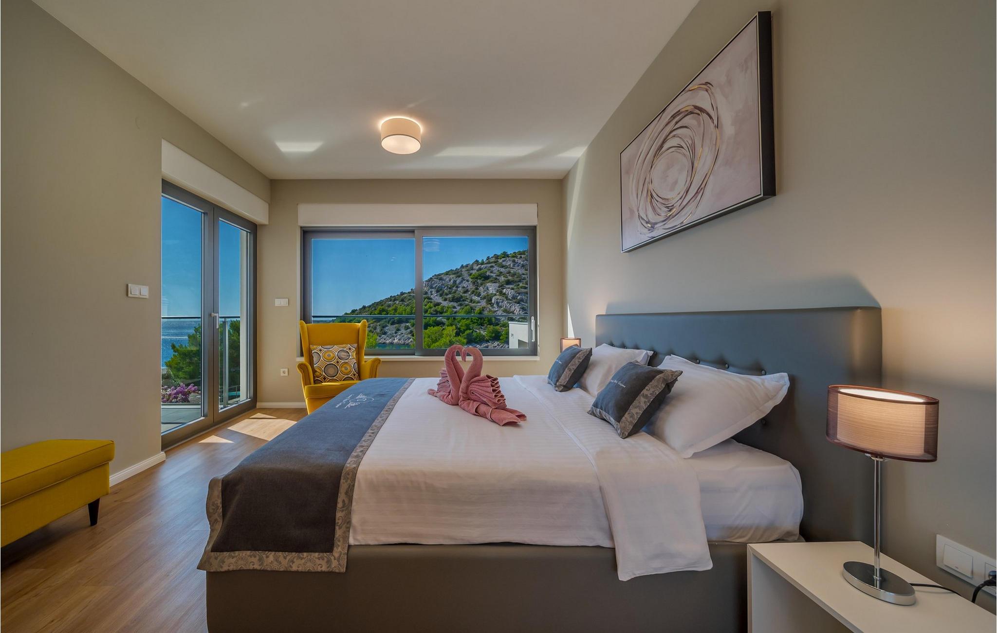 Nyd en betagende udsigt over den maleriske Stivašnica-bugt fra denne stilfulde villa. Den moderne Villa Tatjana er noget særligt med sit lyse design og tilbyder en elegant boligstemning med masser af komfort. Det åbne, fuldt udstyrede køkken med tilstødende spiseplads lægger op til at tilbringe tid sammen, mens den hyggelige stue med pejs skaber en varm atmosfære. Udover flere soveværelser med fantastisk havudsigt tilbyder huset et tiltalende underholdningsprogram. Spil billard, dart eller bordtennis, og hæng ud i de smukt indrettede stuer. På den rummelige terrasse, i den opvarmede pool eller i spabadet på tagterrassen - her finder I adskillige steder til afslapning og mindesmærker. Hvis I foretrækker at svømme i havet, kan I blot tage til stranden foran villaen og nyde en forfriskende dukkert i fuldstændig privatliv. Området omkring Ražanj er et paradis for naturelskere og aktive feriegæster. Tag på vandreture langs kysten eller udforsk den fascinerende undervandsverden, mens I dykker. De nærliggende byer Rogoznica og Primošten lokker med historiske gader, traditionelle restauranter og charmerende havne. Dagsture til Krka Nationalpark eller den UNESCO-beskyttede by Trogir er også et besøg værd og tilbyder fascinerende indblik i dalmatisk kultur og natur. Bemærk venligst: Ejendommen accepterer ikke ungdomsgrupper under 30 år eller polterabender. Bookinger fra sådanne grupper vil blive afvist, selv ved ankomst eller under opholdet, uden refusion.