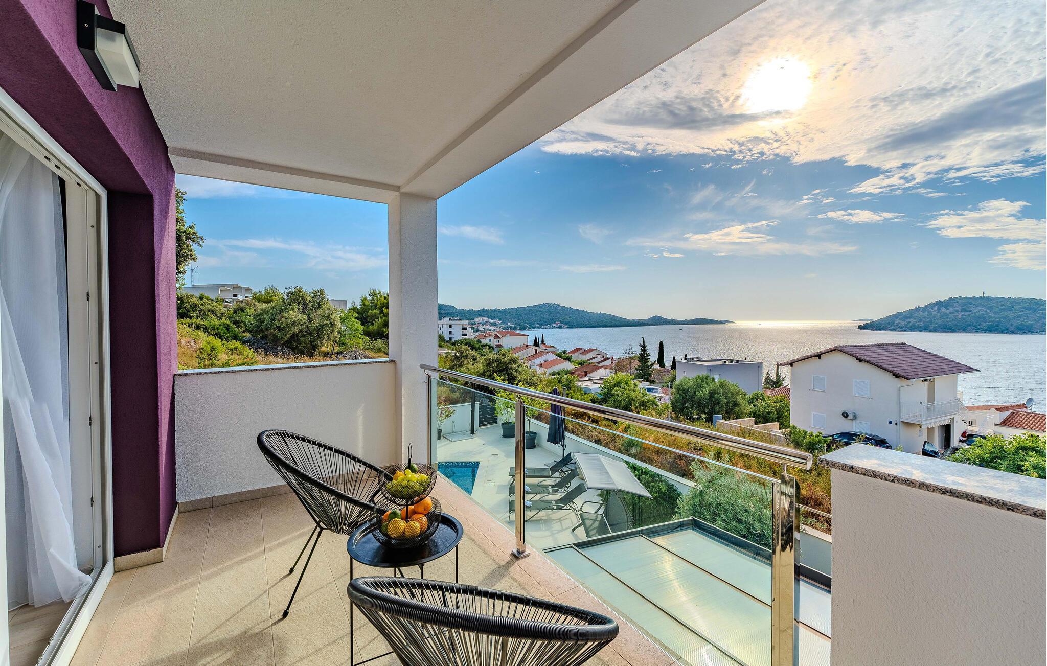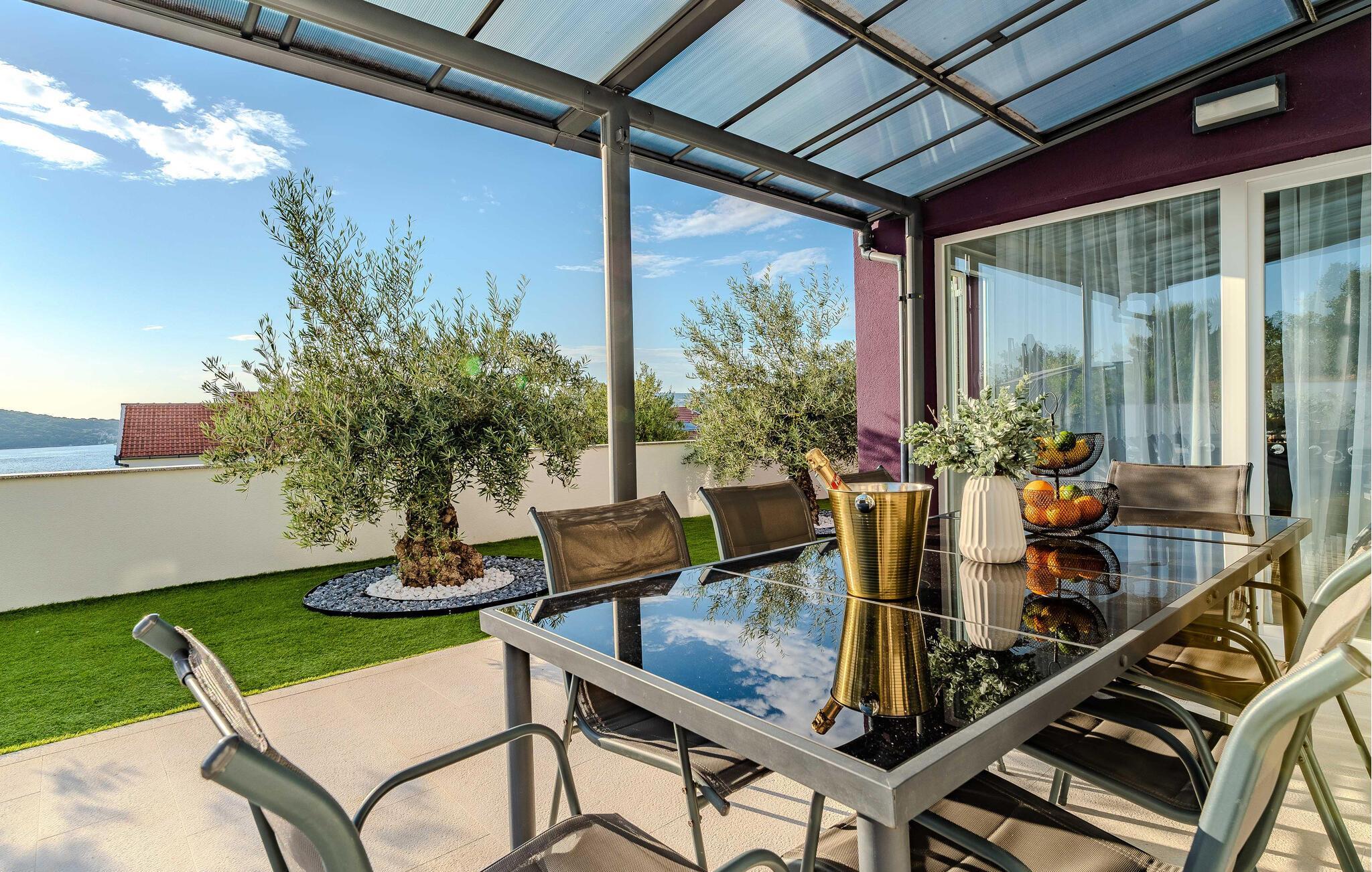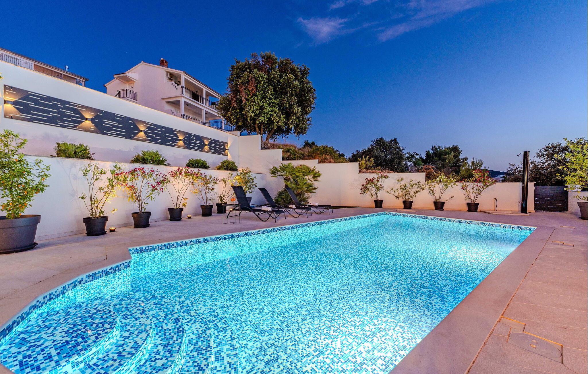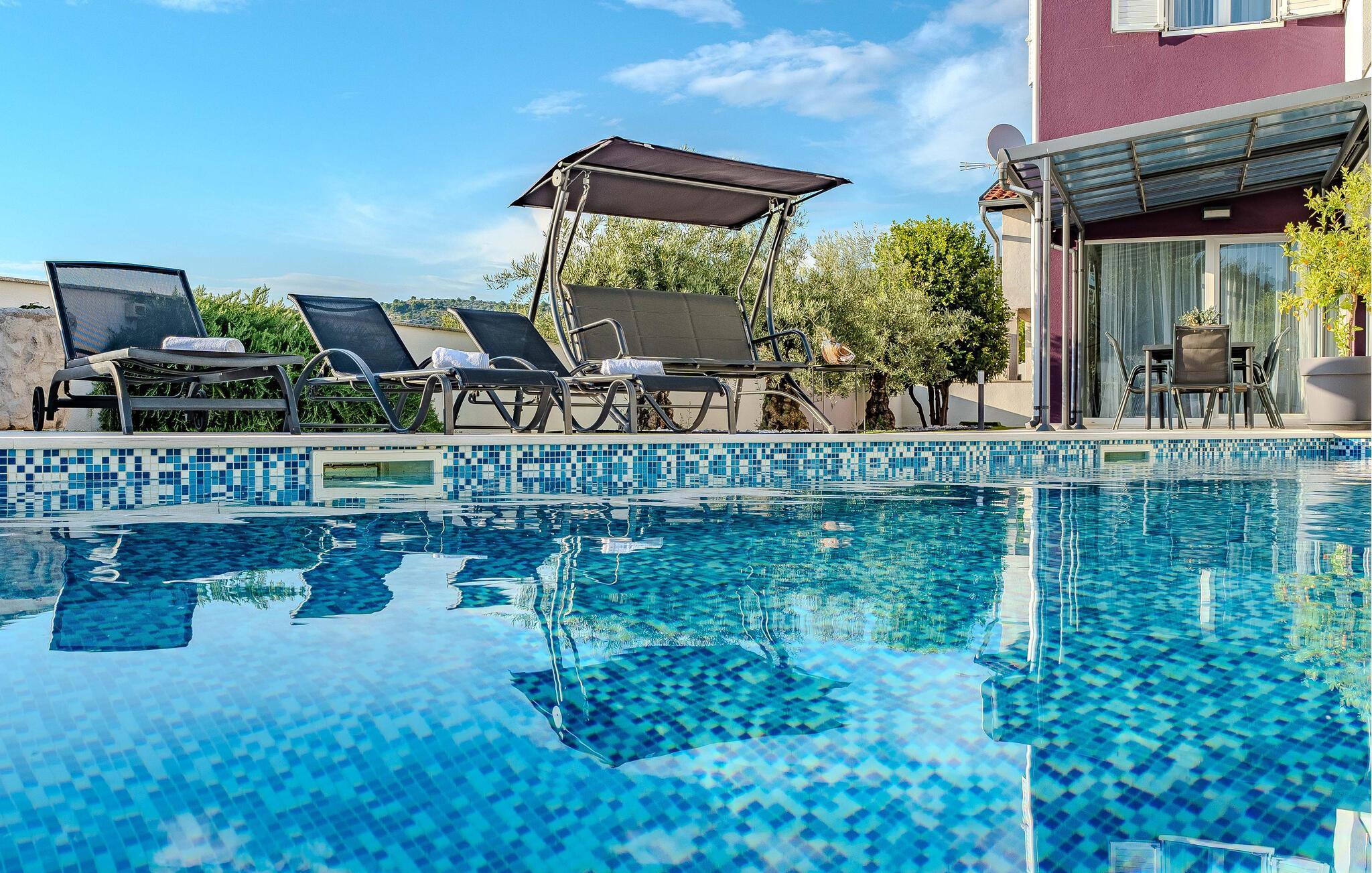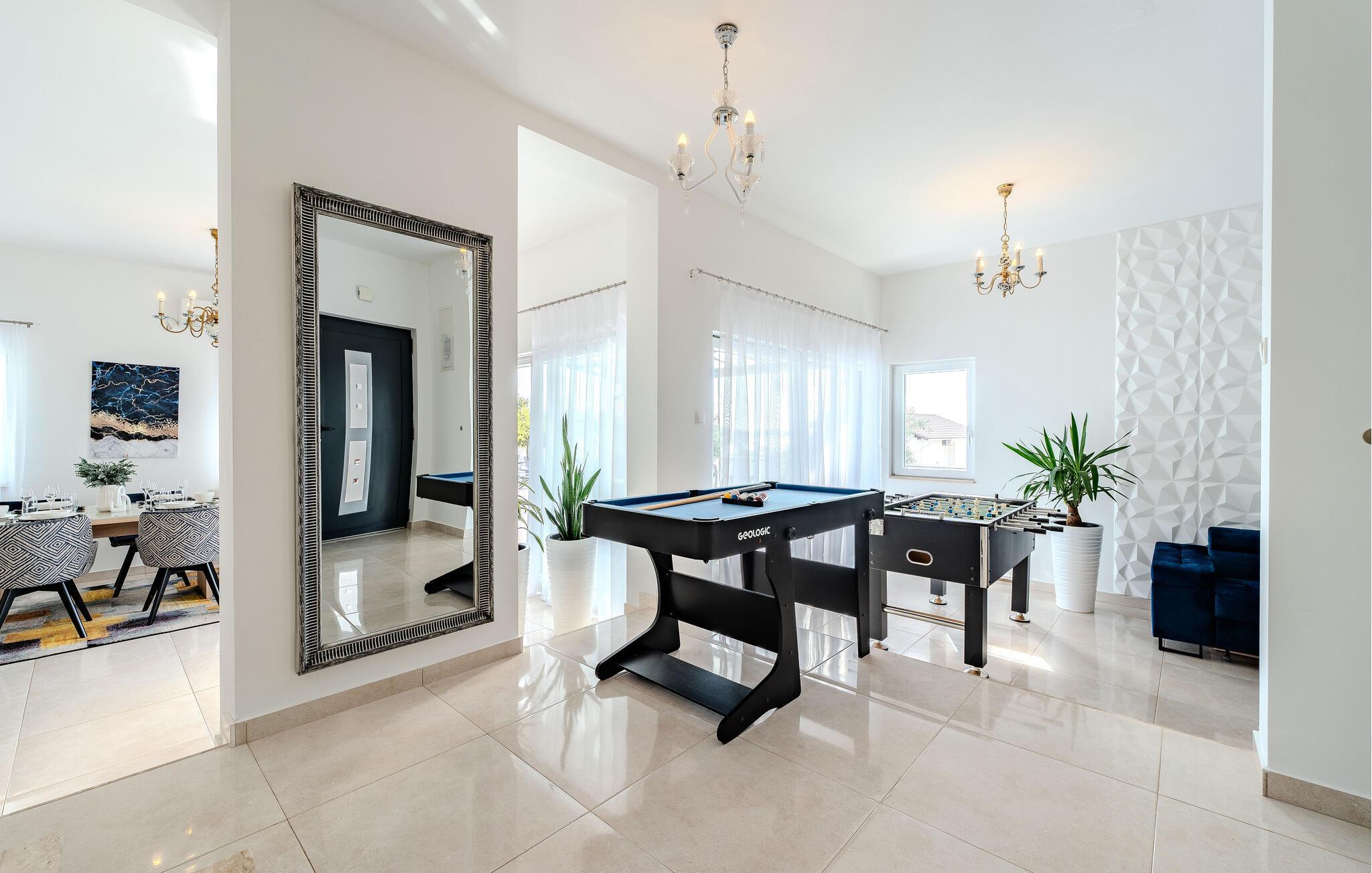 Oplev en uforglemmelig ferie i denne luksuriøse villa med pool og havudsigt. Beliggende på en bakketop tilbyder den moderne Villa Carré Violet en imponerende havudsigt. Det rummelige, lyse interiør strækker sig over tre etager, hvoraf de to første er forbundet med en intern trappe. Store vinduer oversvømmer de stilfulde, møblerede værelser af høj kvalitet med rigeligt naturligt lys. Fremtryll kulinariske lækkerier i det fuldt udstyrede køkken og nyd harmoniske måltider ved det indbydende spisebord. Hav det sjovt ved poolbordet, dyst ved bordfodboldbordet eller spil et spil bordtennis, før I nyder en god nats søvn i de rummelige soveværelser. Det elegante udendørsområde byder på flere højdepunkter. snup en frisk dukkert i den storslåede pool og slap af på de komfortable liggestole eller i gyngen på verandaen. Den smukke terrasse på øverste etage forkæler jer med en betagende udsigt over havet, bugten og Rogoznica. Her kan I nyde uforglemmelige solnedgange og stemningsfulde grillaftener med vin og stearinlys. De nærliggende stenstrande er rolige og ideelle for børn. For mere action, tag til Rogoznica centrum om sommeren, hvor fremragende restauranter og hyggelige taverner sørger for underholdning. De historiske byer Trogir, Split og Šibenik er også værd at udforske, hvor man kan tage en bådtur til Kornati-øerne og de spektakulære vandfald i den nærliggende Krka Nationalpark.