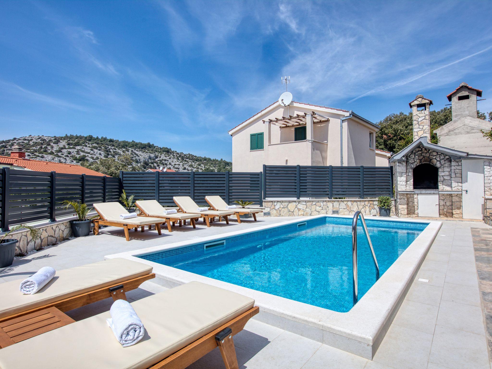 Haus bietet Platz für 10 Gäste. Die Betten sind in Schlafzimmern, die es 4 gibt, und in Wohnzimmer, innerhalb einer Gesamtfläche von 122m2, angeordnet. Die Gäste haben eine eigene Terrasse zur Verfügung, auf der sie in warmen Sommernächten genießen können. Das Haus bietet Meerblick. Für vollen Genuss und Entspannung gibt es einen privaten Grill für Gäste dieser Unterkunft. Während ihres Aufenthalts können sich Gäste im privaten Schwimmbad entspannen. IM PREIS INBEGRIFFEN: Kurtaxe, Endreinigung, Klimatisierung, Pool, Parkplatz, Internet, Kinderbett, Bügeleisen, Bügelbrett, Föhn, Sonnenschirm, Liegestühle. UNVERBINDLICHE ZUSÄTZLICHE KOSTEN: Bootsanlegeplatz (20,00 € pro Nacht). Die Verfügbarkeit zusätzlicher Dienstleistungen in Ihrem reservierten Termin und die Preise derselben (falls nicht aufgeführt) müssen im Voraus überprüft werden. Zusätzliche Dienstleistungen die in der Zahlungsaufforderung nicht aufgeführt sind werden direkt beim Vermieter bezahlt, angenommen der Gast nutzt auch diese. Ermäßigung auf den Grundpreis: Gratistag 14=13 (bei einem Aufenthalt von 14 Tagen oder mehr erhalten Sie einen Gratistag für den Aufenthalt bis 31.12.26).