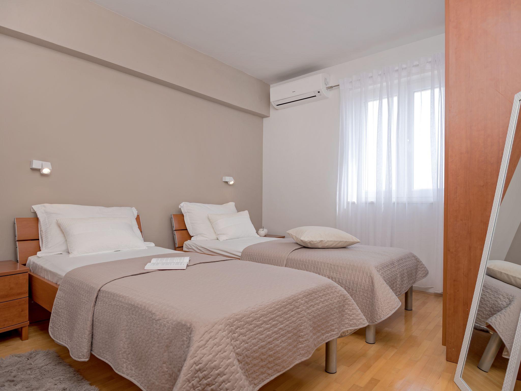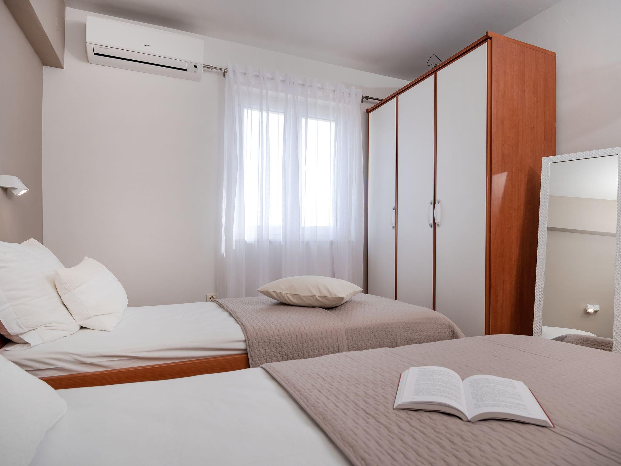 Ferienwohnung bietet Platz für 4 Gäste. Die Betten sind in Schlafzimmern, die es 2 gibt, innerhalb einer Gesamtfläche von 41m2, angeordnet. Die Gäste haben eine eigene Terrasse zur Verfügung, auf der sie in warmen Sommernächten genießen können. Das Apartment bietet Meerblick. IM PREIS INBEGRIFFEN: Kurtaxe, Endreinigung, Klimatisierung, Parkplatz, Internet. VERBINDLICHE ZUSÄTZLICHE KOSTEN: Aufzahlung für Kurzaufenthalte (prozentualer Zuschlag pro Nächtigungsanzahl: 30% - 1, 20% - 2, 10% - 3). Die Verfügbarkeit zusätzlicher Dienstleistungen in Ihrem reservierten Termin und die Preise derselben (falls nicht aufgeführt) müssen im Voraus überprüft werden. Zusätzliche Dienstleistungen die in der Zahlungsaufforderung nicht aufgeführt sind werden direkt beim Vermieter bezahlt, angenommen der Gast nutzt auch diese.
