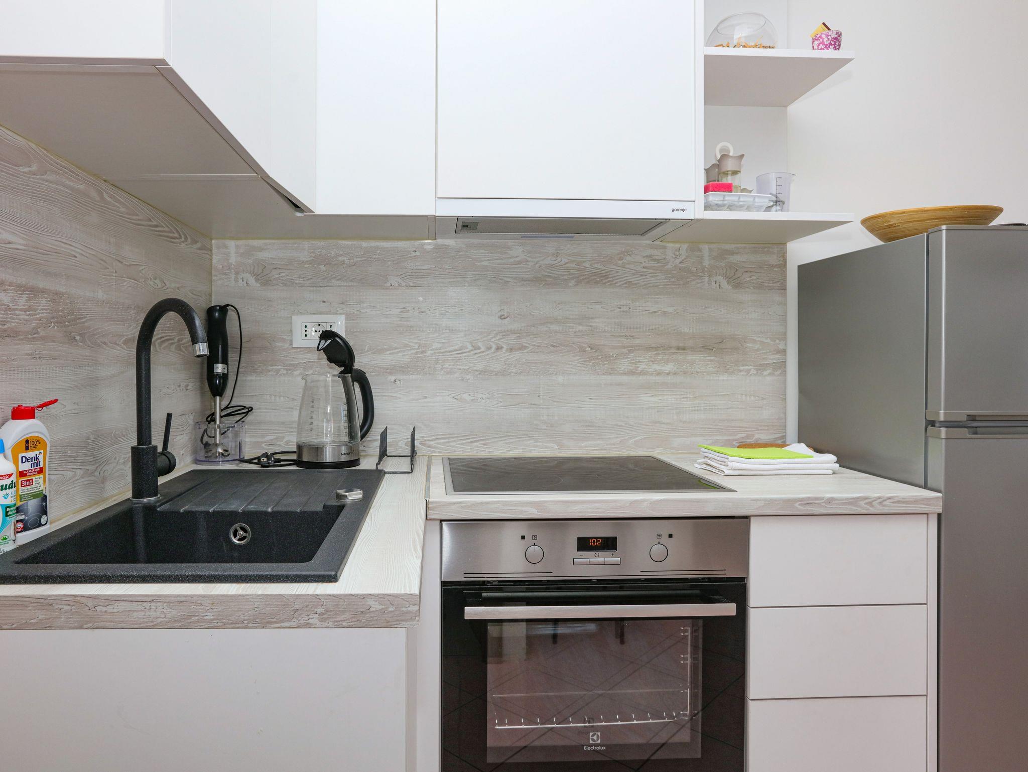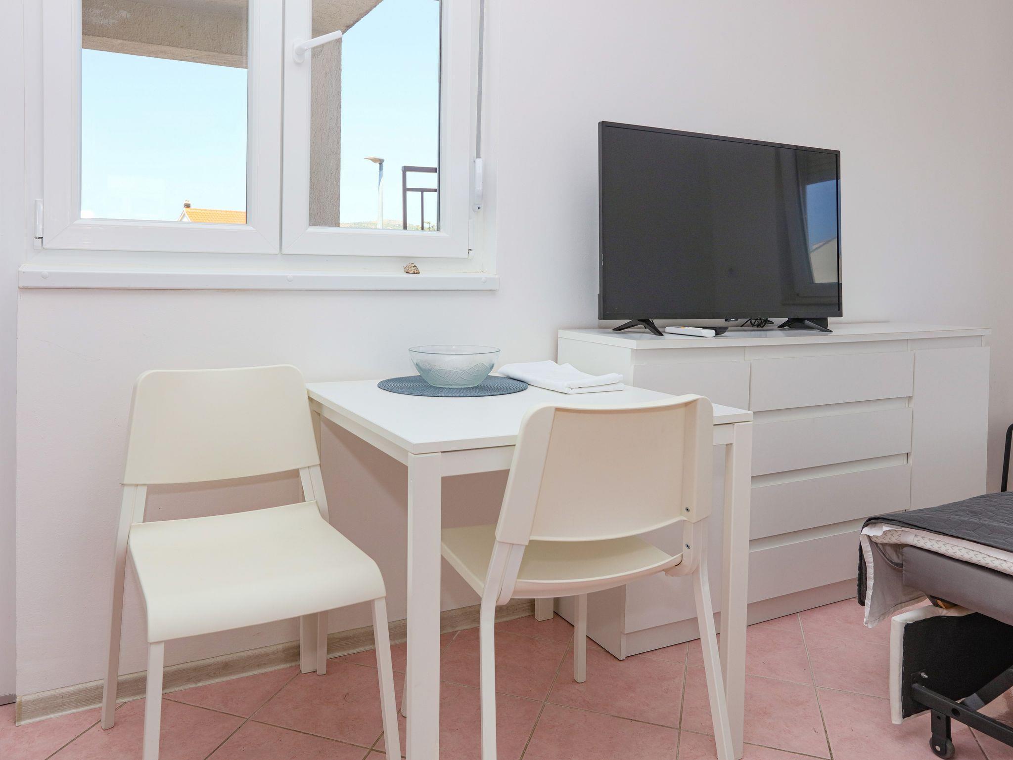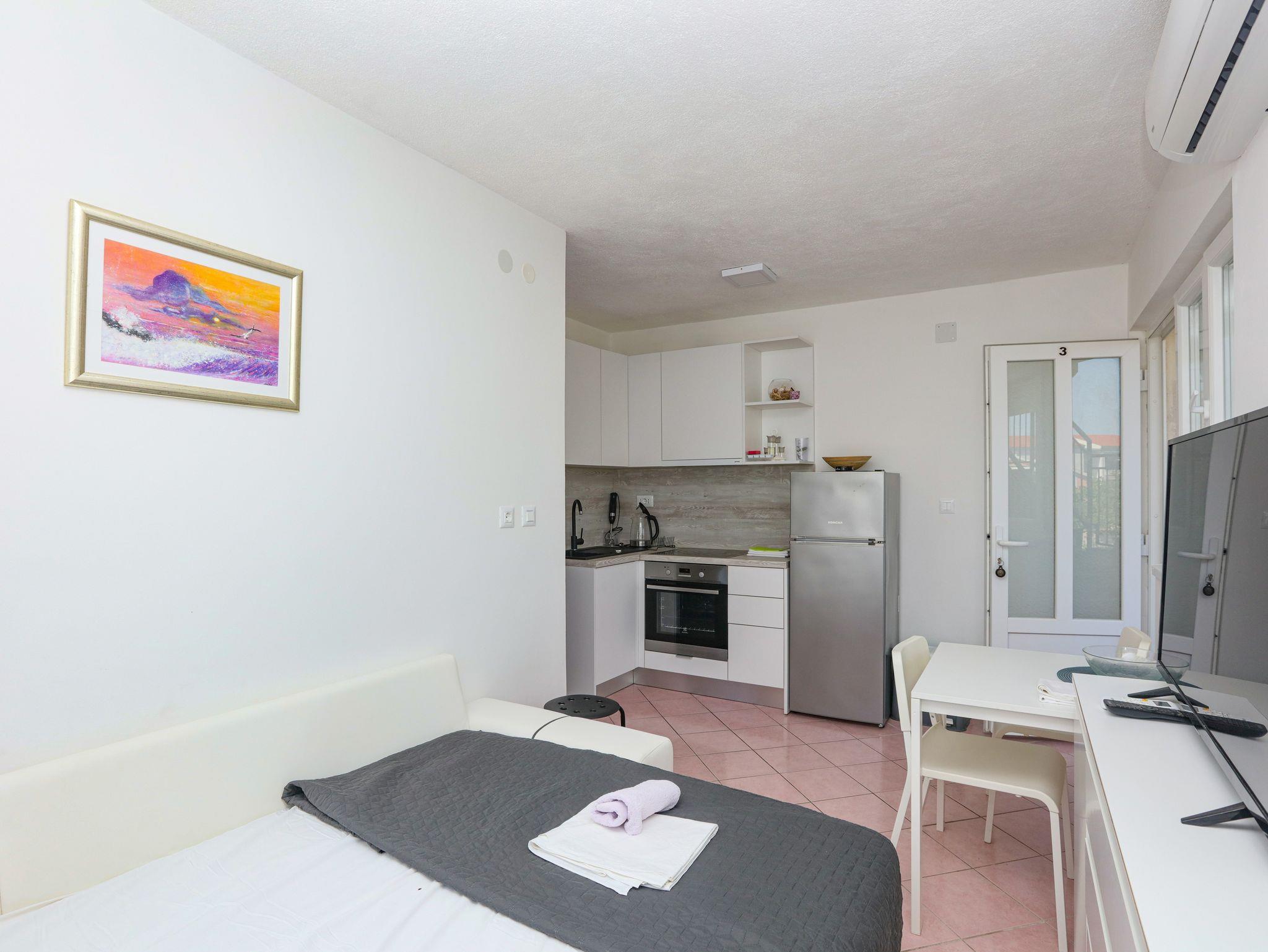 Studio bietet Platz für 4 Gäste. Die Betten sind in Schlafzimmern, die es 1 gibt, und in Wohnzimmer, innerhalb einer Gesamtfläche von 26m2, angeordnet. Die Gäste haben eine eigene Terrasse zur Verfügung, auf der sie in warmen Sommernächten genießen können. Es ist erlaubt, Speisen auf dem Gemeinschafts-Grill vorzubereiten. Durch die Terrasse der gebuchten Unterkunftseinheit gehen auch andere Gäste oder Vermieter. IM PREIS INBEGRIFFEN: Kurtaxe, Endreinigung, Klimatisierung, Parkplatz, Internet, Bügeleisen, Bügelbrett, Föhn, tragbarer Grill, Sonnenschirm. Die Verfügbarkeit zusätzlicher Dienstleistungen in Ihrem reservierten Termin und die Preise derselben (falls nicht aufgeführt) müssen im Voraus überprüft werden. Zusätzliche Dienstleistungen die in der Zahlungsaufforderung nicht aufgeführt sind werden direkt beim Vermieter bezahlt, angenommen der Gast nutzt auch diese. Ermäßigung auf den Grundpreis: Gratistag 14=13 (bei einem Aufenthalt von 14 Tagen oder mehr erhalten Sie einen Gratistag für den Aufenthalt bis 31.12.26).