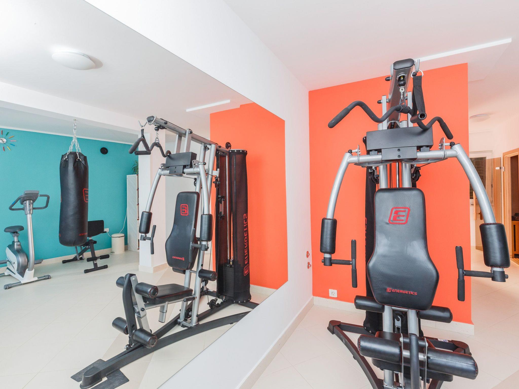 The rooms of the holiday house with a total living area of ??500 m² are spread over three floors with separate apartments and are furnished in mint condition with stylish furniture. A total of nine bedrooms and eight bathrooms can accommodate eighteen adults and two children. On the ground floor there is a games room with a pool table and other rooms for the maintenance of the house. On the first floor there is a three-room apartment with kitchen, living room and two bathrooms. This apartment has a patio and is connected to the courtyard. On the same floor there is a separate entrance with a gym and sauna and a bathroom. In this room there is also a sofa bed that can be converted into a bed for two children. On the second floor there are two more apartments with separate entrances. One has two bedrooms, a bathroom and a living room; the other has two bedrooms, a bathroom and a kitchen. On the top floor there are two more apartments, which correspond to those on the second floor. However, they have only one bedroom and are slightly larger. All bedrooms are bright and friendly and have double beds, four of which are 180 x 200 cm and five beds 160 x 200 cm. The modern bathrooms are fully equipped, so you can start your day in style. Air conditioning, washing machines and internet can be used without additional charges. A high chair and baby cot are provided free of charge upon request. In total, there are six air conditioners in the house, two on each floor.