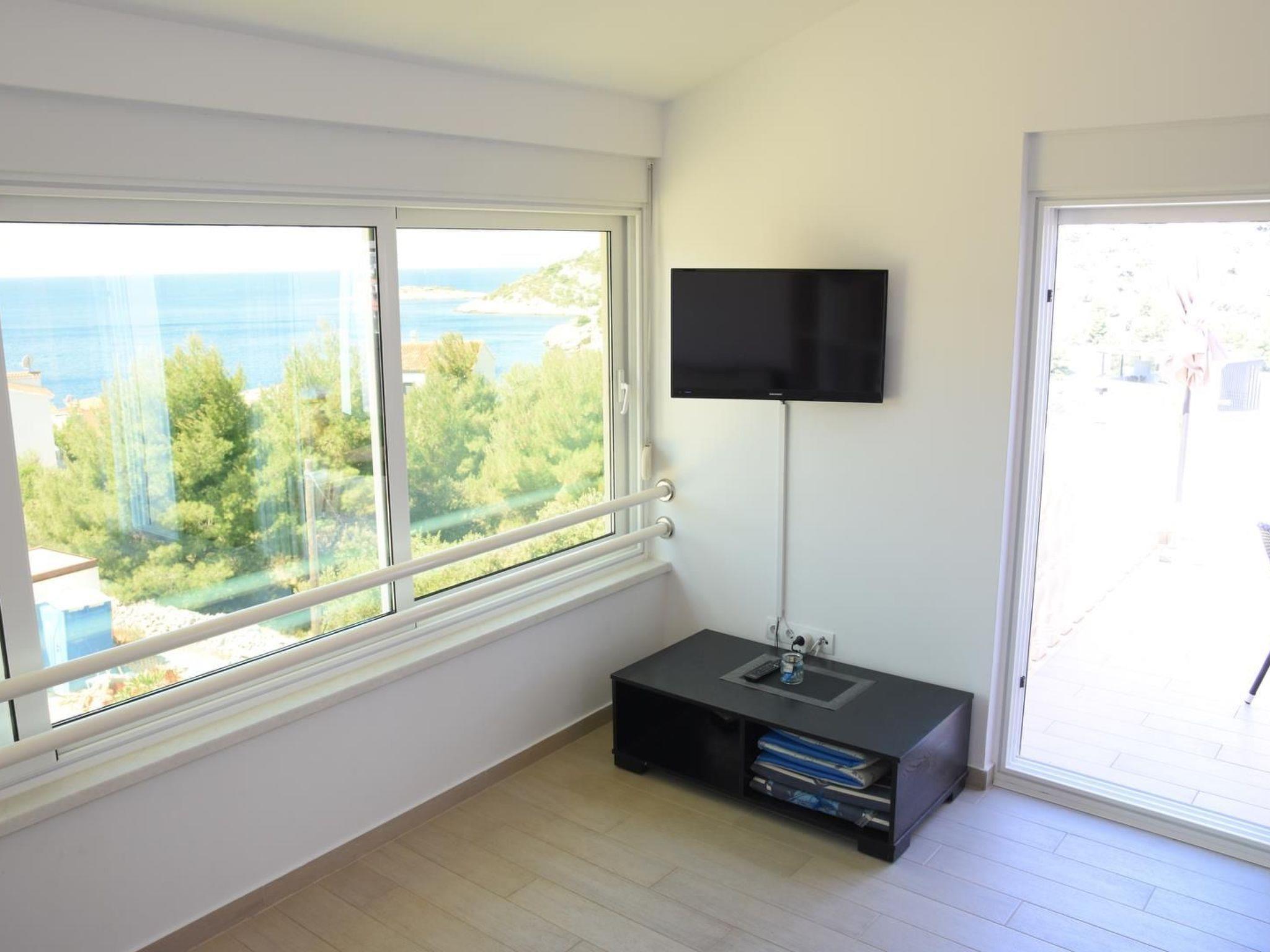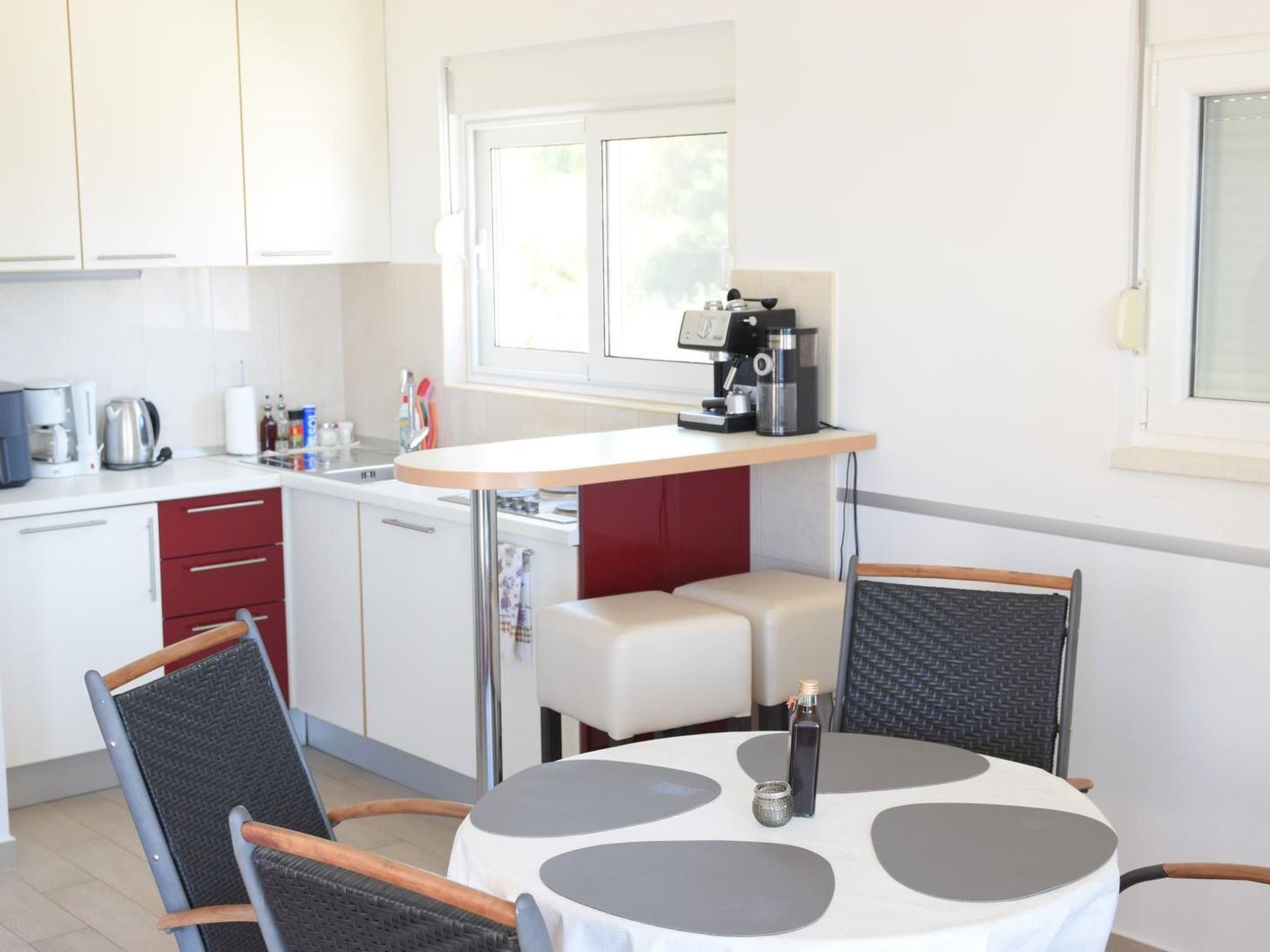 The loft is located on the first floor of the villa and is therefore the top flat. In the large living room, a sofa with TV invites you to linger. The comfortable sofa can also be used as a sofa bed for two guests or children. The high quality of the couch makes you feel as if you are lying in a bed. The open-plan modern kitchen with a counter is also located in the living area. In addition to all the important kitchen utensils, you will also find a dishwasher, a toaster, a kettle and an electric cooker. A dining table invites you to eat together after preparing and cooking. Next door is the separate bedroom with a double bed. From both the bedroom and the living room, you can enjoy an excellent sea view through full-sided panoramic windows as you get up and have breakfast. The entire flat can be cooled via the new air conditioning system with remote control (2015). A large, spacious bathroom with an equally spacious shower completes the offer in the holiday flat.