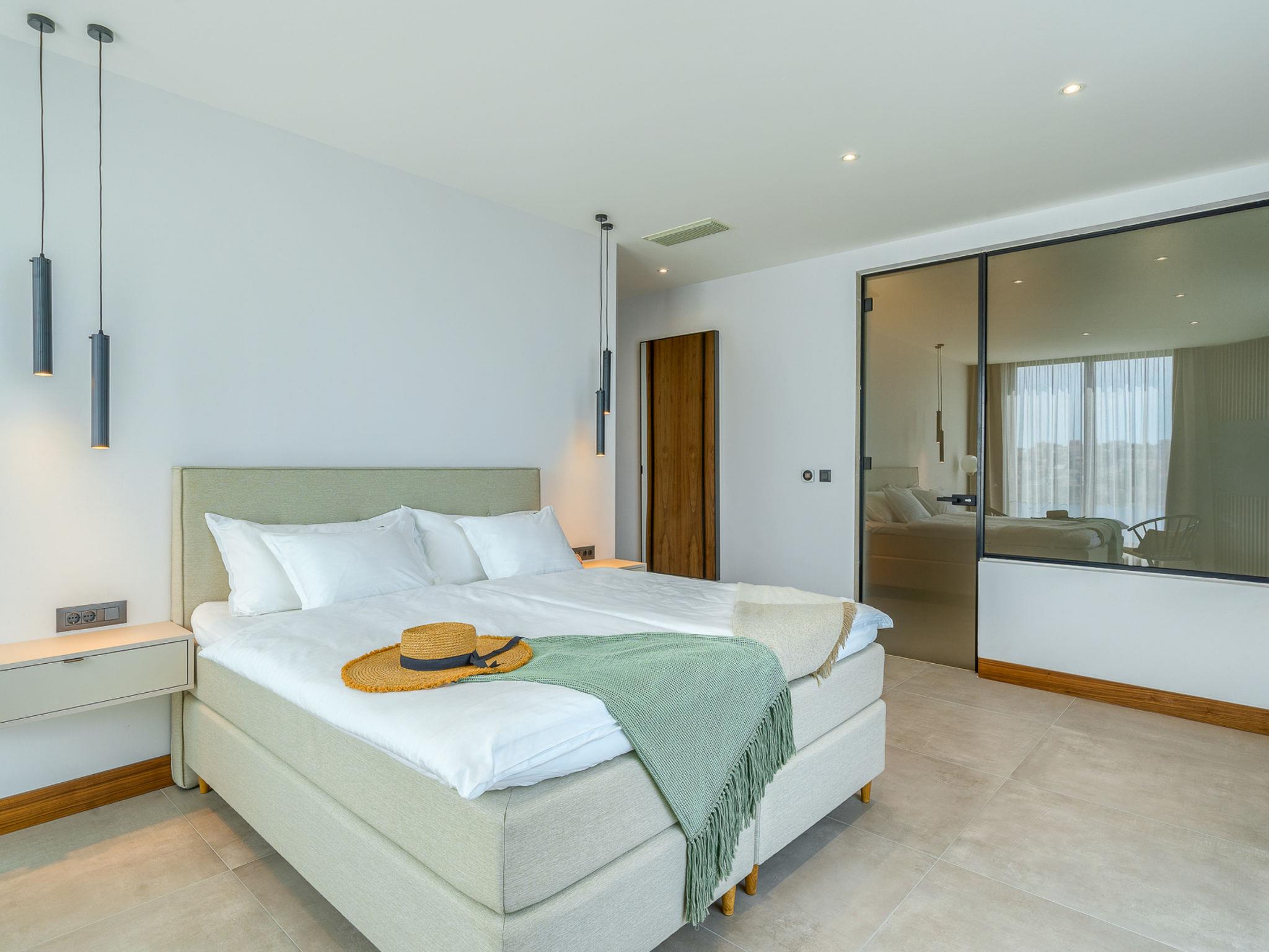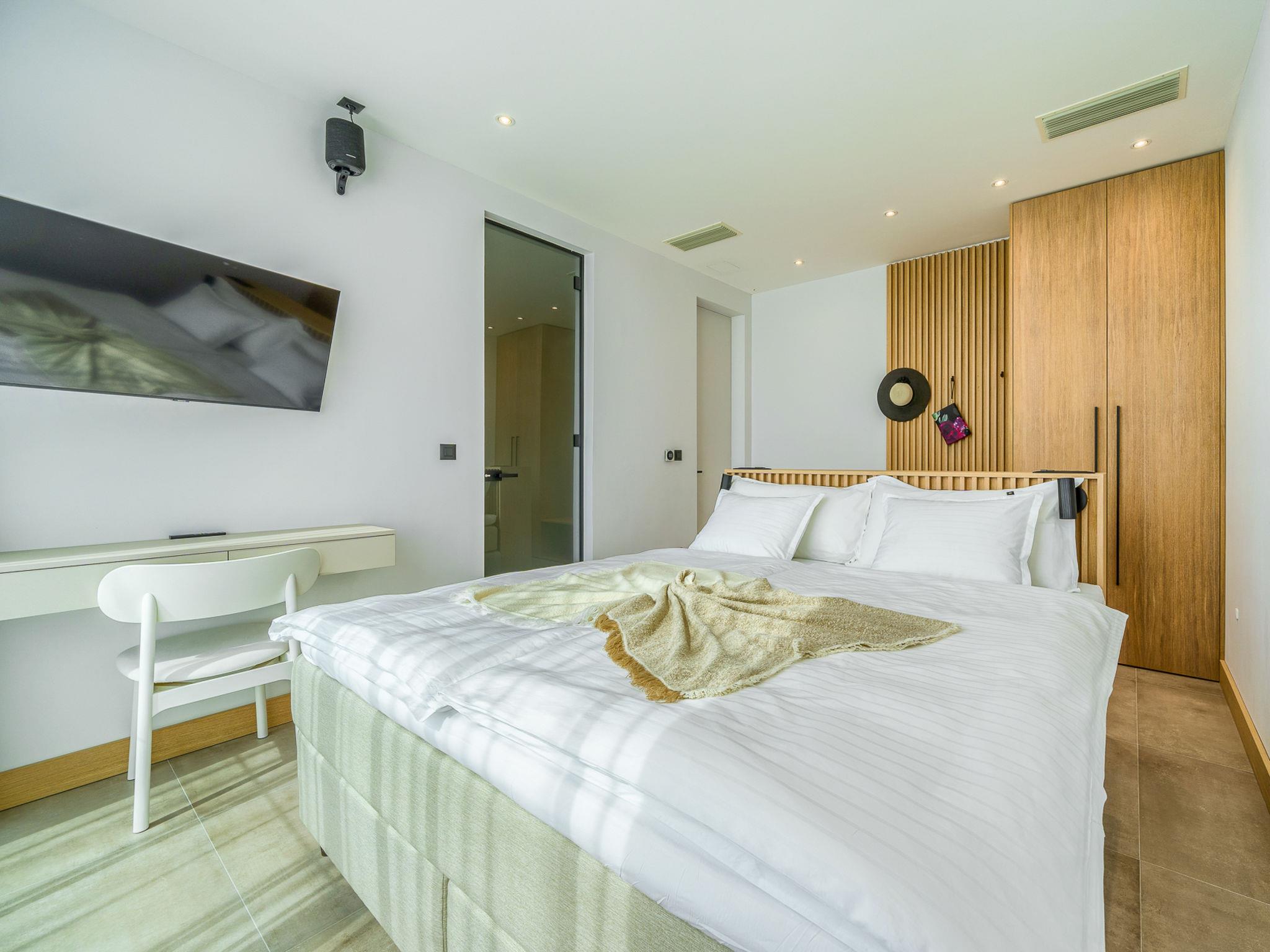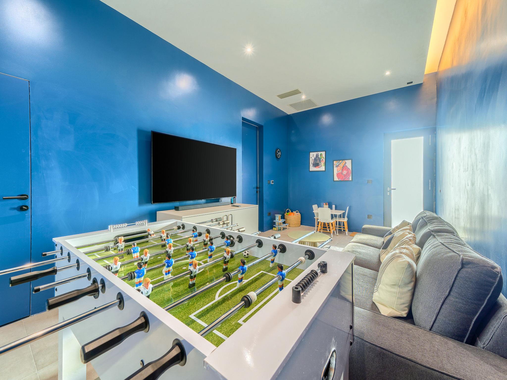 7-room villa 340 m2 on 2 levels. Beautiful and stylish furnishings: living/dining room with satellite TV (flat screen), air conditioning. Exit to the terrace, to the swimming pool. (180 cm, length 200 cm). Open kitchen (oven, dishwasher, 4 ceramic glass hob hotplates, toaster, kettle, microwave, freezer, electric coffee machine). Shower/WC. Upper floor: 2 rooms, each room with 1 french bed (180 cm, length 200 cm), satellite TV (flat screen), air conditioning. 2 rooms, each room with 1 french bed (180 cm, length 200 cm), shower/WC, double hand-basin and satellite TV (flat screen), air conditioning. 2 rooms, each room with 1 french bed (180 cm, length 200 cm), bath/shower/WC and satellite TV (flat screen), air conditioning. Playroom with satellite TV (flat screen), air conditioning. Shower/WC. Terrace 15 m2. Deck chairs (10). Beautiful view of the sea. Facilities: washing machine, safe, children's high chair, hair dryer. Internet (WiFi, free).