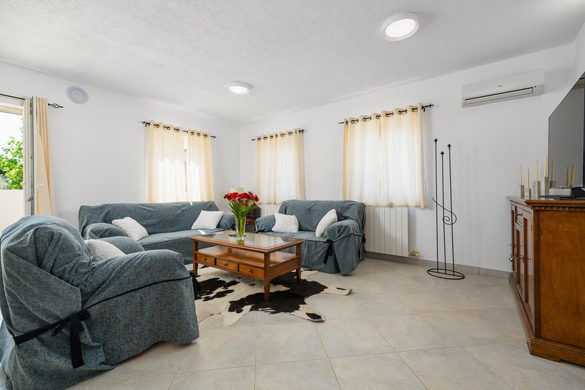 Stueetage: (åbent køkken(elkedel, brødrister, kaffemaskine, ovn, mikrobølgeovn, opvaskemaskine , køleskab, fryser, ()), stue / spisestue(dobbeltsovesofa, Fjernsyn(parabol), radio), toilet(toilet), Internetadgang) På 1. etage: (soveværelse(dobbeltseng), soveværelse(enkeltseng, enkeltseng, Fjernsyn(parabol), balkon), badeværelse(bruser, håndvask, toilet, føntørrer)) bruser(udendørs), vaskemaskine, balkon, klimaanlæg, terrasse(20 m2), have(indhegnet), havemøbler, grill, parkering, swimmingpool(privat), strygejern