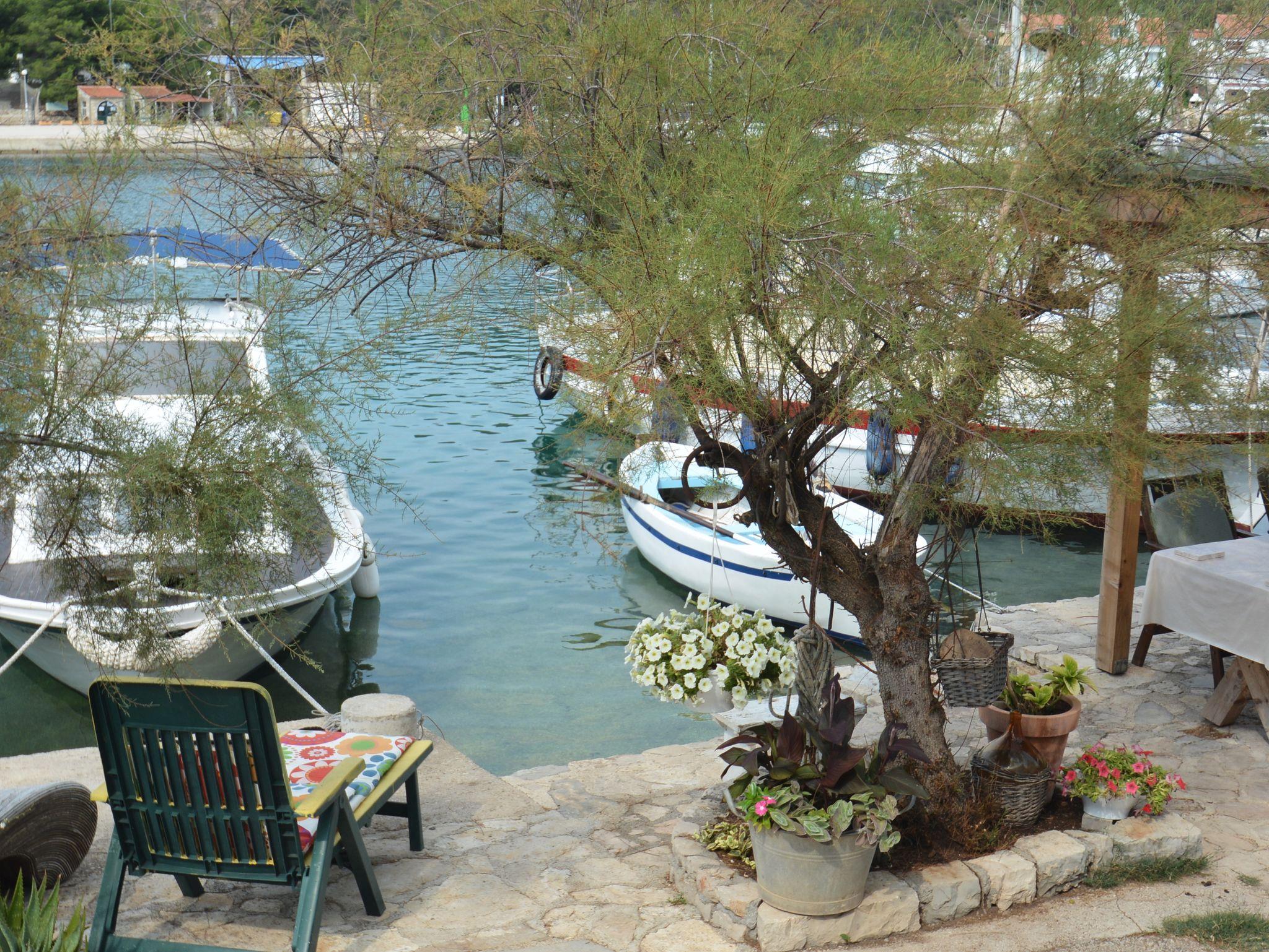 Umgebung des Objekts (Ordentlich), Hof (30m2, Wird mit einem anderen Objekt mitbenutzt, Sitzbereich), Grill: gemeinsam, WiFi Internet, Wäschewaschen, Bootsanlegeplatz (Entfernung vom Objekt: 10 m, Bootsanlegeplatztyp: an der Küste), Föhn, Bügeleisen, Bügelbrett, Liegestühle, Kinderbett