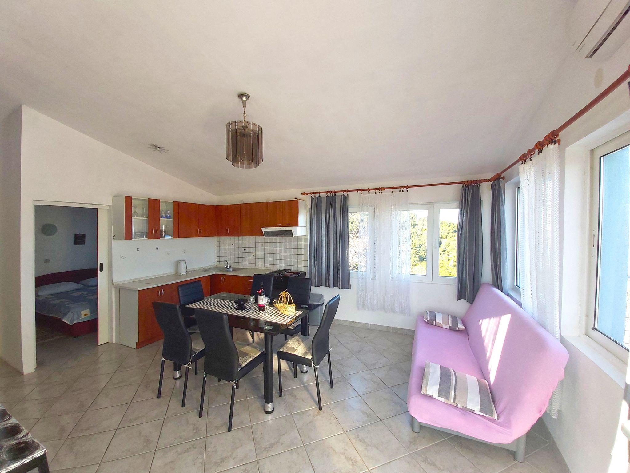Ferienwohnung bietet Platz für 6 Gäste. Die Betten sind in Schlafzimmern, die es 2 gibt, und in Esszimmer, innerhalb einer Gesamtfläche von 46m2, angeordnet. Die Gäste haben eine eigene Terrasse zur Verfügung, auf der sie in warmen Sommernächten genießen können. Das Apartment bietet Meerblick. Es ist erlaubt, Speisen auf dem Gemeinschafts-Grill vorzubereiten. In der Unterkunftseinheit besteht die Möglichkeit des Mitbringens von Haustieren gegen Aufpreis. IM PREIS INBEGRIFFEN: Kurtaxe, Endreinigung, Klimatisierung, Parkplatz, Internet, Kinderbett, Bügeleisen, Bügelbrett, Föhn. VERBINDLICHE ZUSÄTZLICHE KOSTEN: Aufzahlung für Kurzaufenthalte (prozentualer Zuschlag pro Nächtigungsanzahl: 30% - 1, 20% - 2, 10% - 3). UNVERBINDLICHE ZUSÄTZLICHE KOSTEN: Wäschewaschen (5,00 € Waschen), Haustiere (8,00 € pro Nacht). Die Verfügbarkeit zusätzlicher Dienstleistungen in Ihrem reservierten Termin und die Preise derselben (falls nicht aufgeführt) müssen im Voraus überprüft werden. Zusätzliche Dienstleistungen die in der Zahlungsaufforderung nicht aufgeführt sind werden direkt beim Vermieter bezahlt, angenommen der Gast nutzt auch diese.