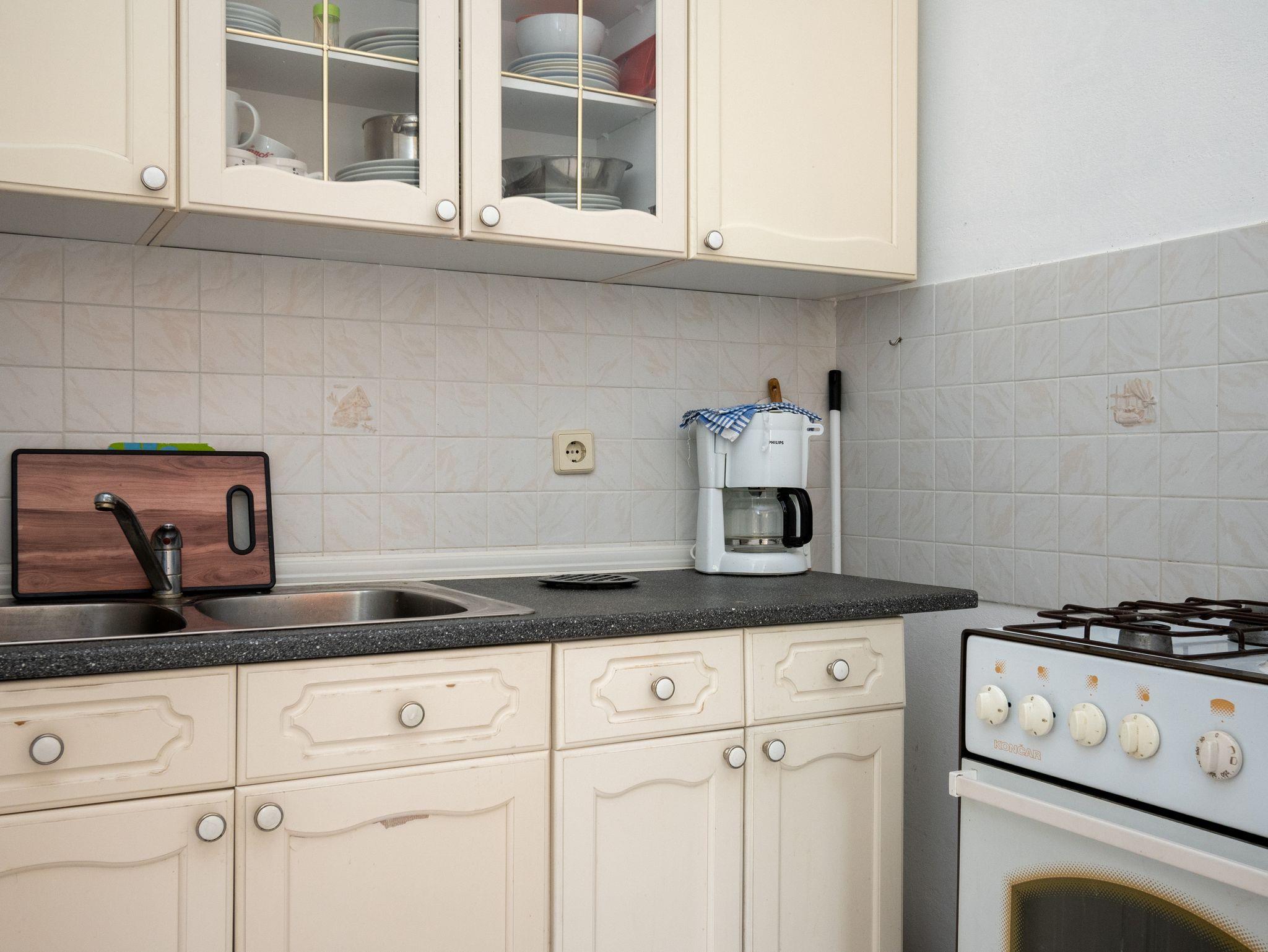 Ferienwohnung bietet Platz für 4 Gäste. Die Betten sind in Schlafzimmern, die es 2 gibt, innerhalb einer Gesamtfläche von 61m2, angeordnet. Die Gäste haben eine eigene Terrasse zur Verfügung, auf der sie in warmen Sommernächten genießen können. Das Apartment bietet Meerblick. Es ist erlaubt, Speisen auf dem Gemeinschafts-Grill vorzubereiten. In der Unterkunftseinheit besteht die Möglichkeit des Mitbringens von Haustieren gegen Aufpreis. IM PREIS INBEGRIFFEN: Kurtaxe, Endreinigung, Klimatisierung, Parkplatz, Garage, Internet, Bootsanlegeplatz, Bügeleisen, Bügelbrett, Föhn, Sonnenschirm. VERBINDLICHE ZUSÄTZLICHE KOSTEN: Aufzahlung für Kurzaufenthalte (prozentualer Zuschlag pro Nächtigungsanzahl: 30% - 1, 20% - 2, 10% - 3). UNVERBINDLICHE ZUSÄTZLICHE KOSTEN: Wäschewaschen (5,00 € Waschen), Haustiere (5,00 € pro Nacht). Die Verfügbarkeit zusätzlicher Dienstleistungen in Ihrem reservierten Termin und die Preise derselben (falls nicht aufgeführt) müssen im Voraus überprüft werden. Zusätzliche Dienstleistungen die in der Zahlungsaufforderung nicht aufgeführt sind werden direkt beim Vermieter bezahlt, angenommen der Gast nutzt auch diese.