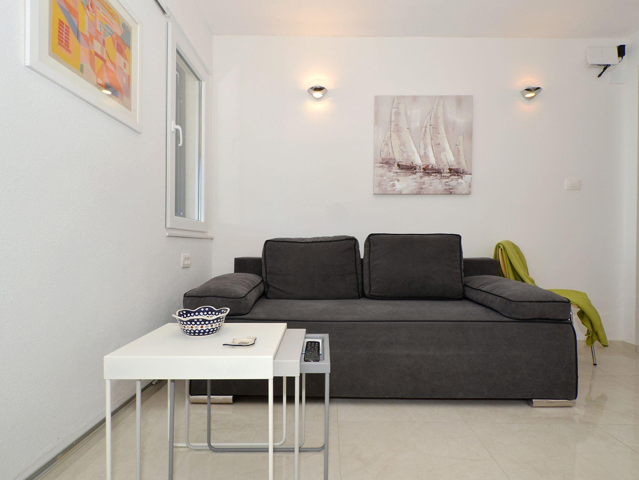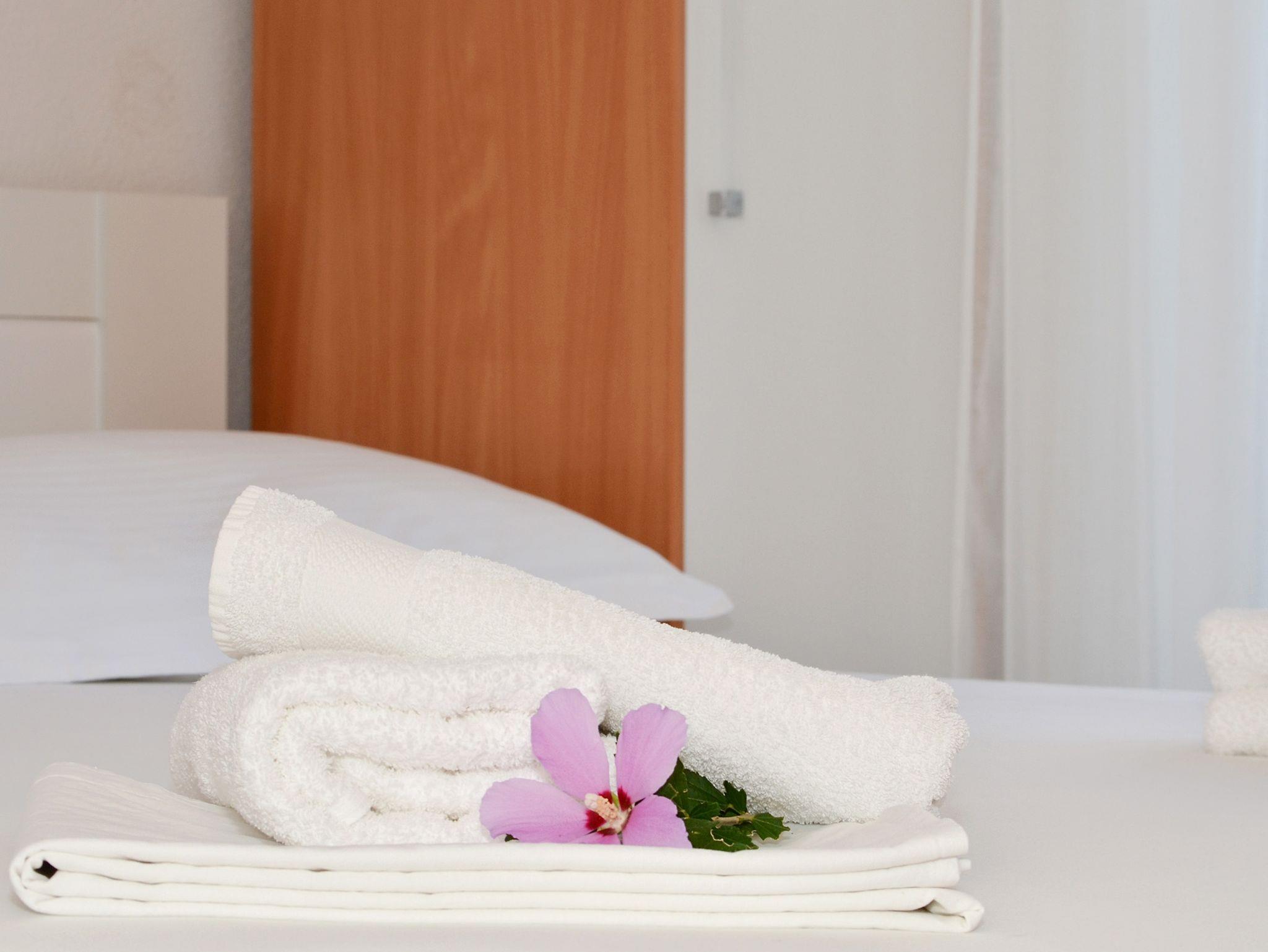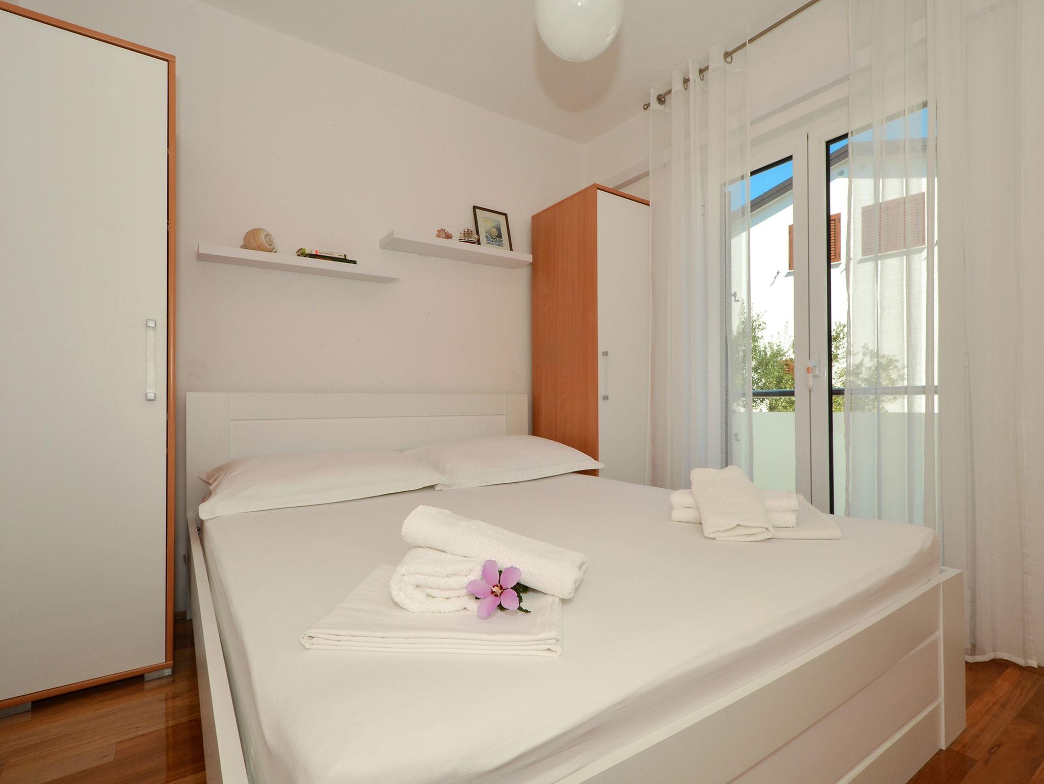 Ferienwohnung bietet Platz für 5 Gäste. Die Betten sind in Schlafzimmern, die es 2 gibt, und in Wohnzimmer, innerhalb einer Gesamtfläche von 42m2, angeordnet. Die Gäste haben eine eigene Terrasse zur Verfügung, auf der sie in warmen Sommernächten genießen können. Das Apartment bietet Meerblick. Es ist erlaubt, Speisen auf dem Gemeinschafts-Grill vorzubereiten. Während ihres Aufenthalts können Gäste das gemeinsam zur Nutzung stehende Schwimmbad benutzen. In der Unterkunftseinheit besteht die Möglichkeit des Mitbringens von Haustieren gegen Aufpreis. IM PREIS INBEGRIFFEN: Kurtaxe, Endreinigung, Pool, Garage, Internet, Bootsanlegeplatz, Kinderbett, Bügeleisen, Bügelbrett, Föhn, tragbarer Grill. UNVERBINDLICHE ZUSÄTZLICHE KOSTEN: Klimatisierung (10,00 € pro Nacht), Haustiere (10,00 € pro Nacht). Die Verfügbarkeit zusätzlicher Dienstleistungen in Ihrem reservierten Termin und die Preise derselben (falls nicht aufgeführt) müssen im Voraus überprüft werden. Zusätzliche Dienstleistungen die in der Zahlungsaufforderung nicht aufgeführt sind werden direkt beim Vermieter bezahlt, angenommen der Gast nutzt auch diese.