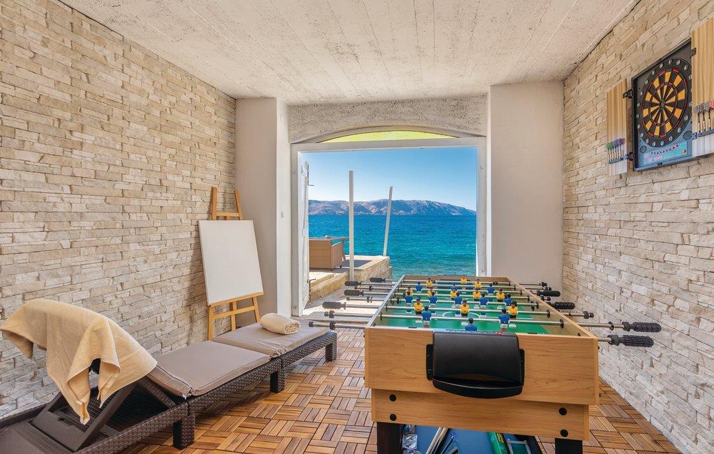 Oplev en luksuriøs ferievilla ved havet, der er designet til jeres største fornøjelse. Villaen byder på en betagende panoramaudsigt fra alle rum. Slap af på den bageste terrasse, eller nyd bugtens skønhed på de luksuriøse liggestole i solen. Den er udstyret med underholdningsfaciliteter som bordfodbold, dart, bordtennis og forskellige brætspil til hele familien og har en sauna til afslapning. Denne villa er perfekt til dem, der søger ro, stjernekiggeri og en fortryllende udsigt over landsbyen. Man kommer til villaen via en smal, snoet vej, og der er en eksklusiv parkeringsplads under et stort egetræ, hvor man kan holde sin bil beskyttet og afkølet.