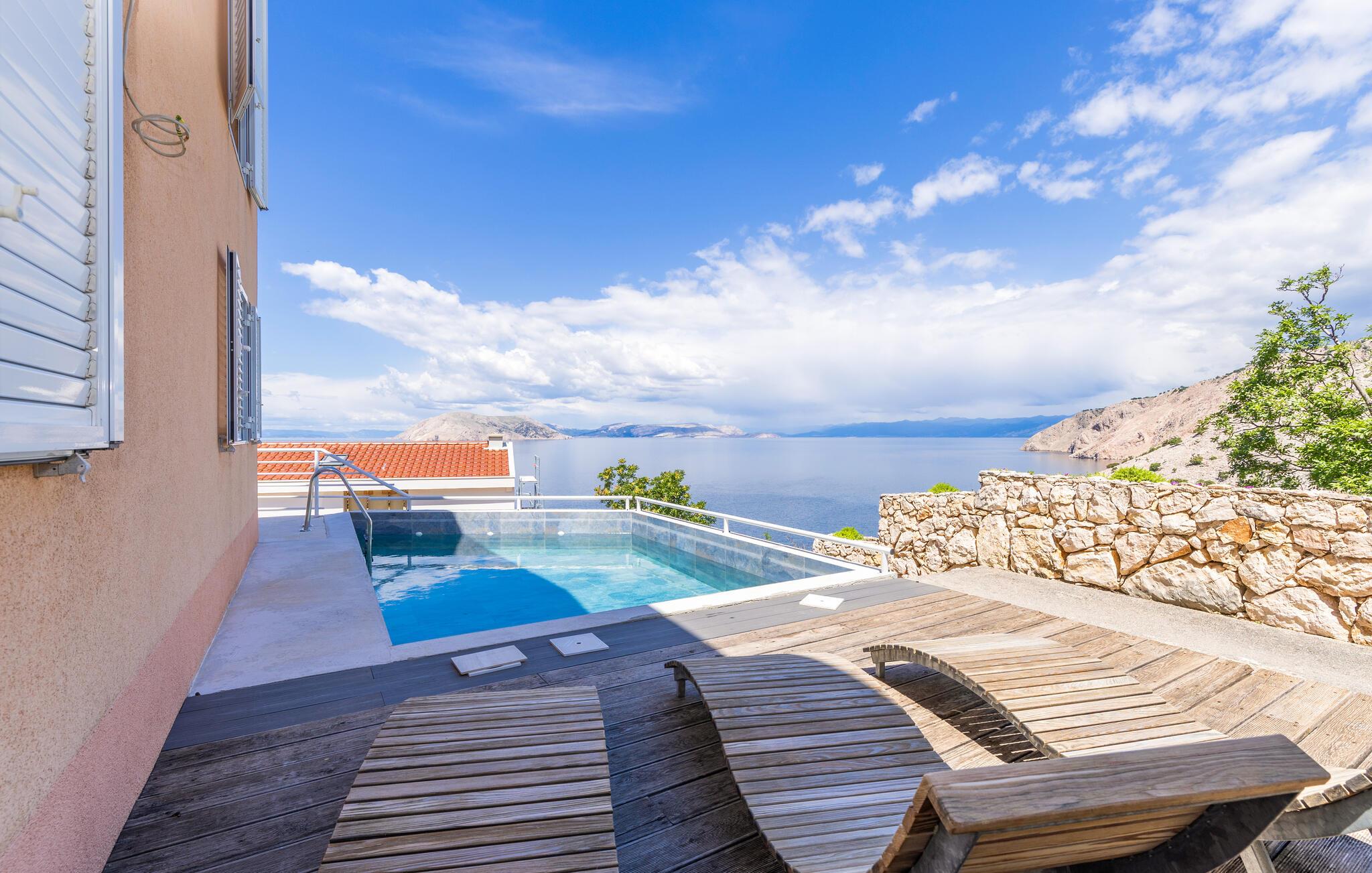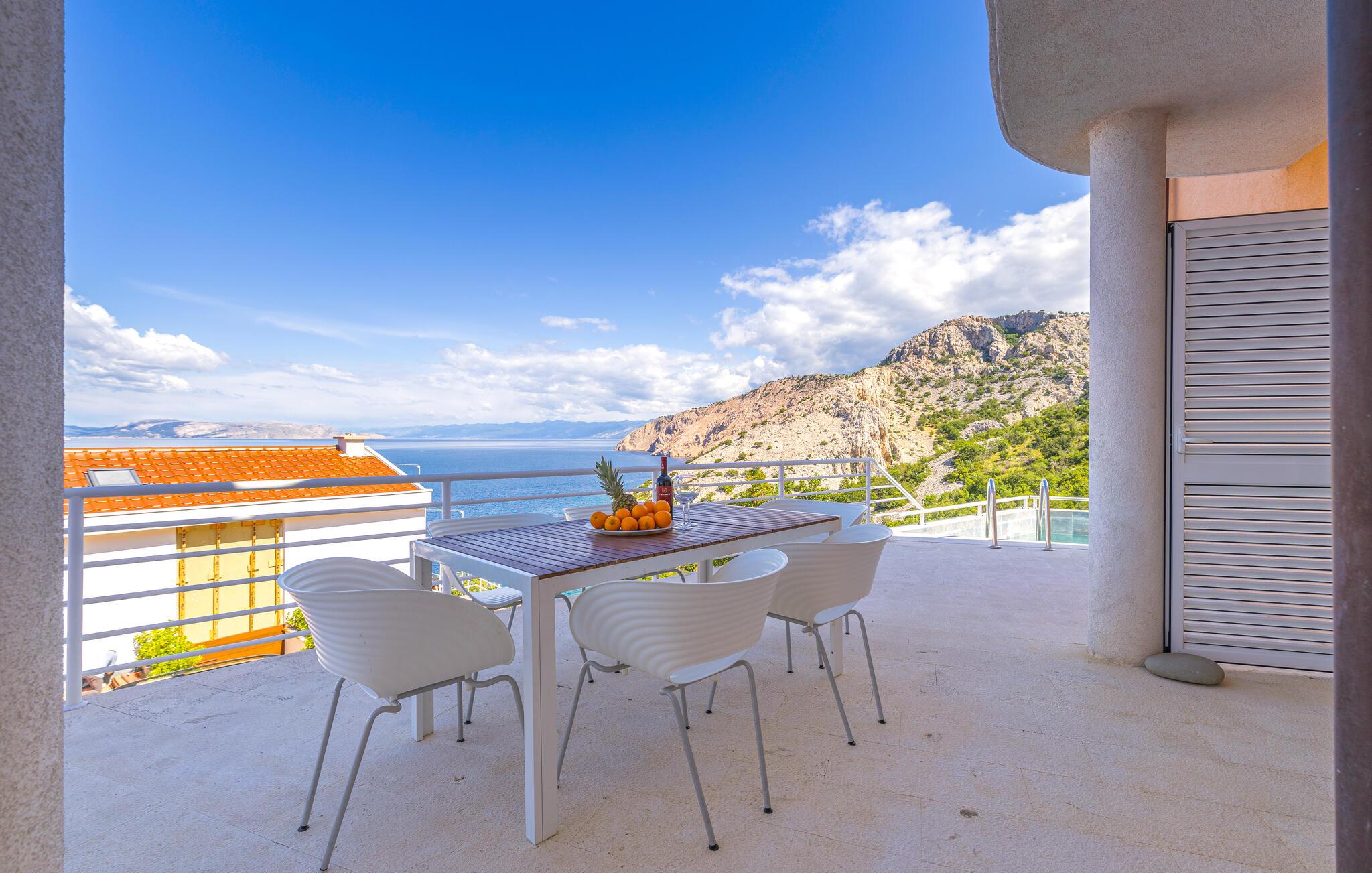 Glæd jer til en dejlig ferie i denne moderne ferielejlighed med pool- og havudsigt.
