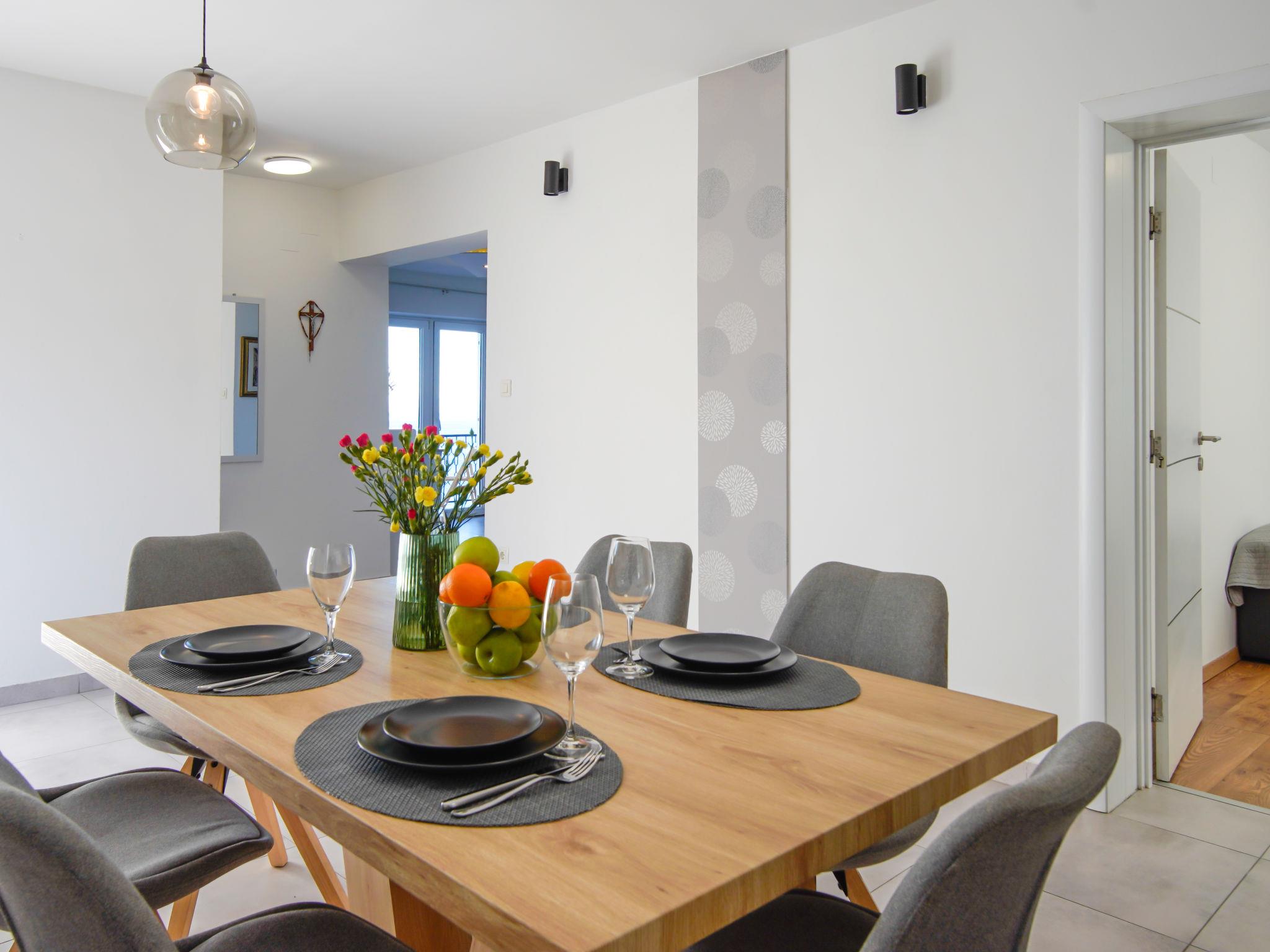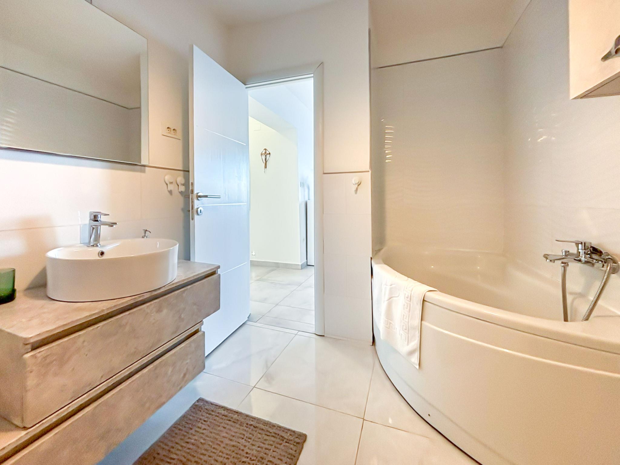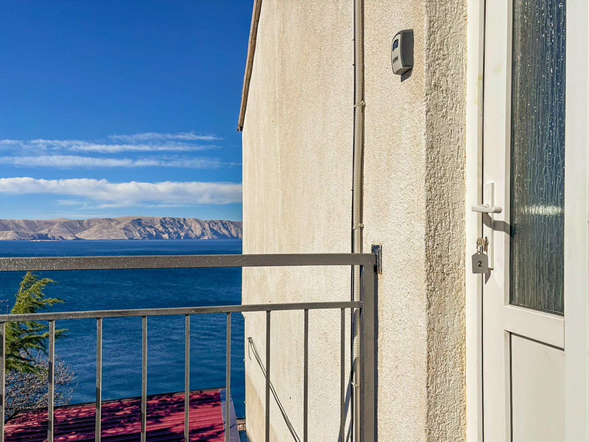 3-room apartment 96 m2 on 2nd floor. Living/dining room with satellite TV and air conditioning. Exit to the balcony. 1 room with 1 double bed (2 x 90 cm, length 200 cm). Exit to the balcony. 1 room with 2 beds (80 cm, length 200 cm), air conditioning. Open kitchen (oven, dishwasher, 4 ceramic glass hob hotplates, toaster, kettle, microwave, freezer, electric coffee machine). Bath/WC. No heating option. Balcony 10 m2, terrace 12 m2. Terrace furniture, balcony furniture. Beautiful panoramic view of the sea. Facilities: washing machine, iron, hair dryer. Internet (WiFi, free). Please note: non-smoking house. Fire extinguisher.
