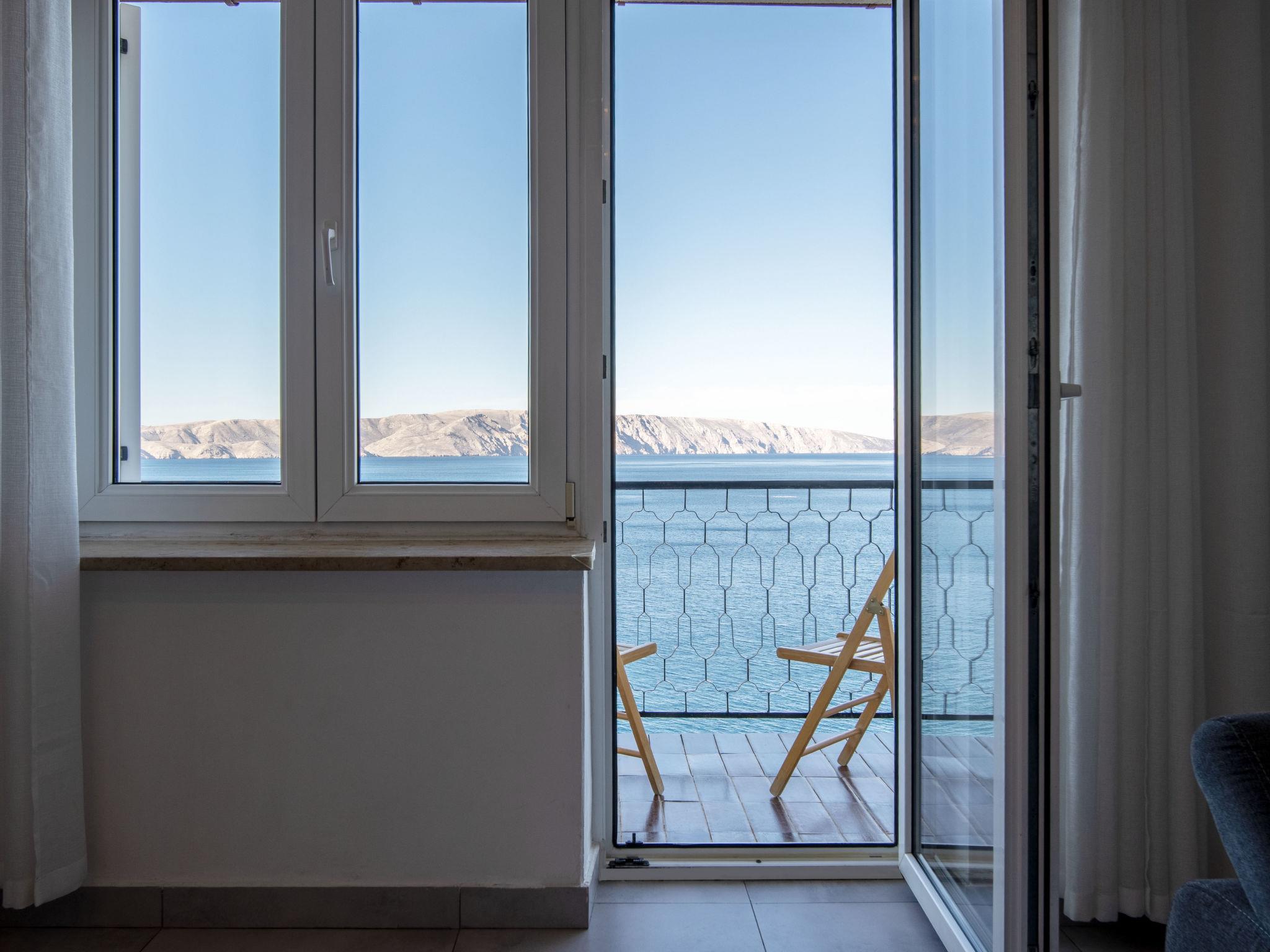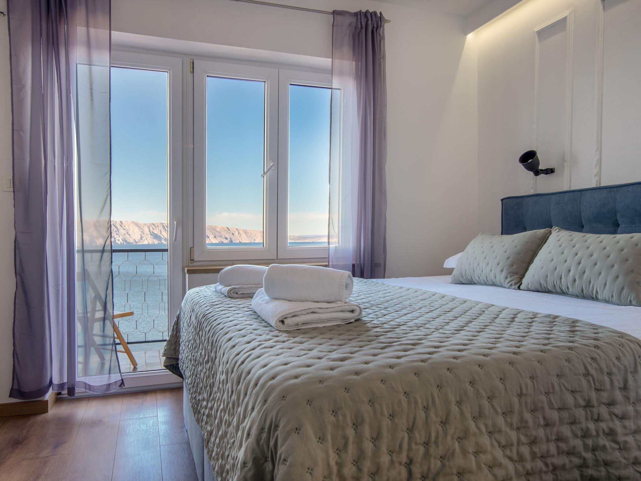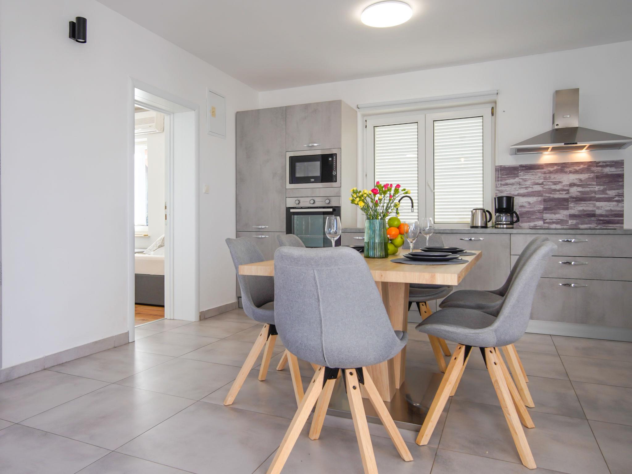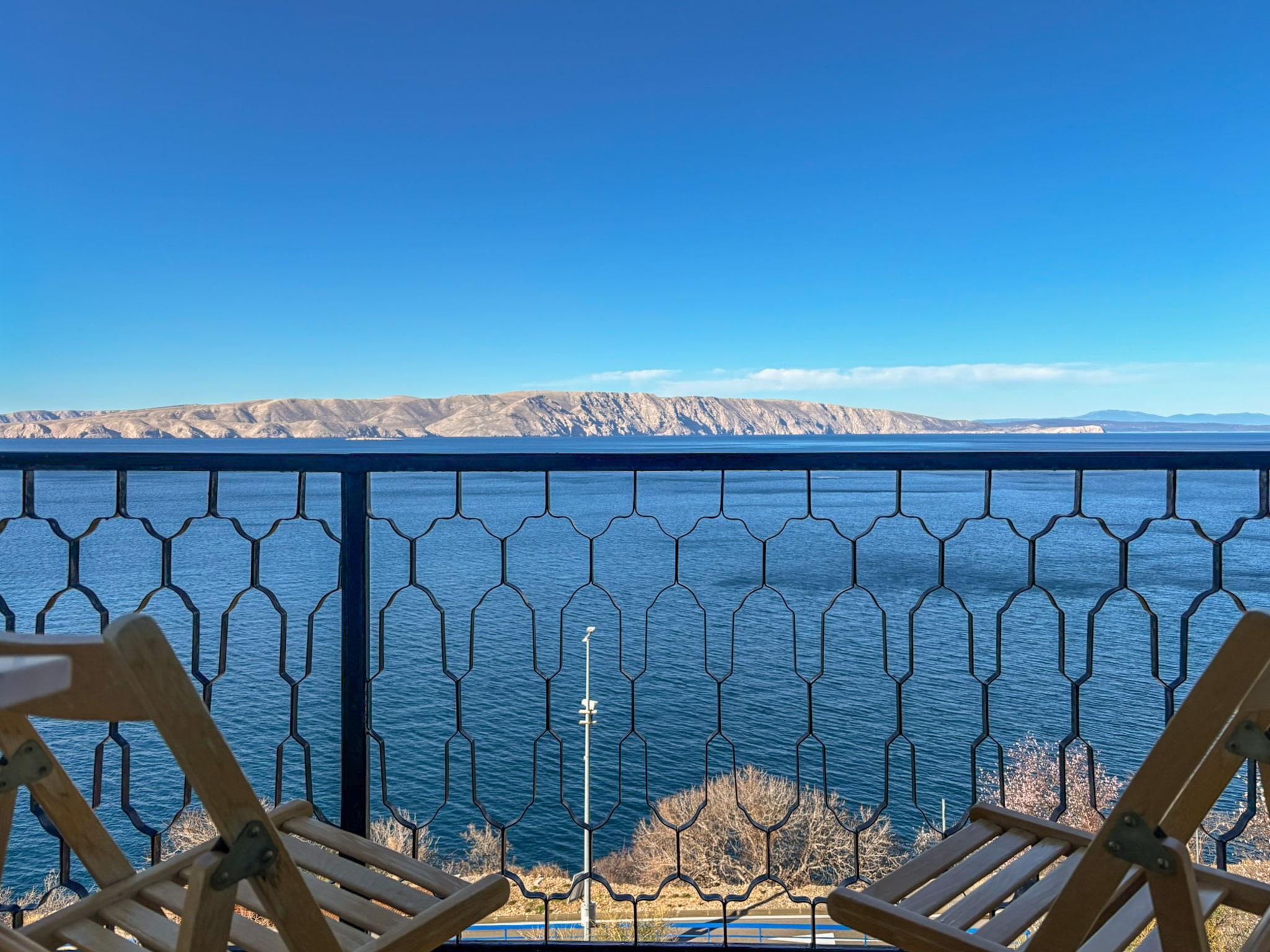 3-room apartment 96 m2 on 2nd floor. Living/dining room with satellite TV and air conditioning. Exit to the balcony. 1 room with 1 double bed (2 x 90 cm, length 200 cm). Exit to the balcony. 1 room with 2 beds (80 cm, length 200 cm), air conditioning. Open kitchen (oven, dishwasher, 4 ceramic glass hob hotplates, toaster, kettle, microwave, freezer, electric coffee machine). Bath/WC. No heating option. Balcony 10 m2, terrace 12 m2. Terrace furniture, balcony furniture. Beautiful panoramic view of the sea. Facilities: washing machine, iron, hair dryer. Internet (WiFi, free). Please note: non-smoking house. Fire extinguisher.