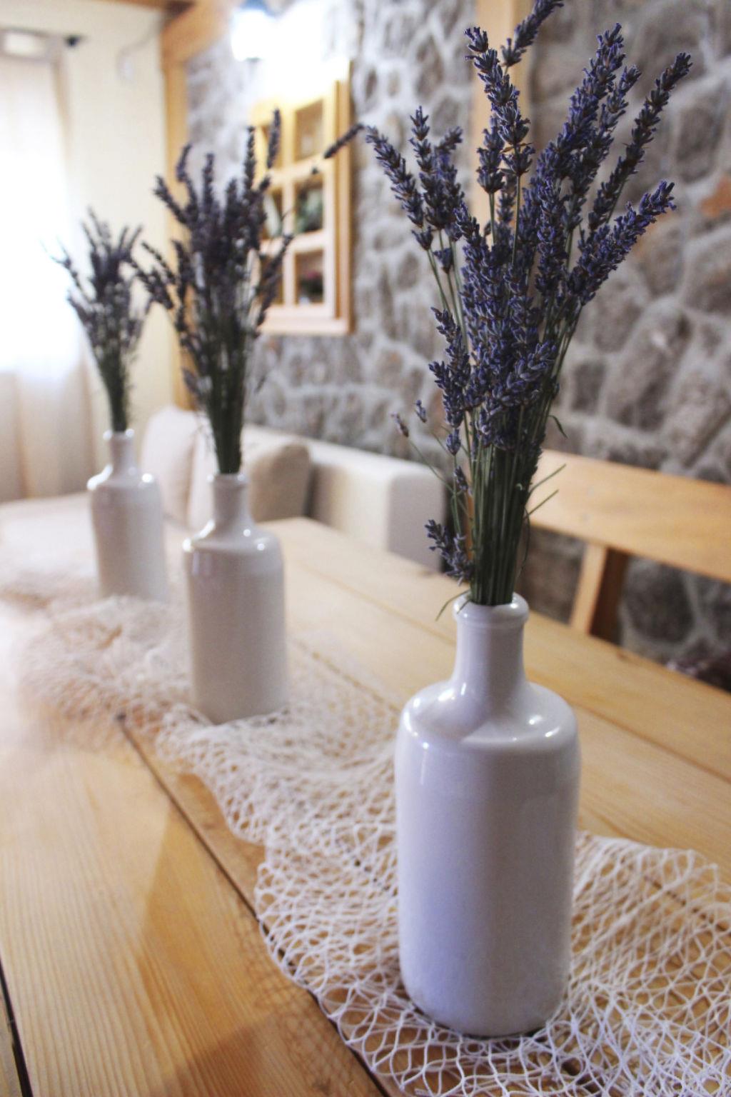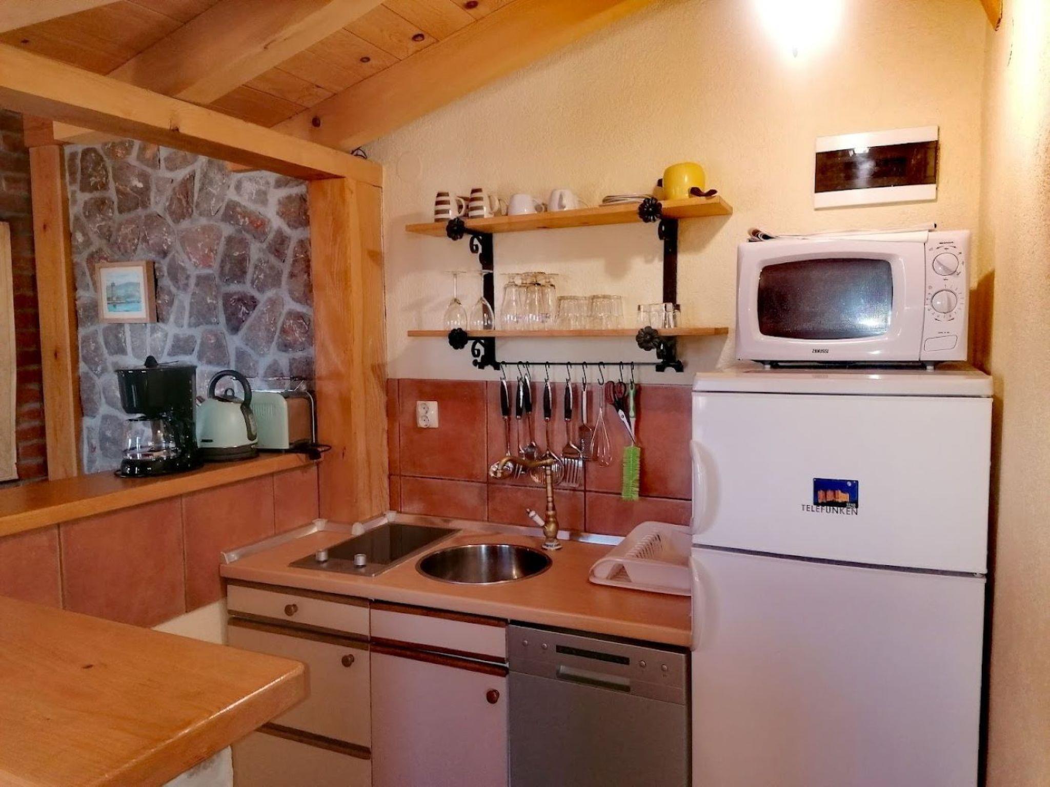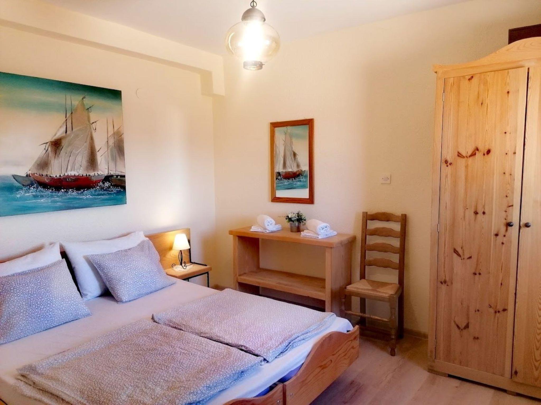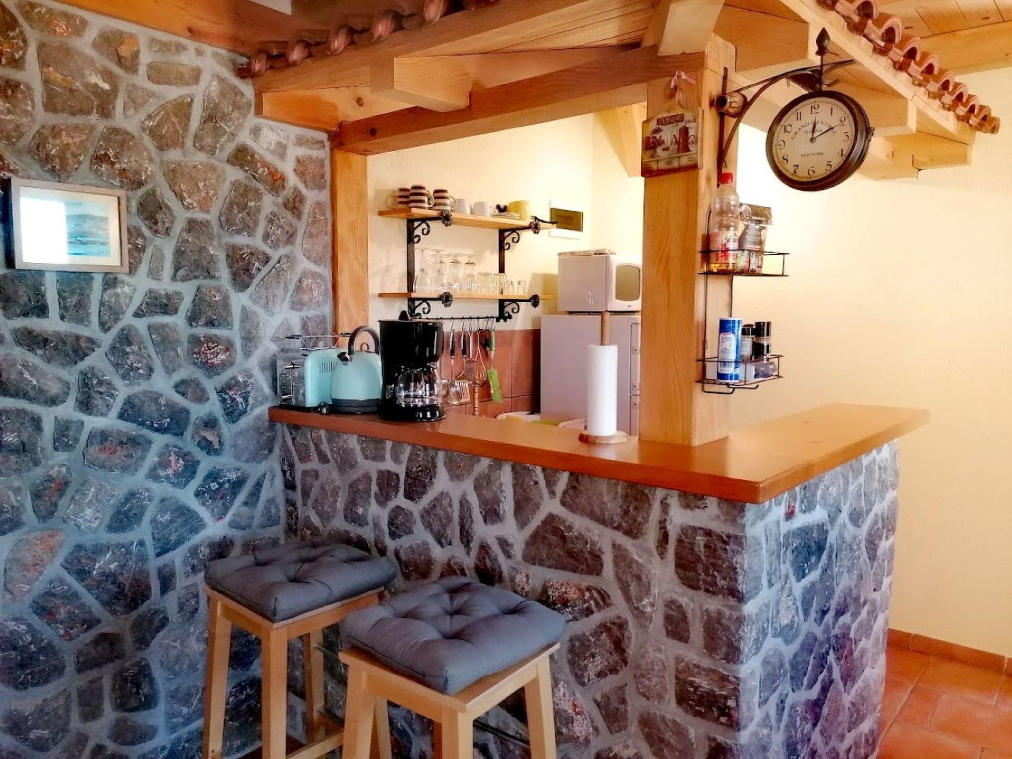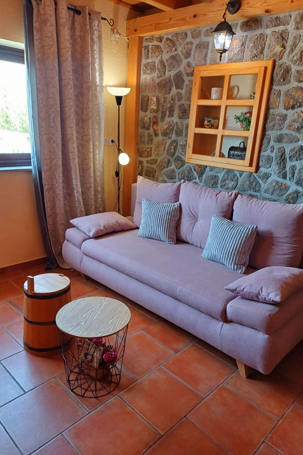 The apartment is on the ground floor of the house. It measures around 55m² and can accommodate four people. The living and dining room has a sofa bed for two people and a flatscreen TV. The dining room provides a wooden table and two matching rustic benches, which harmonise perfectly with the exposed stone walls and wooden ceiling beams. The adjoining cooking space is equipped with a kitchen counter also made of exposed brickwork, an induction hob, fridge, microwave and kettle. The cosy bedroom is furnished with a double bed 160cm wide and a wardrobe. The bathroom has a shower, WC and washbasin. Wi-Fi access is available. The air conditioning unit is in the living room and is positioned so it can cool the whole apartment.
