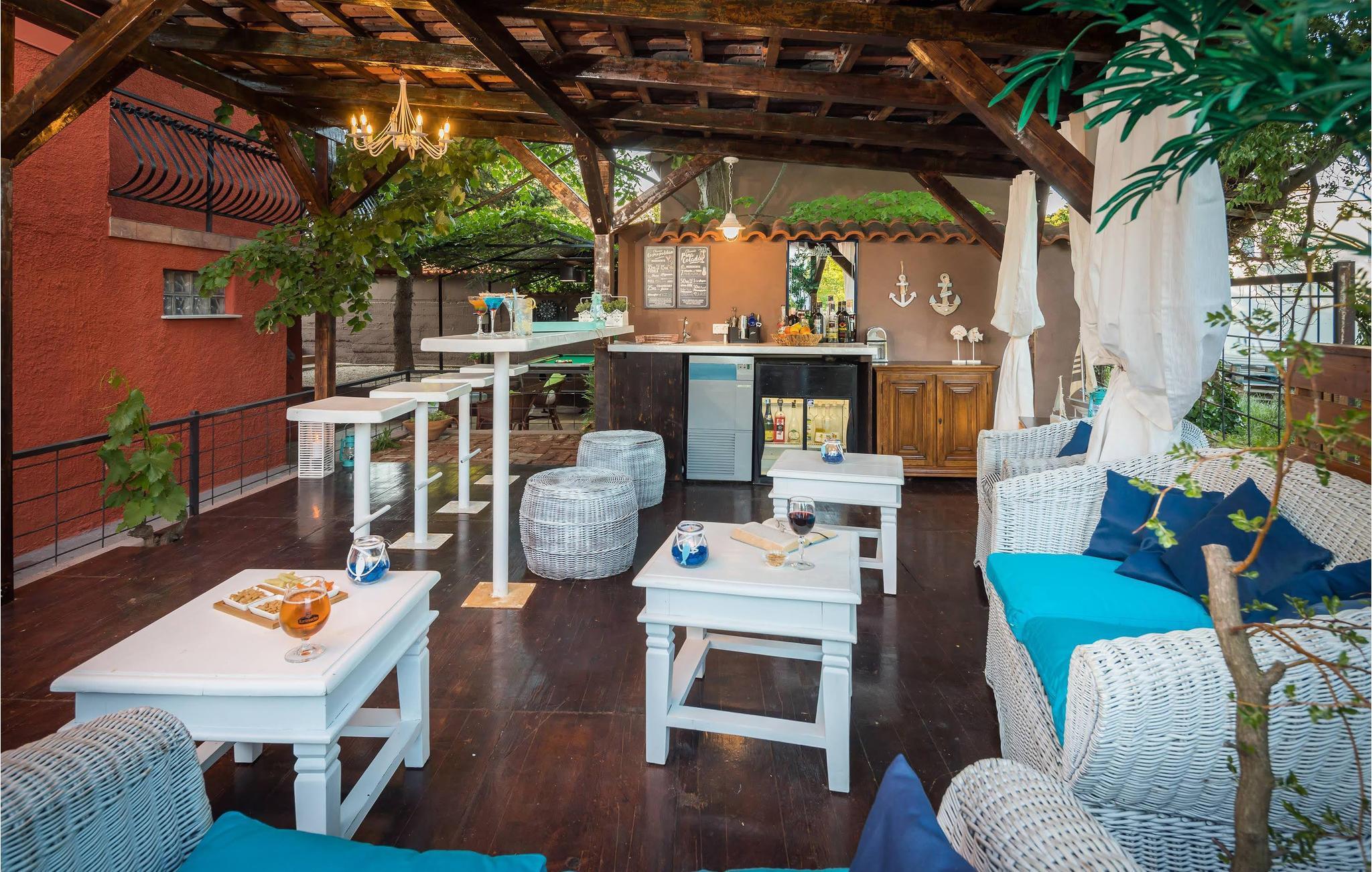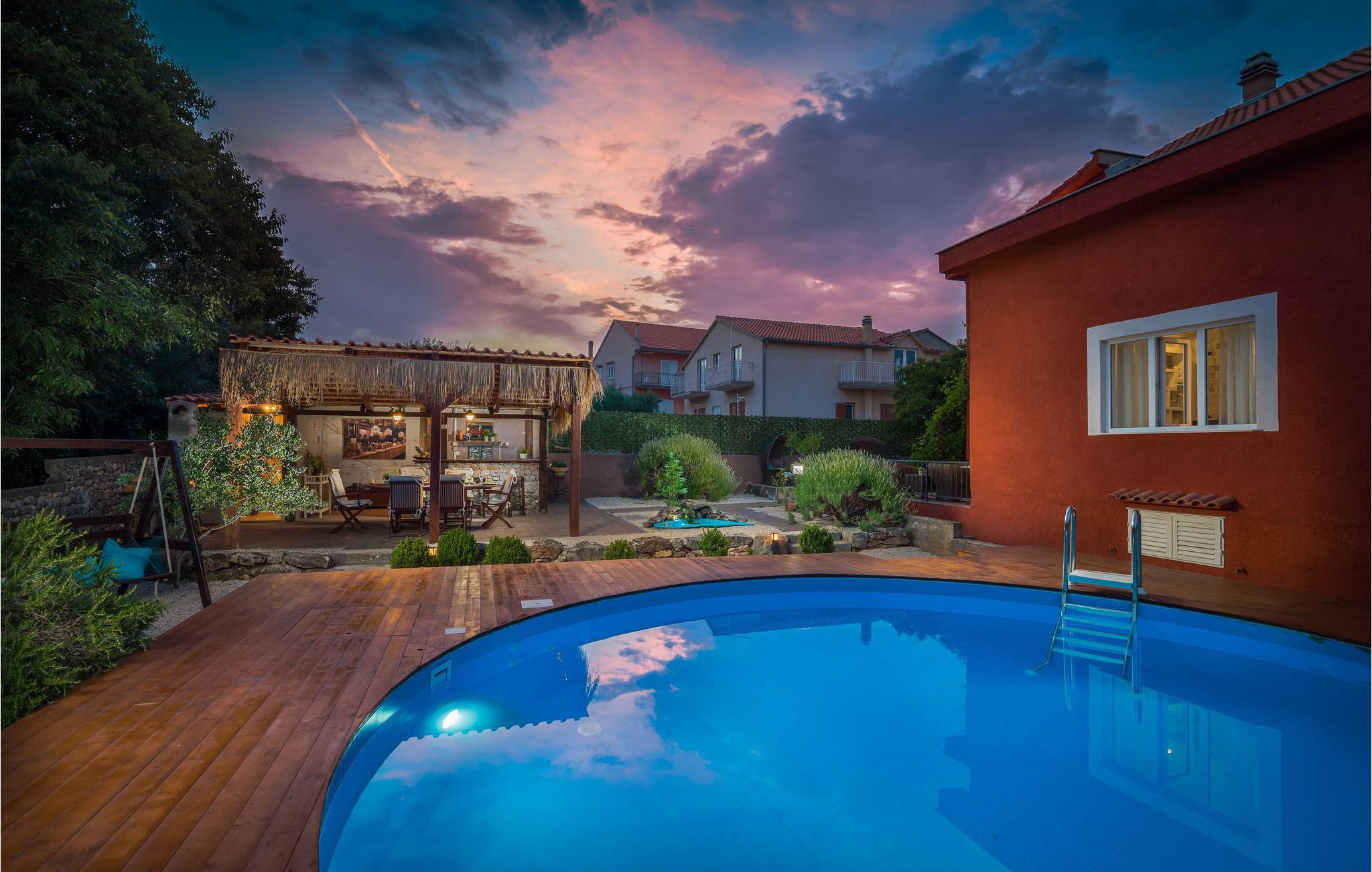 Ikke kun indendørs er huset et hit. Udenfor finder I nemlig et rummeligt område med udekøkken, bar og legeområder for børn og voksne. Her kan I glæde jer til grillaftener med hele flokken og til mange timers hygge i poolen og på solterrassen. Et par kilometer væk ligger byerne Bilice og Sibenik og den smukke Krka Nationalpark. I har meget godt at se frem til på de smukke strande ved Sibenik. Bagefter kan I slentre gennem den gamle bydel, som er rig på kulturelle seværdigheder, gode restauranter og vinbarer. Om sommeren afholdes der flere musikaftener på de små pladser i byens centrum.