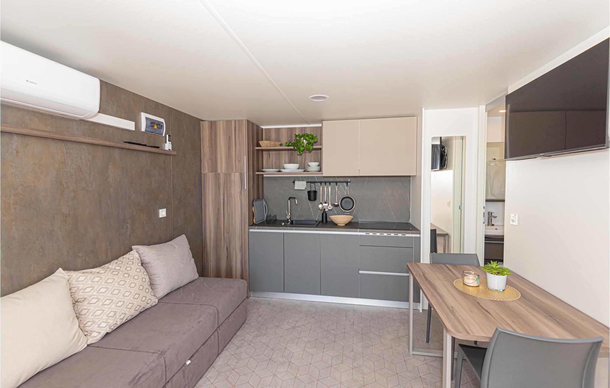 Glæd jer til dette moderne og smagfulde minihus med stor og indbydende terrasse.
