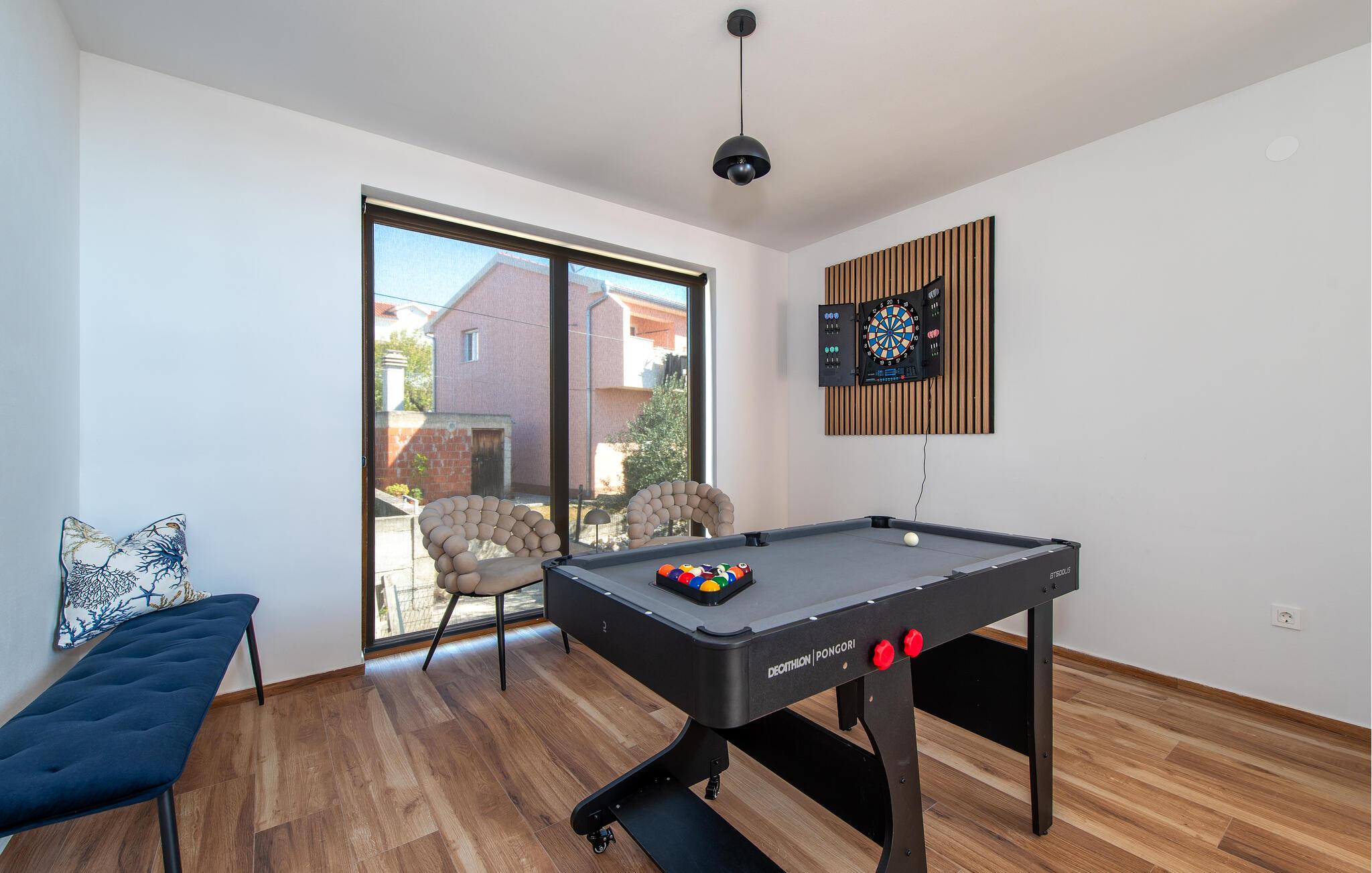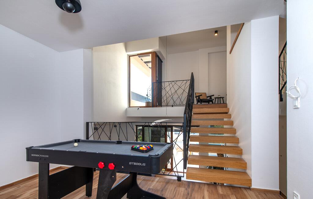 Denne stilfulde villa er noget særligt med sit moderne design, lyse værelser og varme, indbydende atmosfære. Det åbne køkken med en elegant spiseplads, materialer af høj kvalitet og direkte adgang til terrassen og poolen er perfekt til at nyde lækre måltider sammen. I den hyggelige stue med sin rummelige sofa og stilfulde detaljer kan I slappe af, streame en god serie eller spille en omgang PlayStation.