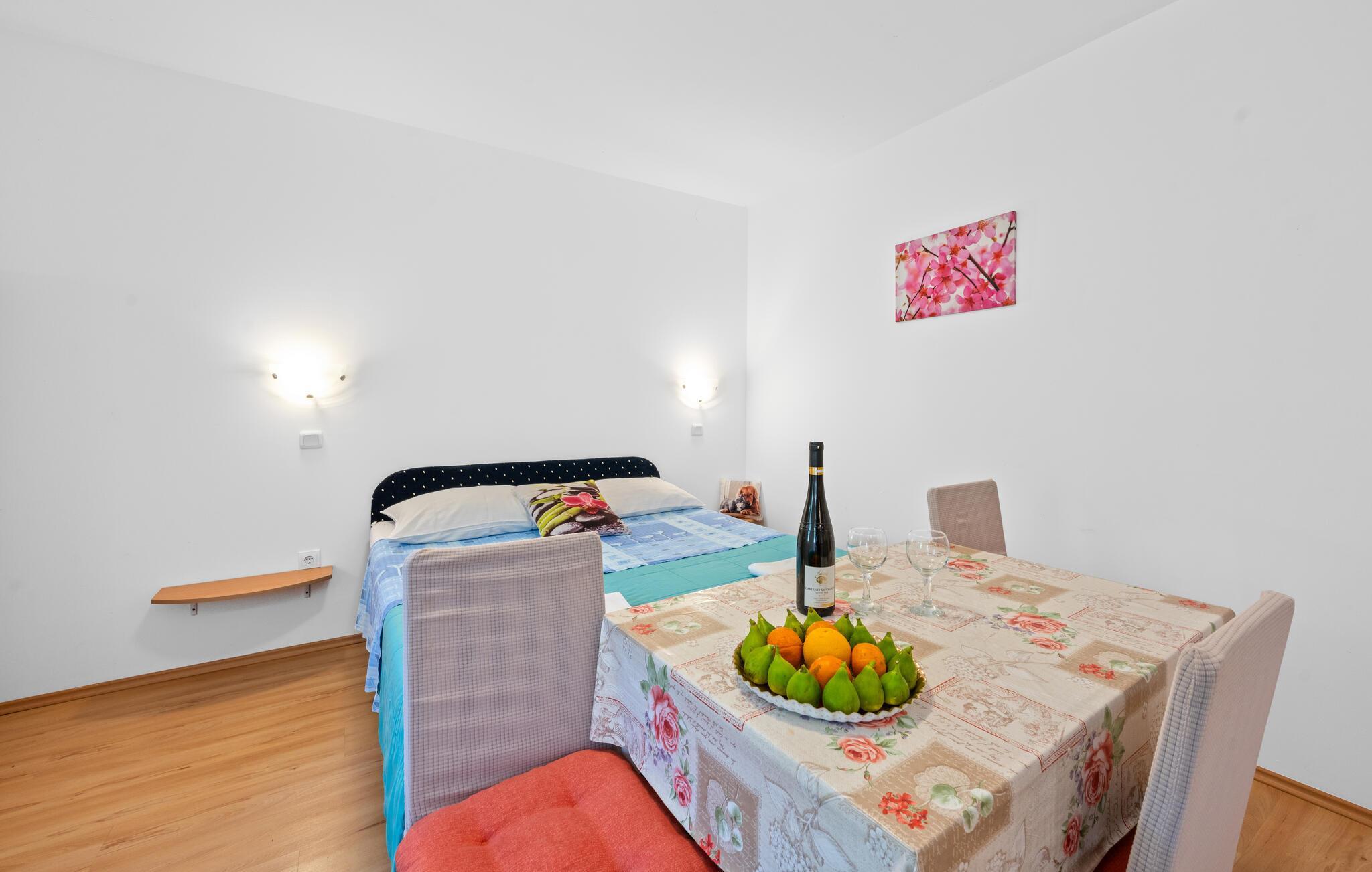 Velkommen til denn fine lejlighed, der ligger i rolige omgivelser og indbyder til et allelunde afslappende ophold. Lejligheden er funktionelt indrettet og kombinerer hygge, madlavning, måltider og nattesøvn i ét lokale, hvilket skaber en rar og hjemlig atmosfære. Det veludstyrede køkken byder på alle faciliteter, I behøver for at tilberede måltider sammen efter en herlig dag på farten.
