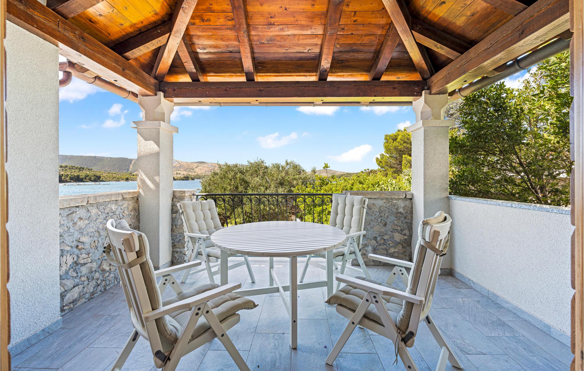 Den overdækkede terrasse er det perfekte sted at nyde morgenmaden til den flotte udsigt over havet.