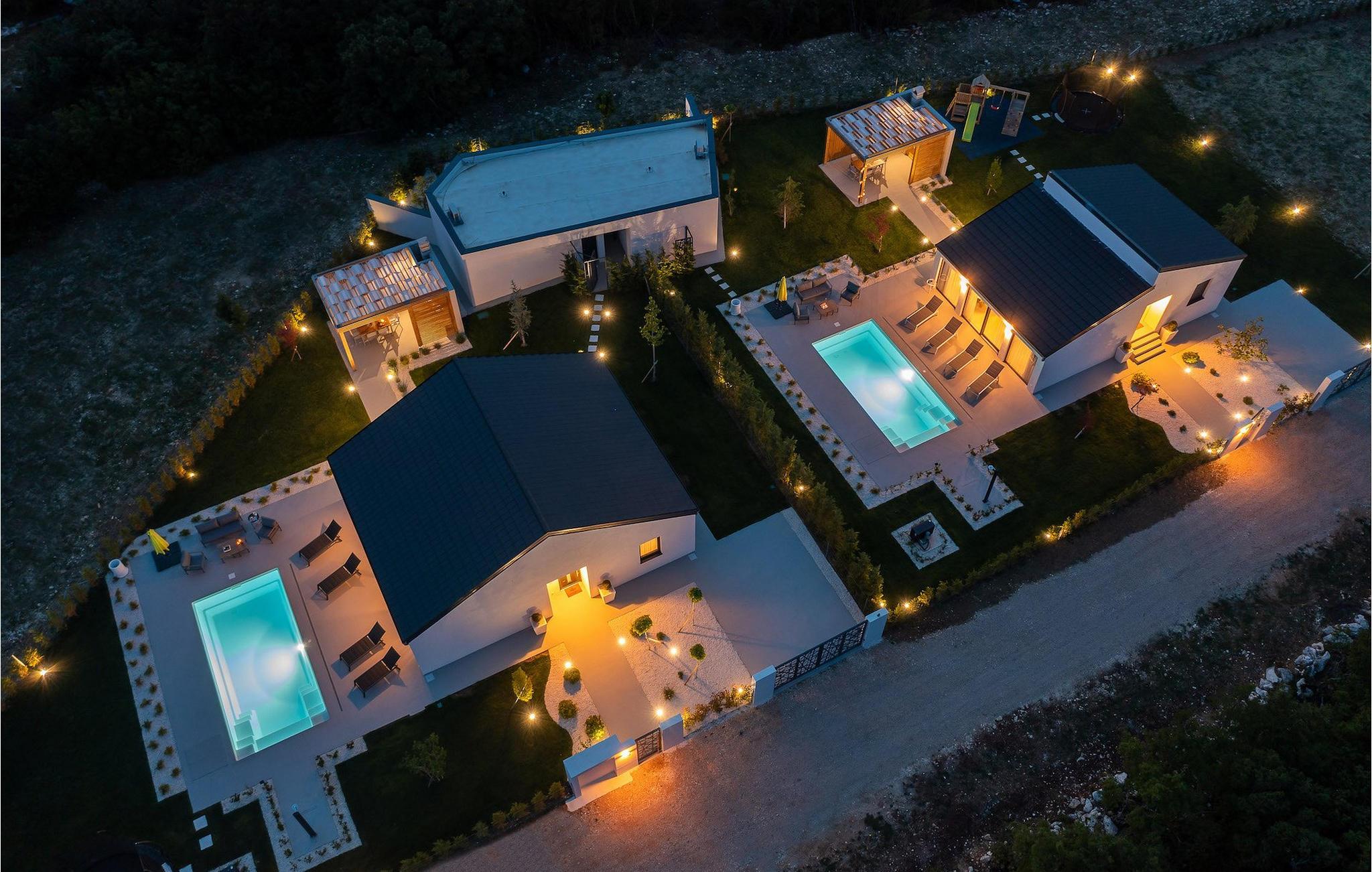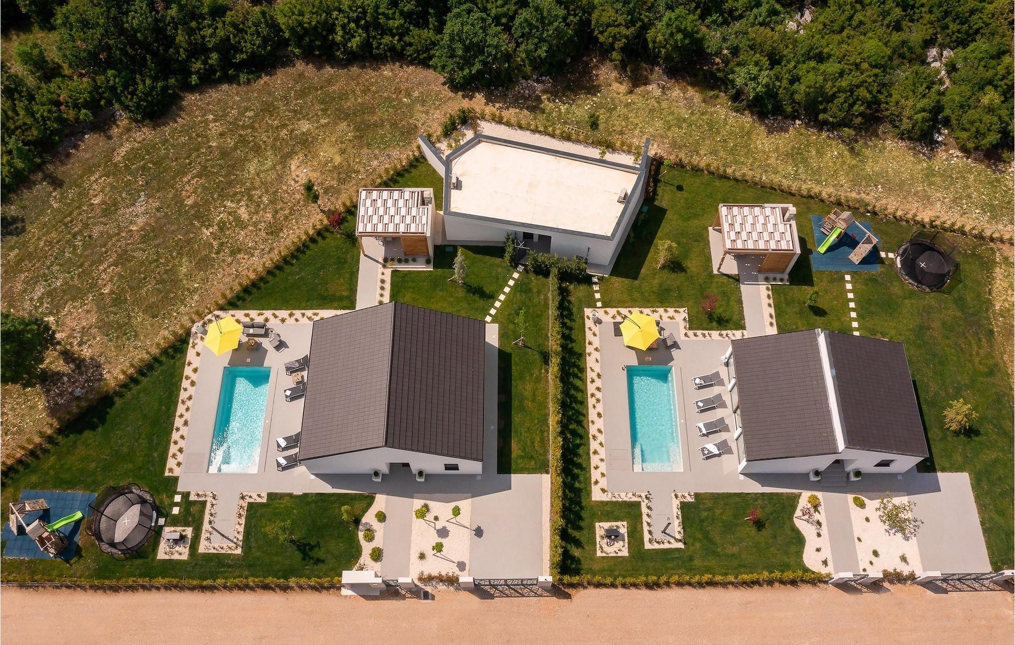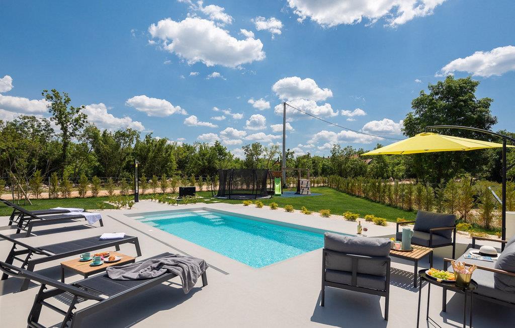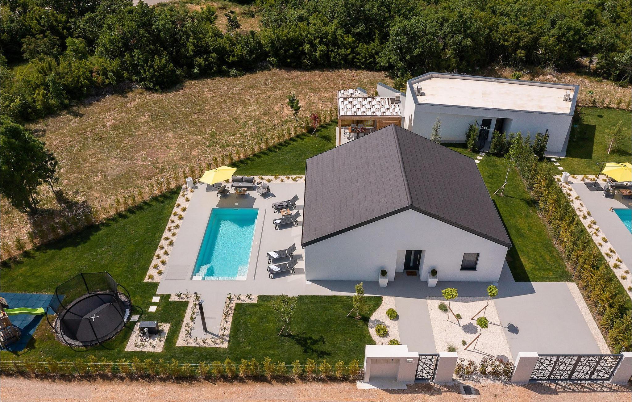 Dieses einstöckige Gebäude bietet Ihnen zwei Schlafzimmer. Ein Zimmer hat zwei Einzelbetten, die zu einem Doppelbett zusammengestellt werden können, während das andere ein Doppelbett bietet. Neben den Schlafzimmern befindet sich ein Badezimmer mit Hydromassage-Dusche. Die Villa bietet auch ein Wohnzimmer mit TV, das mit dem Esszimmer und einer voll ausgestatteten Küche verbunden ist. Für unsere kleinen Gäste steht eine PlayStation zur Verfügung. Die gesamte Villa ist mit einer zentral gelegenen Einheit klimatisiert, die das gesamte Haus abdecken kann. Vom Wohnzimmer aus haben Sie direkten Zugang zum Garten, wo Sie einen Pool und Sonnenliegen finden, auf denen Sie sich entspannen und die Sonne genießen können. Im Garten gibt es auch eine überdachte Terrasse mit Grill, wo Sie köstliche Gerichte zubereiten können, sowie einen Esstisch. In einem Teil des Gartens gibt es eine Ecke für die jüngsten Gäste mit einem Trampolin und einem Kinderspielplatz. Für Gäste, die einen aktiven Urlaub suchen, stehen auf Anfrage Fahrräder und eine Tischtennisplatte zur Verfügung. Im Garten der Villa gibt es eine separate Einrichtung mit Wellnessbereich, wo Sie sich in der Sauna und im Whirlpool entspannen können, sowie ein Fitnessstudio mit verschiedenen Geräten, die Ihnen zur Verfügung stehen. Es gibt auch eine Wäschekammer im selben Gebäude. Der Wellnessbereich, der Fitnessraum und die Wäschekammer werden mit den Gästen der Villa Lu geteilt, die sich direkt hinter der Villa befindet. Das Grundstück ist komplett eingezäunt und verfügt über einen privaten Parkplatz für 2 Autos. Buchen Sie Ihre Unterkunft in Villa Le und verbringen Sie einen unvergesslichen Urlaub mit Freunden und Familie.Die Villa Le befindet sich in der kleinen Stadt Oklaj in Dalmatien und ist ein ausgezeichneter Ausgangspunkt, um die Umgebung zu erkunden. Dalmatien ist bekannt für seine wunderschöne Küste und seine Inseln, aber auch das Landesinnere verdient Aufmerksamkeit. 15 km von der Villa entfernt liegt Knin, eine Stadt, die für ihre beeindruckende Festung bekannt ist. Die Festung liegt auf 345 m über dem Meeresspiegel und bietet einen wunderbaren Ausblick auf die Stadt und ihre Umgebung.