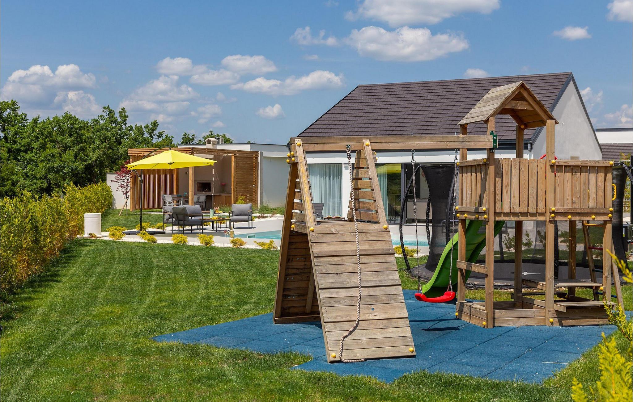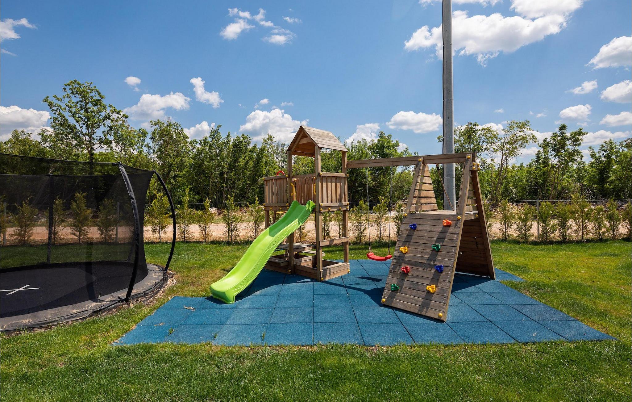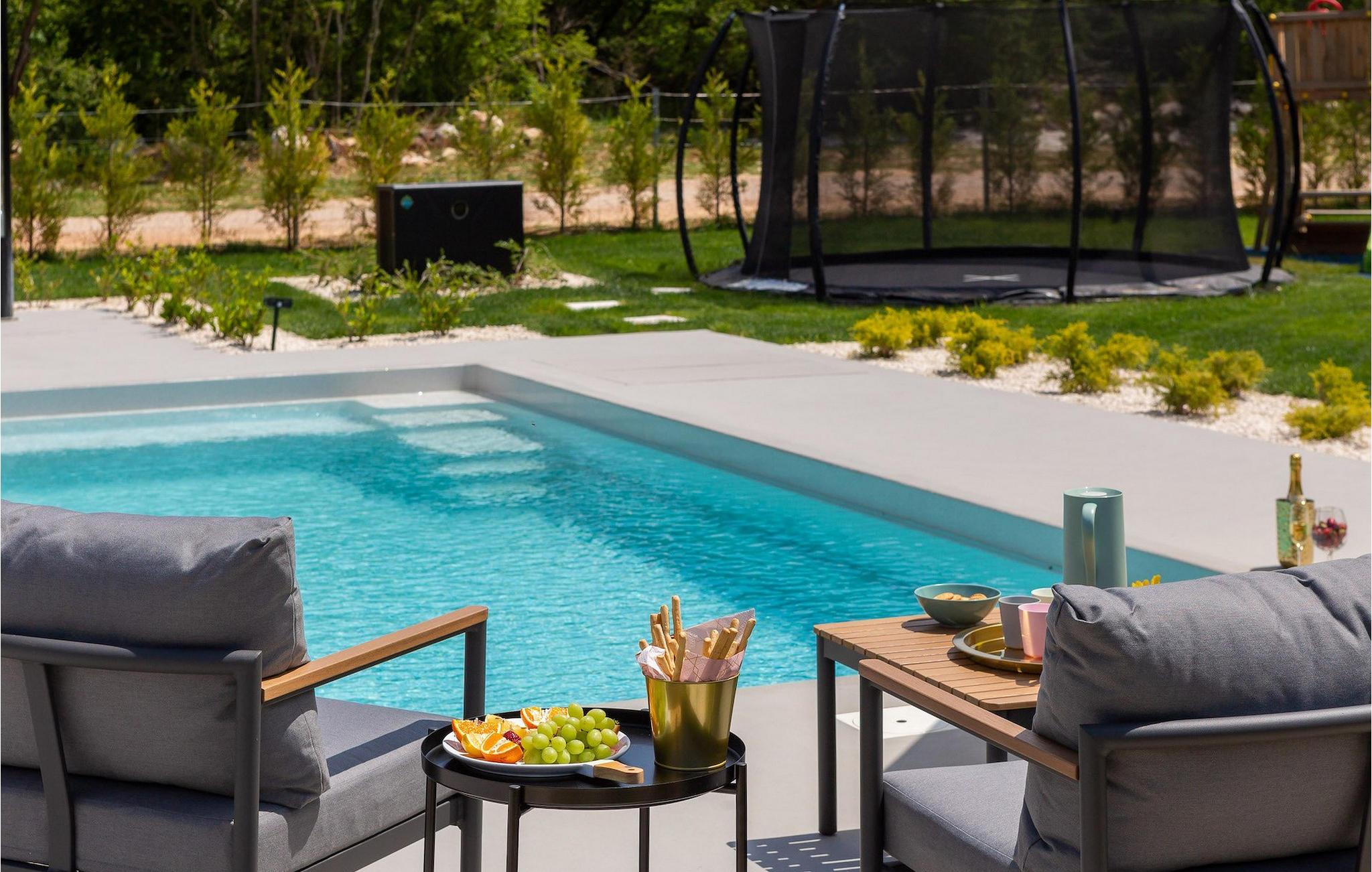 Dieses einstöckige Gebäude bietet Ihnen zwei Schlafzimmer. Ein Zimmer hat zwei Einzelbetten, die zu einem Doppelbett zusammengestellt werden können, während das andere ein Doppelbett bietet. Neben den Schlafzimmern befindet sich ein Badezimmer mit Hydromassage-Dusche. Die Villa bietet auch ein Wohnzimmer mit TV, das mit dem Esszimmer und einer voll ausgestatteten Küche verbunden ist. Für unsere kleinen Gäste steht eine PlayStation zur Verfügung. Die gesamte Villa ist mit einer zentral gelegenen Einheit klimatisiert, die das gesamte Haus abdecken kann. Vom Wohnzimmer aus haben Sie direkten Zugang zum Garten, wo Sie einen Pool und Sonnenliegen finden, auf denen Sie sich entspannen und die Sonne genießen können. Im Garten gibt es auch eine überdachte Terrasse mit Grill, wo Sie köstliche Gerichte zubereiten können, sowie einen Esstisch. In einem Teil des Gartens gibt es eine Ecke für die jüngsten Gäste mit einem Trampolin und einem Kinderspielplatz. Für Gäste, die einen aktiven Urlaub suchen, stehen auf Anfrage Fahrräder und eine Tischtennisplatte zur Verfügung. Im Garten der Villa gibt es eine separate Einrichtung mit Wellnessbereich, wo Sie sich in der Sauna und im Whirlpool entspannen können, sowie ein Fitnessstudio mit verschiedenen Geräten, die Ihnen zur Verfügung stehen. Es gibt auch eine Wäschekammer im selben Gebäude. Der Wellnessbereich, der Fitnessraum und die Wäschekammer werden mit den Gästen der Villa Lu geteilt, die sich direkt hinter der Villa befindet. Das Grundstück ist komplett eingezäunt und verfügt über einen privaten Parkplatz für 2 Autos. Buchen Sie Ihre Unterkunft in Villa Le und verbringen Sie einen unvergesslichen Urlaub mit Freunden und Familie.Die Villa Le befindet sich in der kleinen Stadt Oklaj in Dalmatien und ist ein ausgezeichneter Ausgangspunkt, um die Umgebung zu erkunden. Dalmatien ist bekannt für seine wunderschöne Küste und seine Inseln, aber auch das Landesinnere verdient Aufmerksamkeit. 15 km von der Villa entfernt liegt Knin, eine Stadt, die für ihre beeindruckende Festung bekannt ist. Die Festung liegt auf 345 m über dem Meeresspiegel und bietet einen wunderbaren Ausblick auf die Stadt und ihre Umgebung.