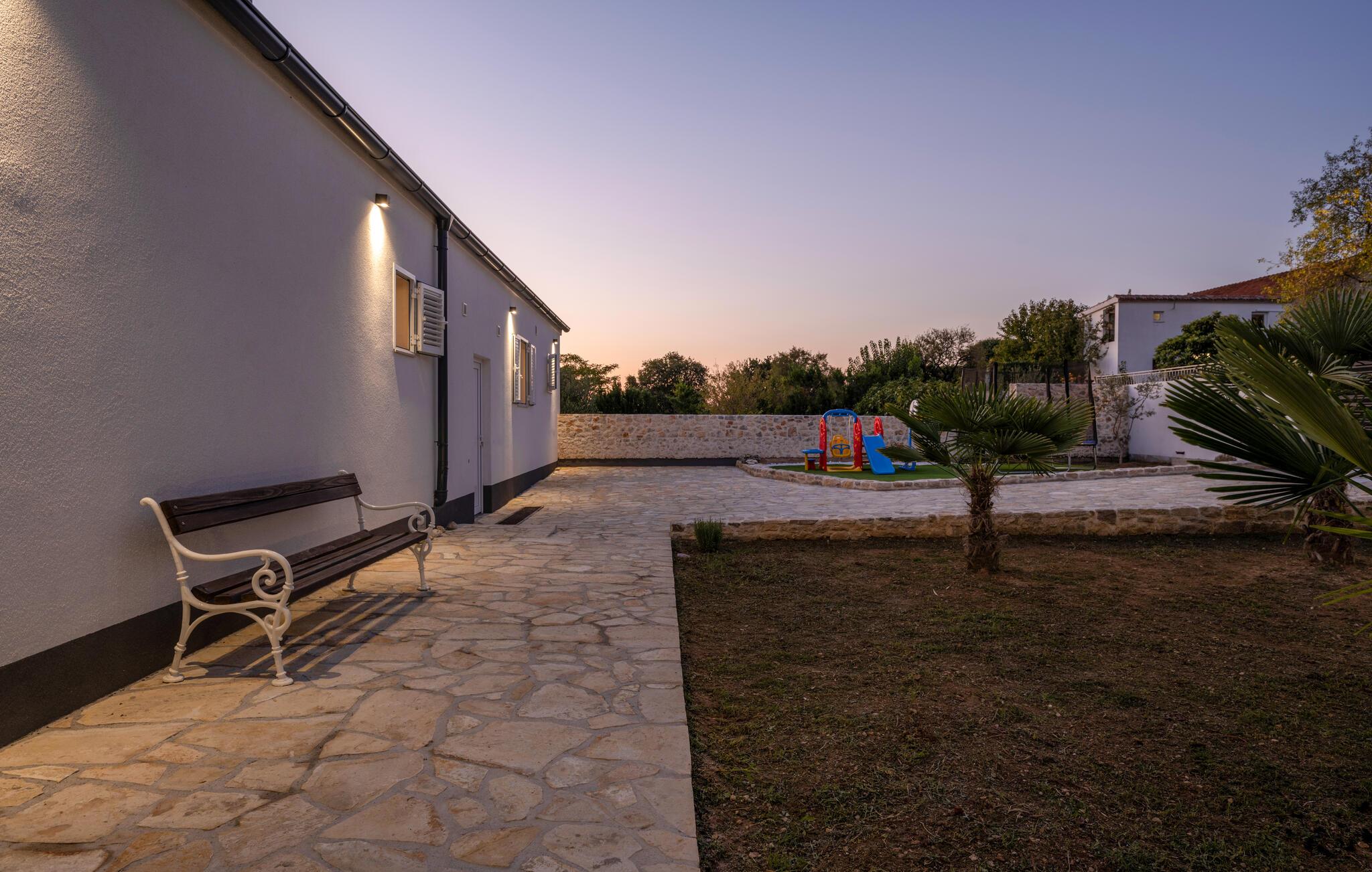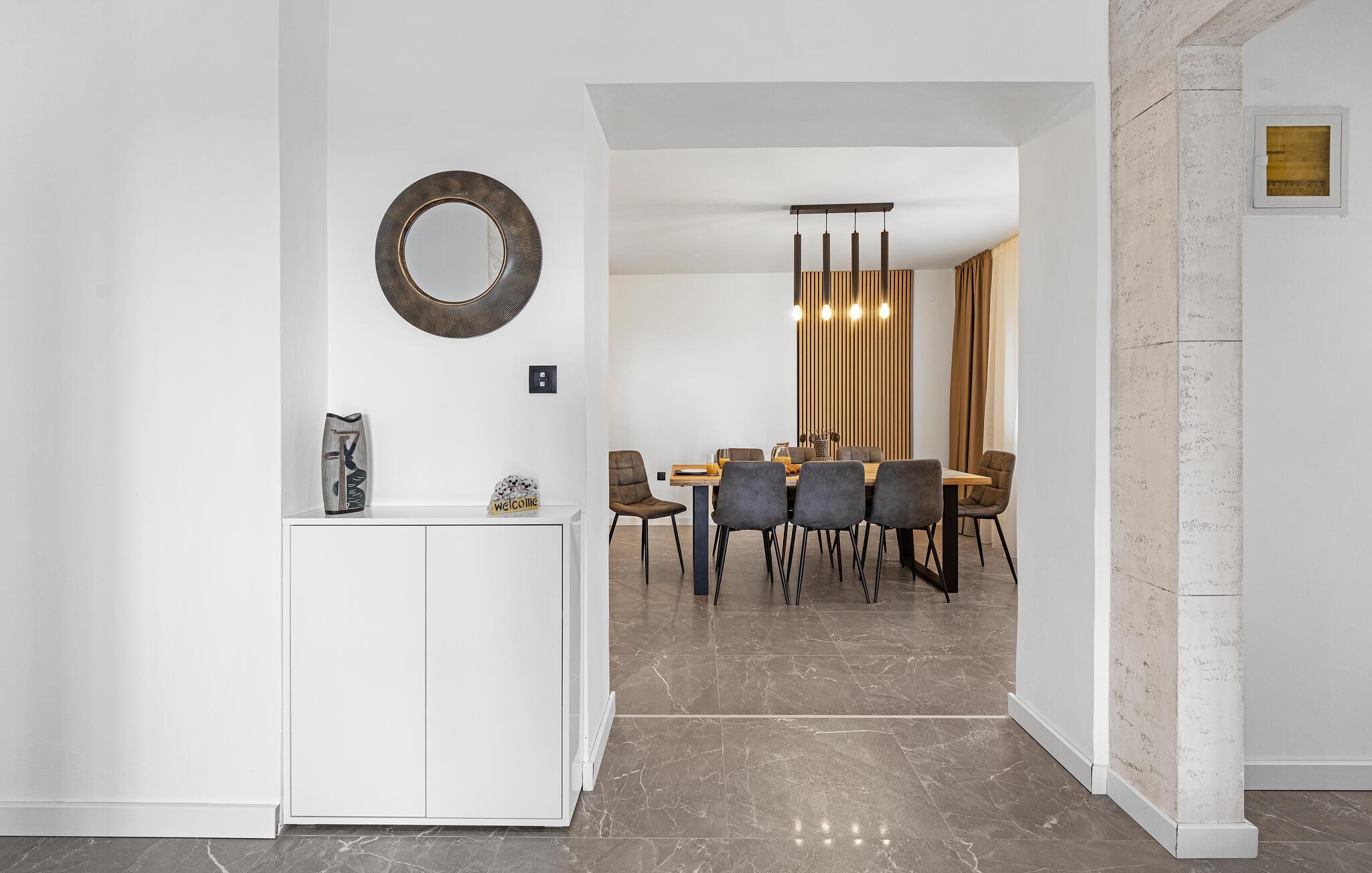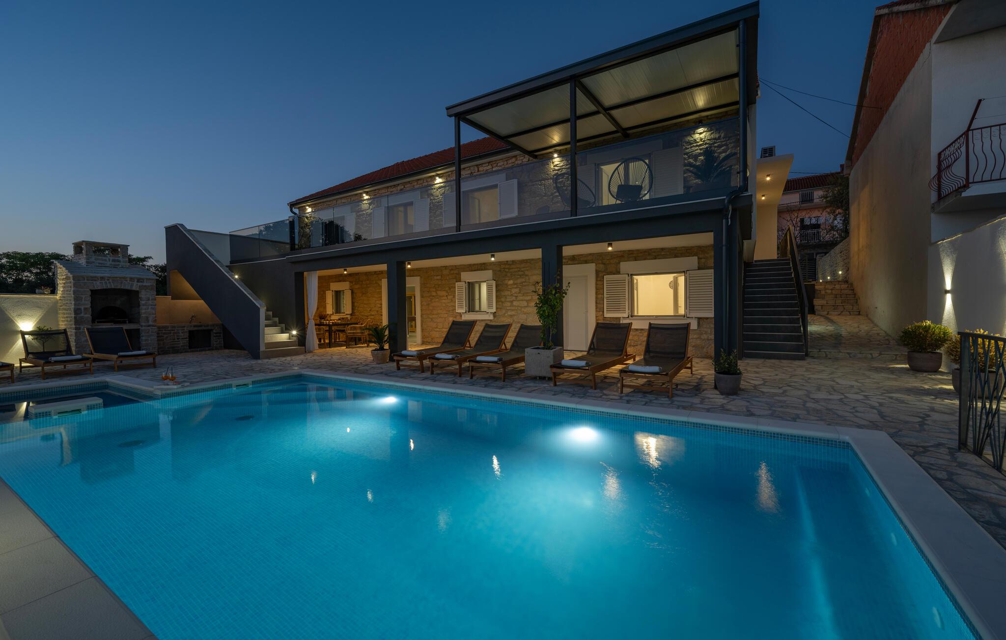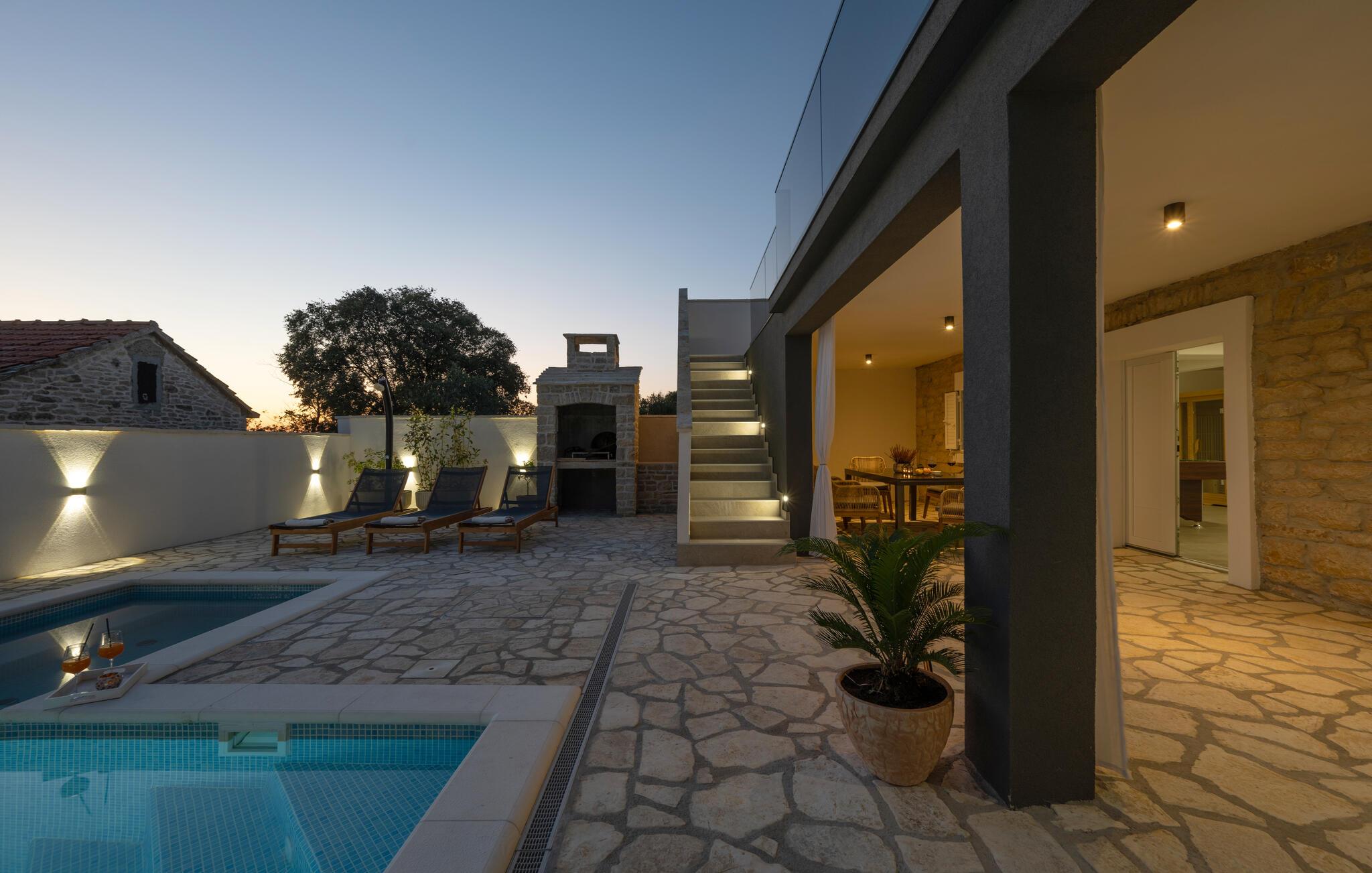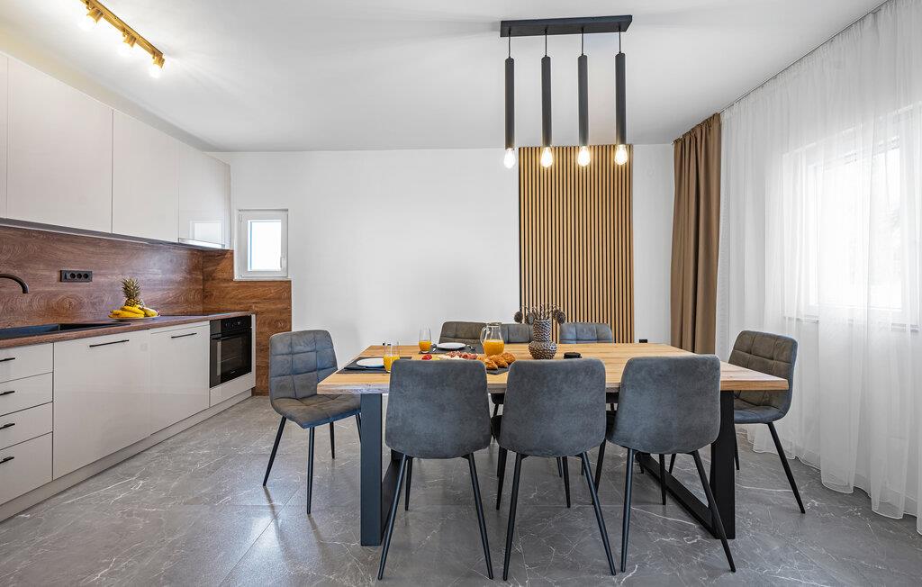 Nyd en afslappende ferie i dette moderne feriehus i Plastovo, en charmerende landsby ikke langt fra Krka Nationalpark. Dette elegante hjem har et strejf af luksus. Slap af på den store terrasse, som er udstyret med en rummelig pool og komfortable liggestole. Begynd jeres dage med et frisk hop i det kølige vand og nyd de fredelige omgivelser. Husets stilfulde interiør lægger op til at nyde livet og have det rart. Find jer godt til rette i den komfortable sofa i stuen og nyd den moderne indretning. I det veludstyrede køkken kan I tilberede jeres ferieretter og nyde dem ved spisebordet med familie eller venner.