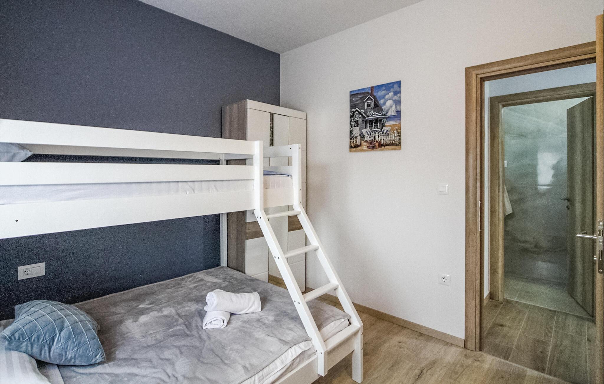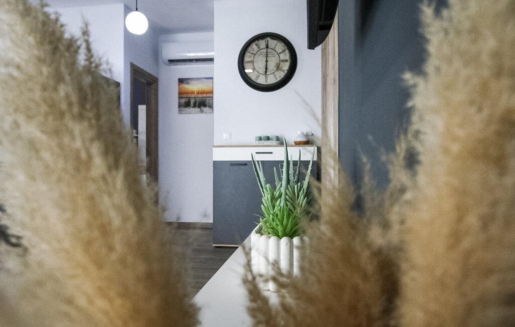 Det moderne og rummelige interiør med elegante linjer og traditionel charme er det optimale valg for familier eller vennegrupper. Bløde farver og tilføjelsen af ??træ forstærker den afslappede atmosfære. Den luftige stue, der er forbundet med det elegante køkken, giver et behageligt miljø til socialt samvær.
