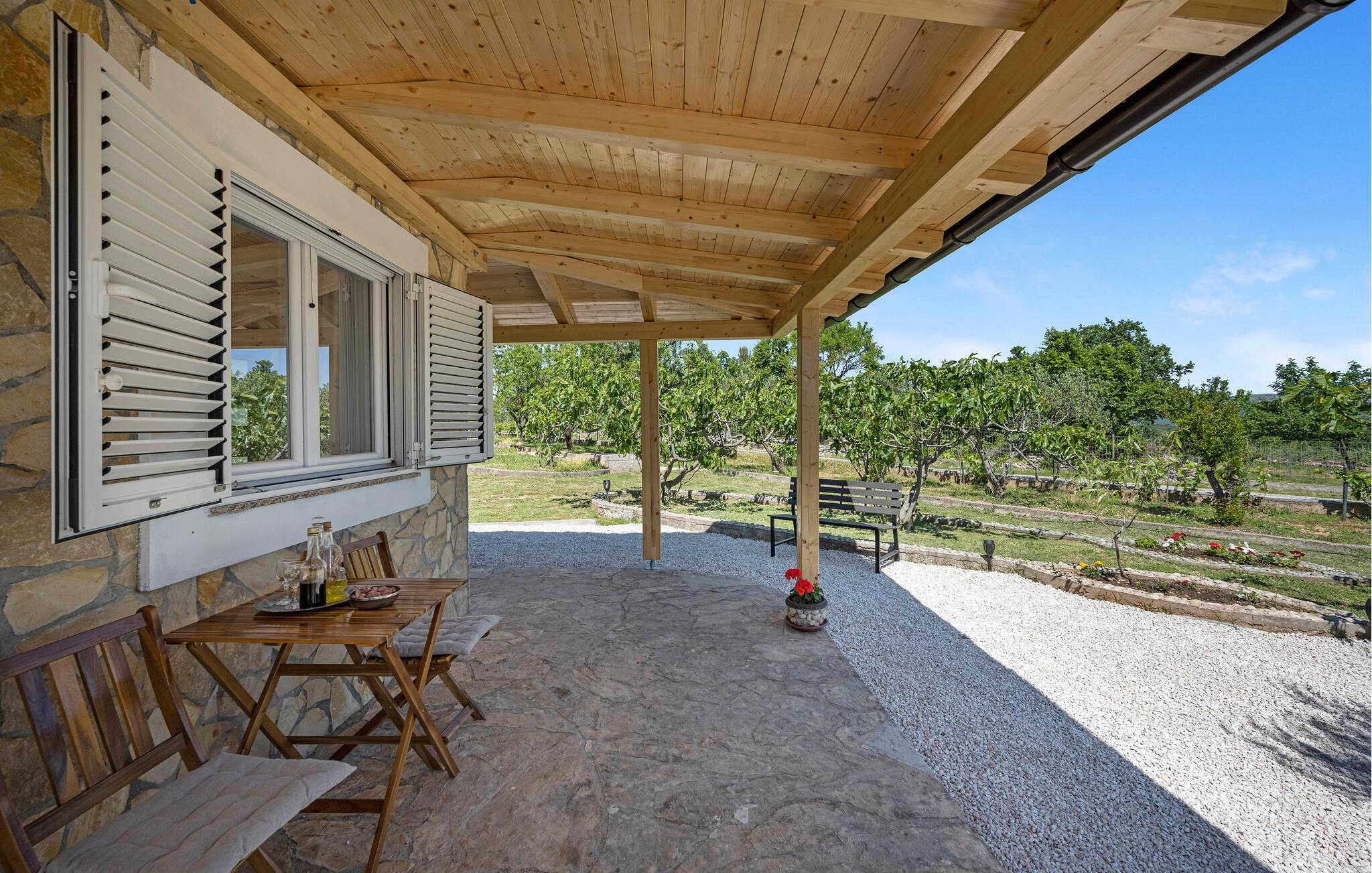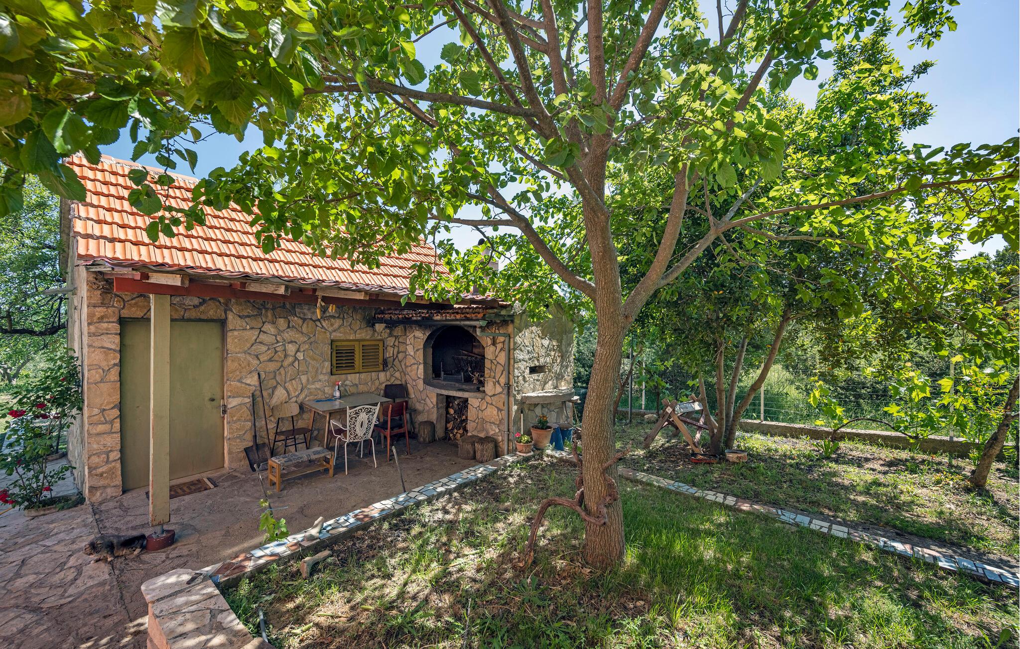 Brug den overdækkede terrasse til morgenmad og et spil petanque. Lyt til fuglesang på et idyllisk sted i haven og hyg jer om aftenen ved den fælles grill.