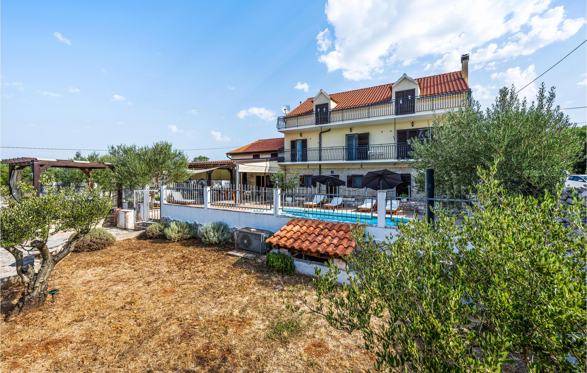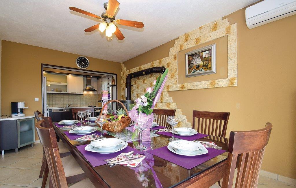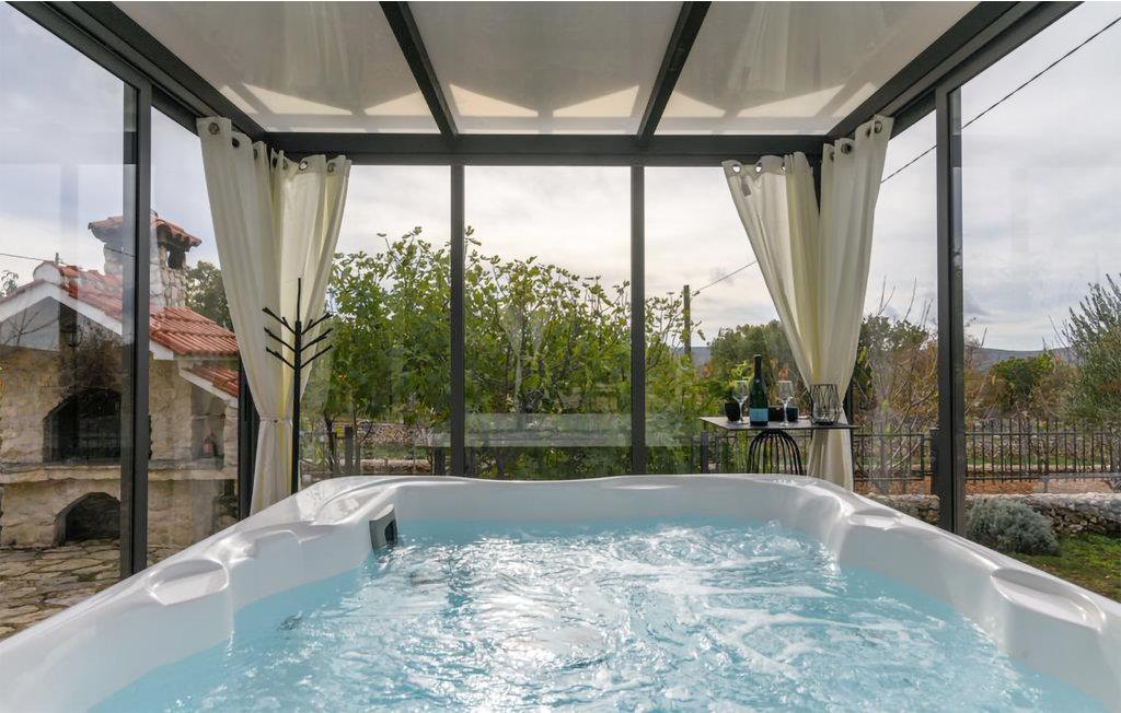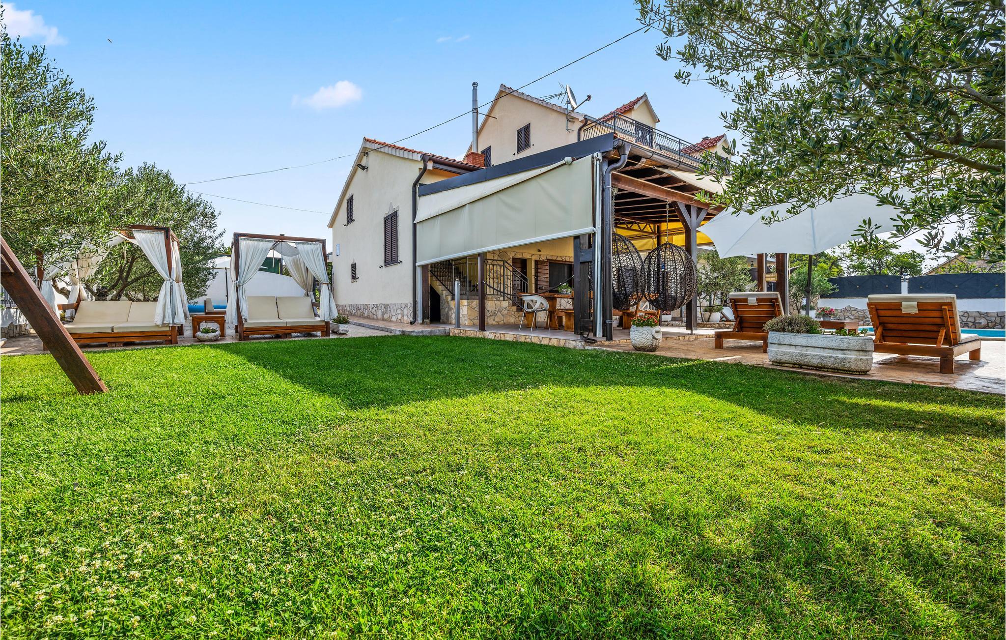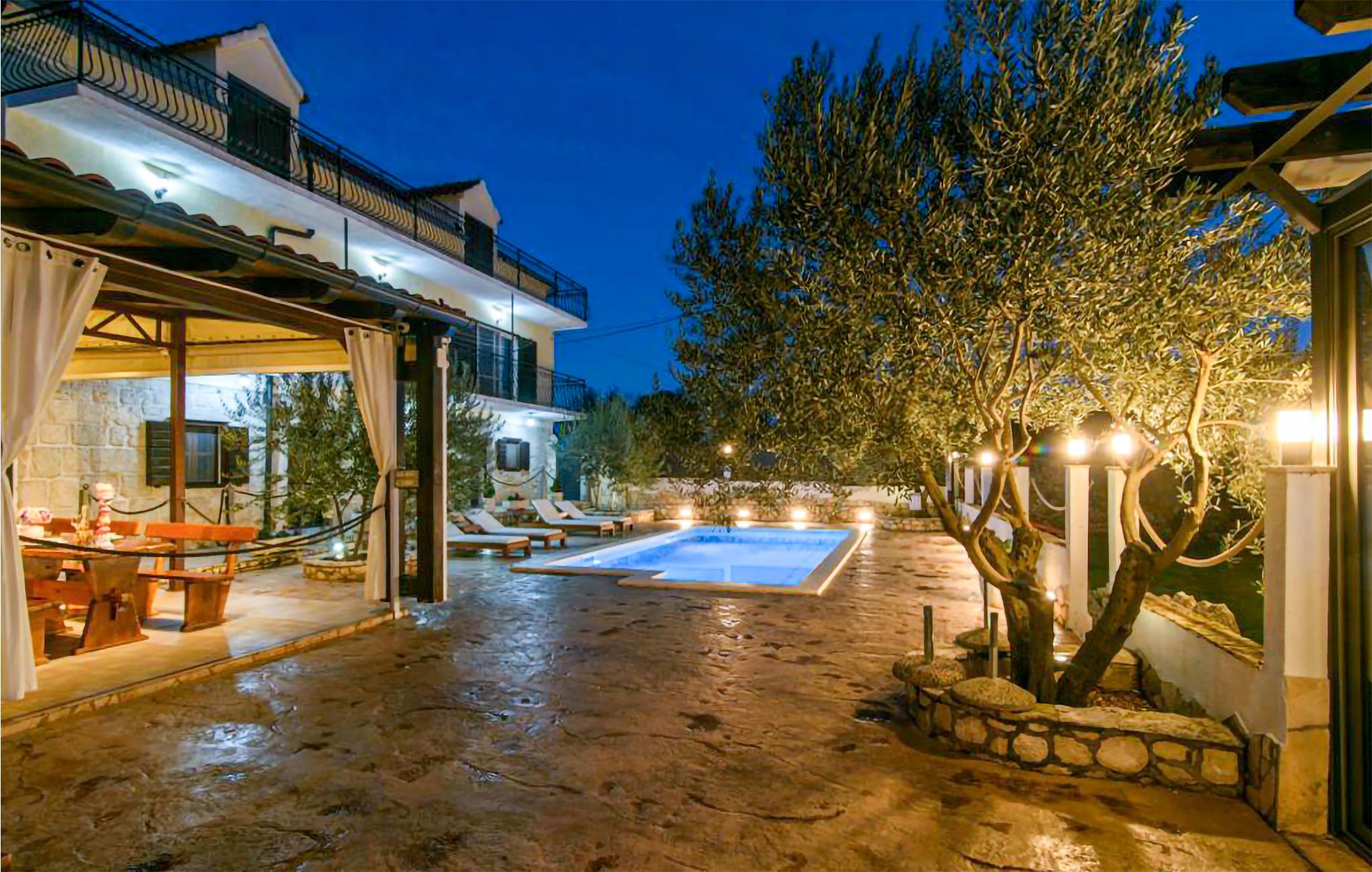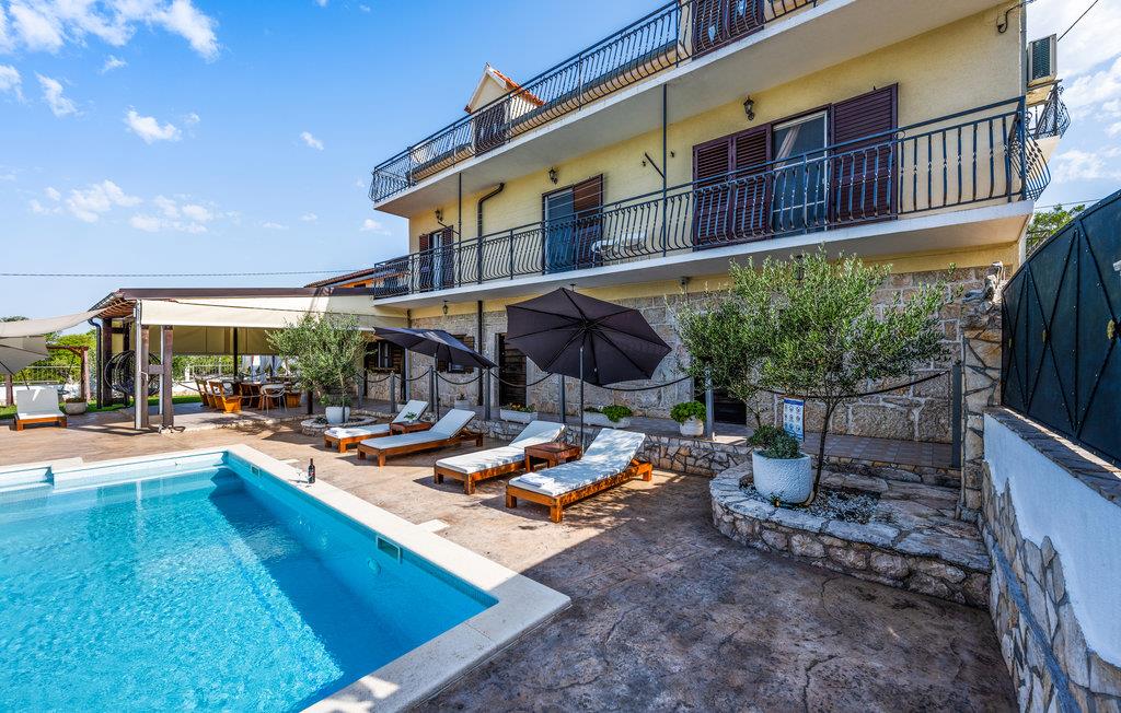 Eksklusivt feriehus i idylliske omgivelser med skøn udsigt over den uberørte natur og til fantastiske solnedgange. Oplev en komfortabelt og afslappet ferie, da dette hus indeholder alt hvad I kan drømme om. I kan slappe af på liggestolene i skyggen af oliventræerne, eller sole jer på kanten af den opvarmede udendørs pool. På sportspladsen kan I spille både badminton og volleyball med vennerne og børnene. De mindre børn kan lege på legepladsen med trampolin, til de voksne er der dart og billard. I kan også slappe af i whirlpoolen og saunaen. Nyd udsigten fra den overdækkede terrasse og tilbered nem og lækker mad på grillen. Den store grund er helt indhegnet, her er meget ugenert. Kør i bil til den berømte sandstrand Solaris og besøg naturparken Krka, hvis naturskønhed er legendarisk. I kan købe biodynamisk frugt og grønt, æselmælk og lammekød hos husets ejer.