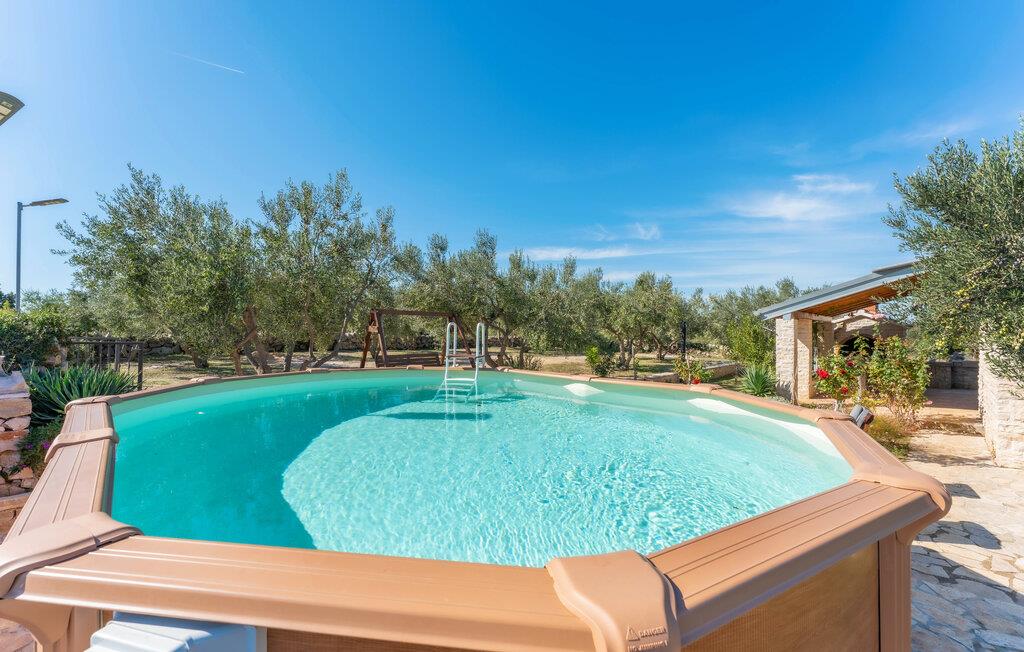 Udendørs venter en privat pool, ideel til en afkøling på varme sommerdage. Gør jer det behageligt på liggestolene i haven og nyd roen i de omkringliggende omgivelser. En fælles grillplads med spisebord sikrer hyggelige aftener og lækre måltider under åben himmel.