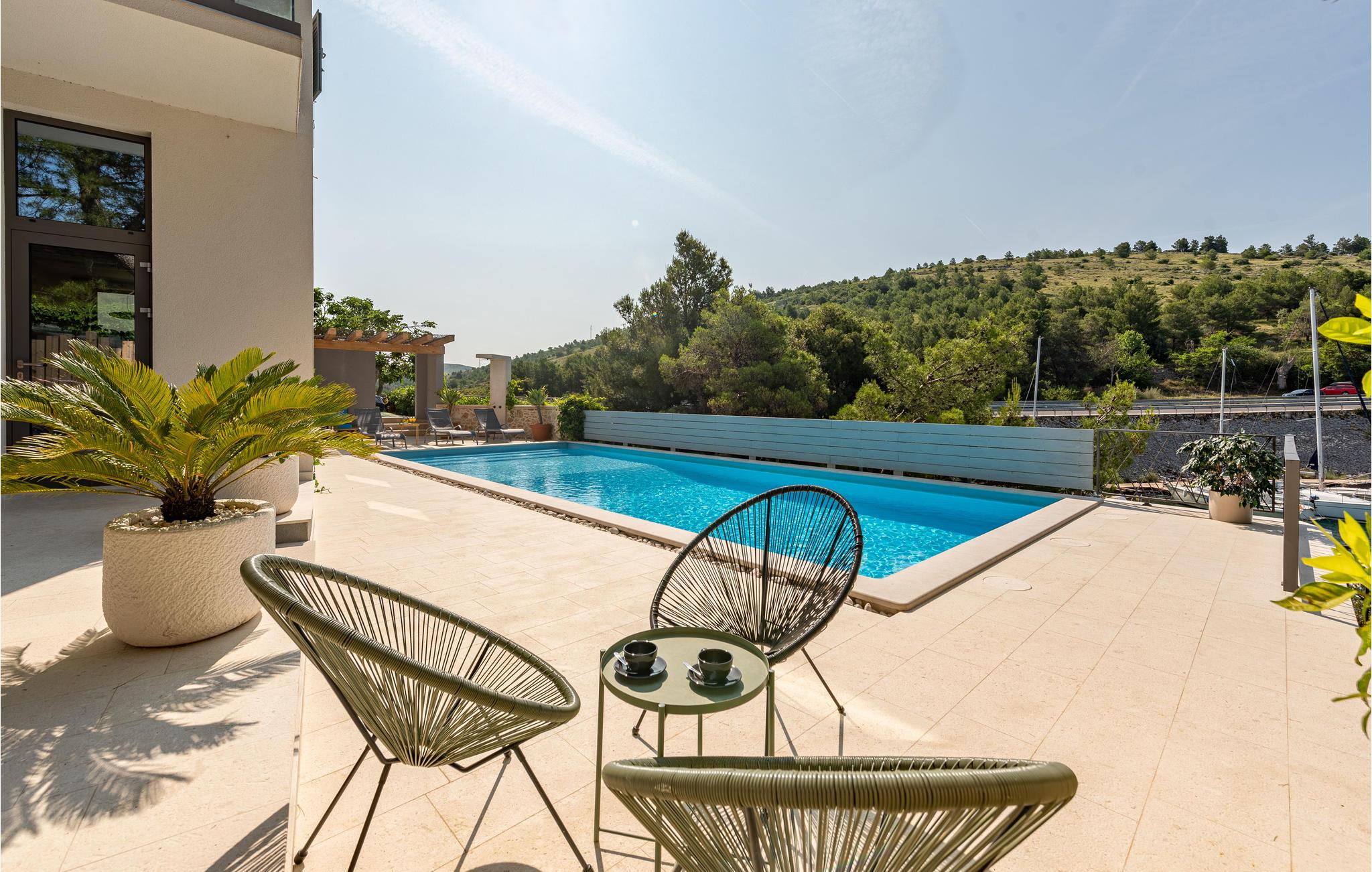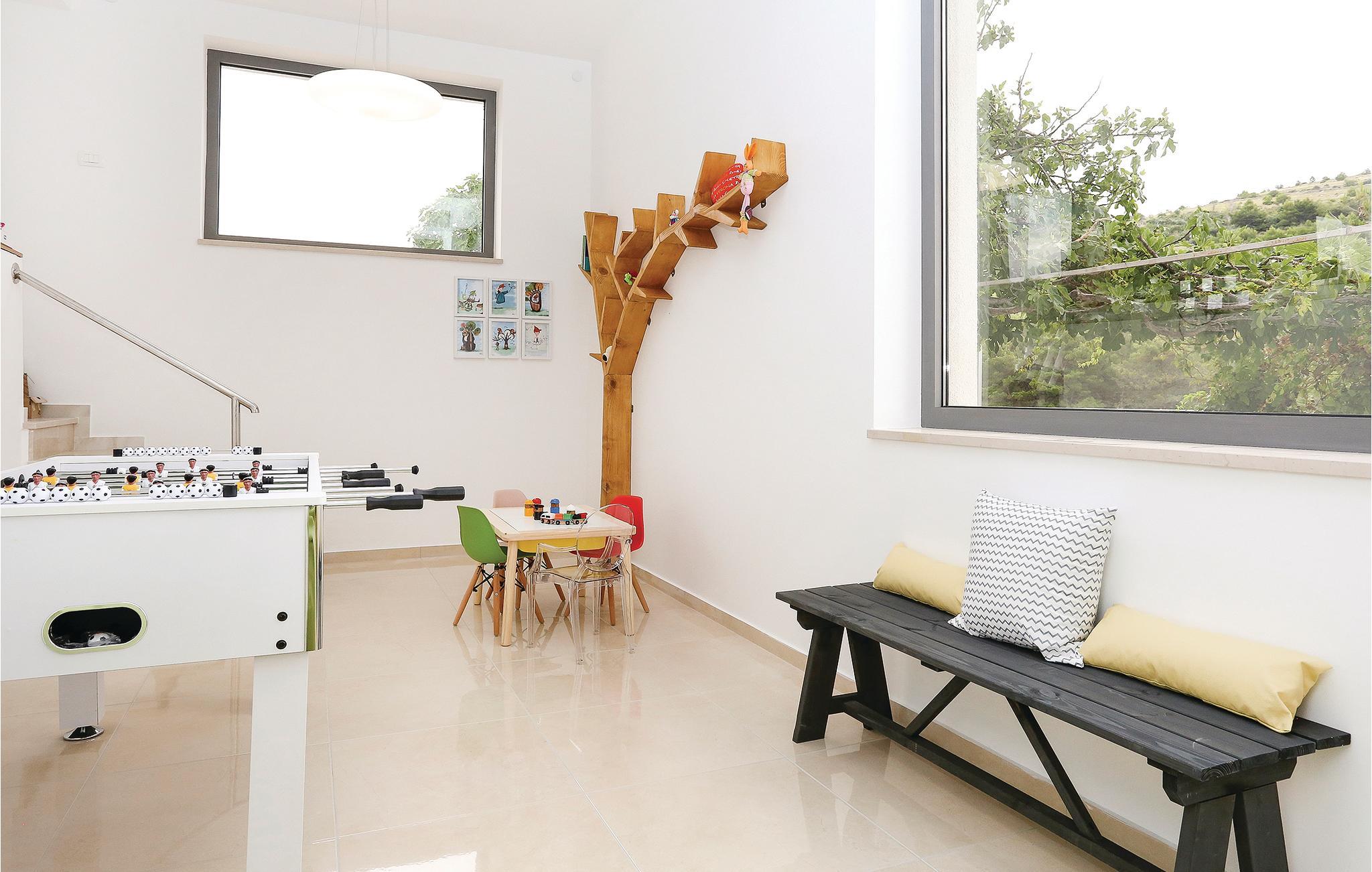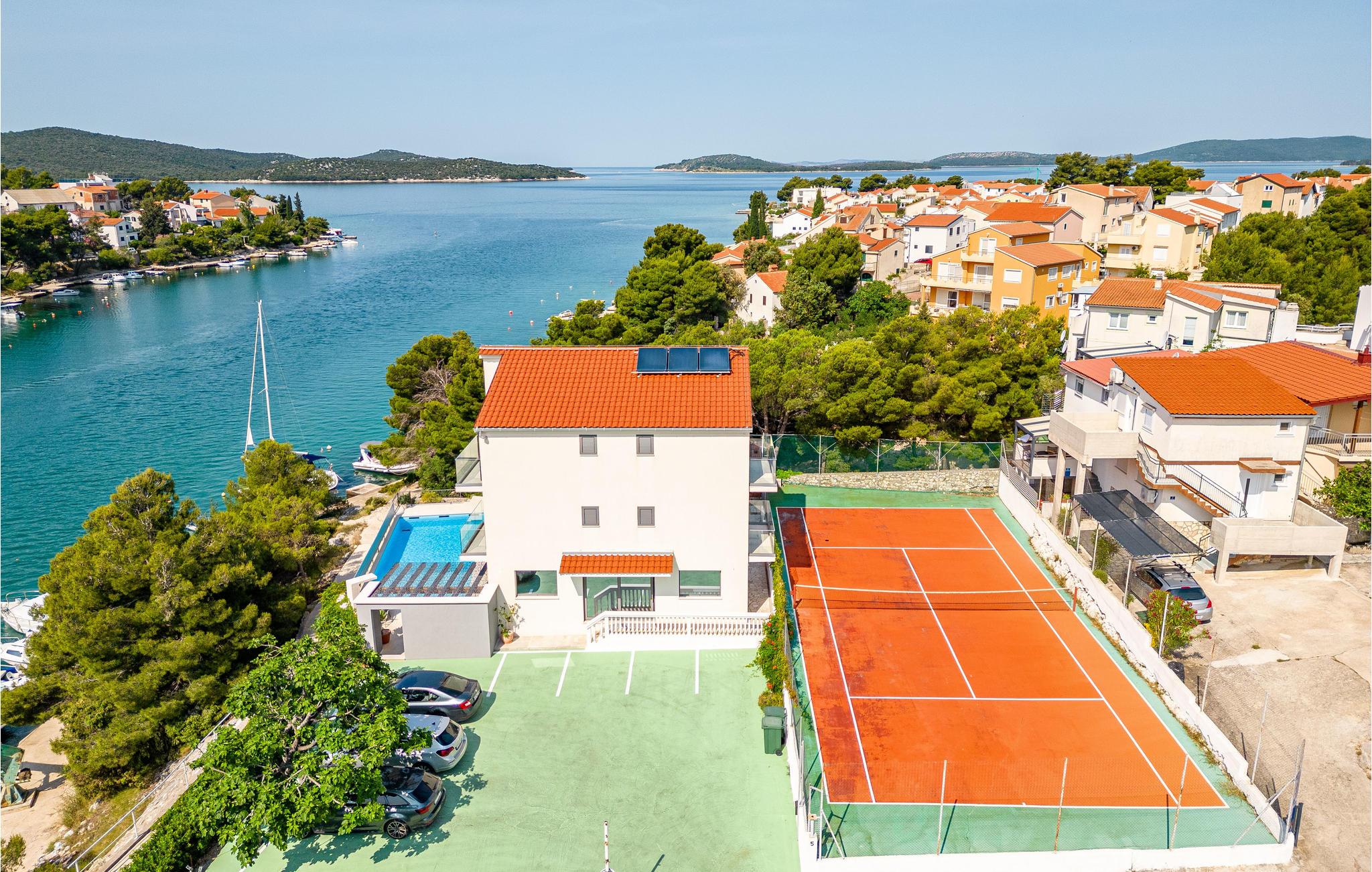 Kun 10 minutter i bil fra Šibenik ligger dette praktisk indrettede feriehus med smuk havudsigt. Huset er velegnet til en større gruppe. Det ligger ved en befærdet vej. I har swimmingpool med havvand, egen tennisbane og en indhegnet have, hvor I kan grille. Se mange af de spændende arrangementer, tag på opdagelse i området, og nyd en god middag på en af restauranterne i nærheden. Byen Šibenik byder på forretninger og restauranter. Den ligger lige ved en smuk, malerisk bugt ved udmundingen af floden Krka, som anses for at være en af Kroatiens smukkeste karstfloder. Lige i nærheden ligger ferieressortet Solaris, hvor der er mange underholdningsmuligheder for børn og unge. Vi anbefaler også at besøge nationalparkerne Krka og Kornati.