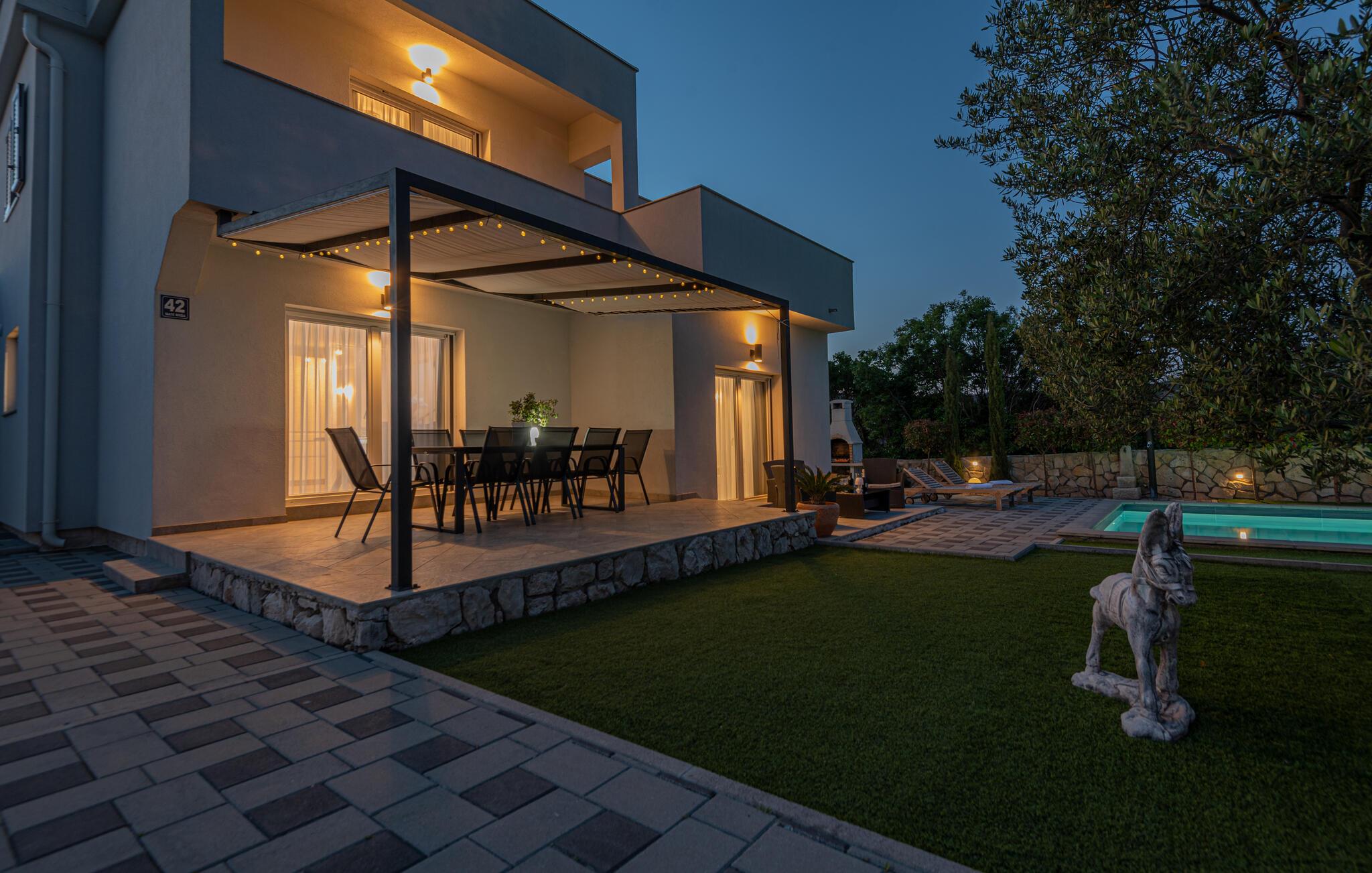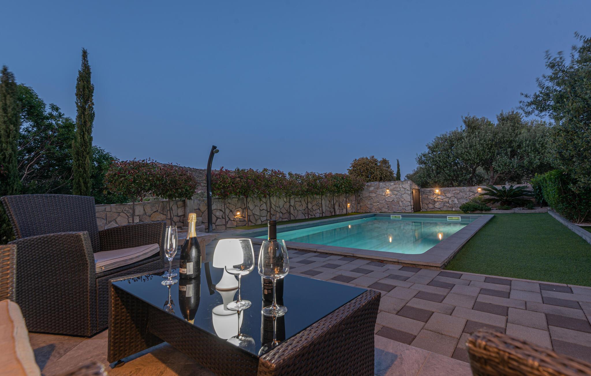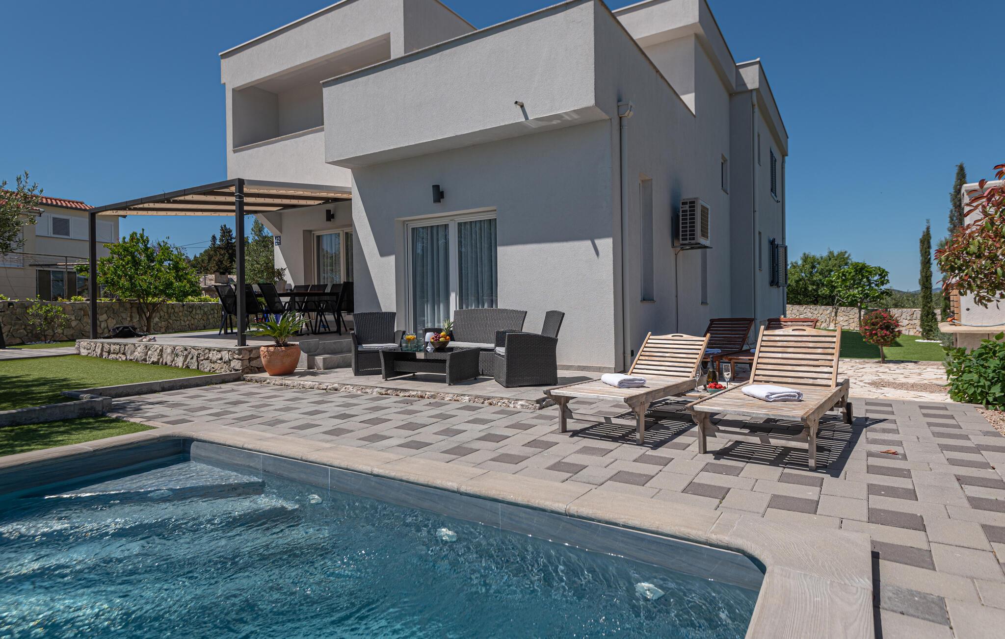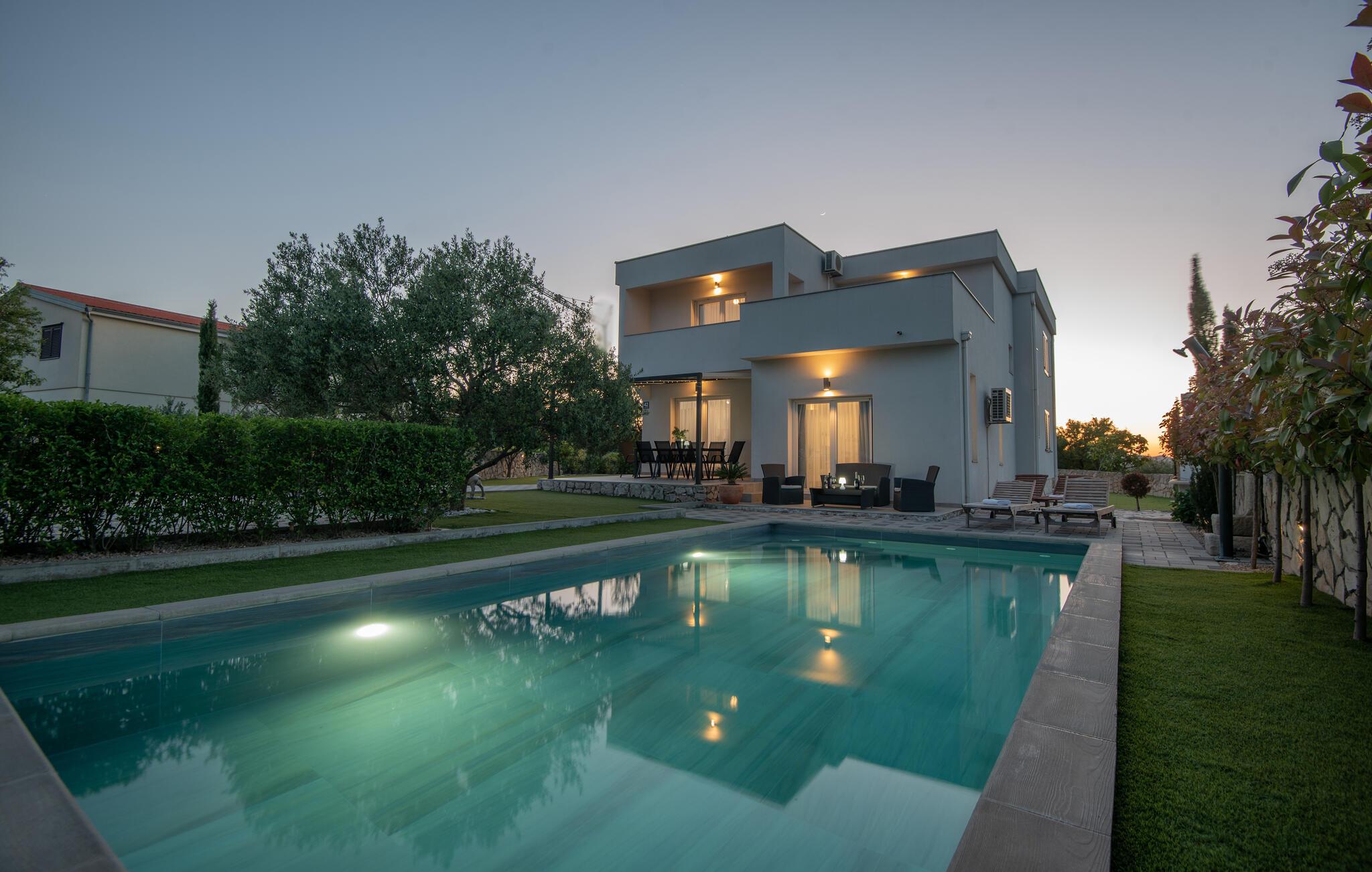 Dette skønne og smagfuldt indrettede feriehus med egen privat pool, ligger i den fredelige lille ferieby Zaton, i nærheden af Šibenik. Huset er på to etager der er forbundet med interne trapper. Et par trin fører op til opholdsafdelingen. Byens lange sandstrand er barrierefri, så den er også egnet til bevægelseshæmmede feriegæster. En lille pinjelund grænser op til stranden, her kan I søge skygge når solen står højt på himlen og det bliver for varmt. Der er mange udflugtsmuligheder, bl.a. byen Zadar, nabobyen Nin og ikke mindst de naturskønne nationalparker Krka, Kornati og Paklenica.