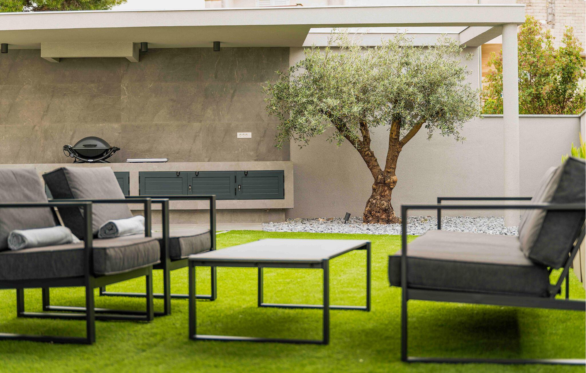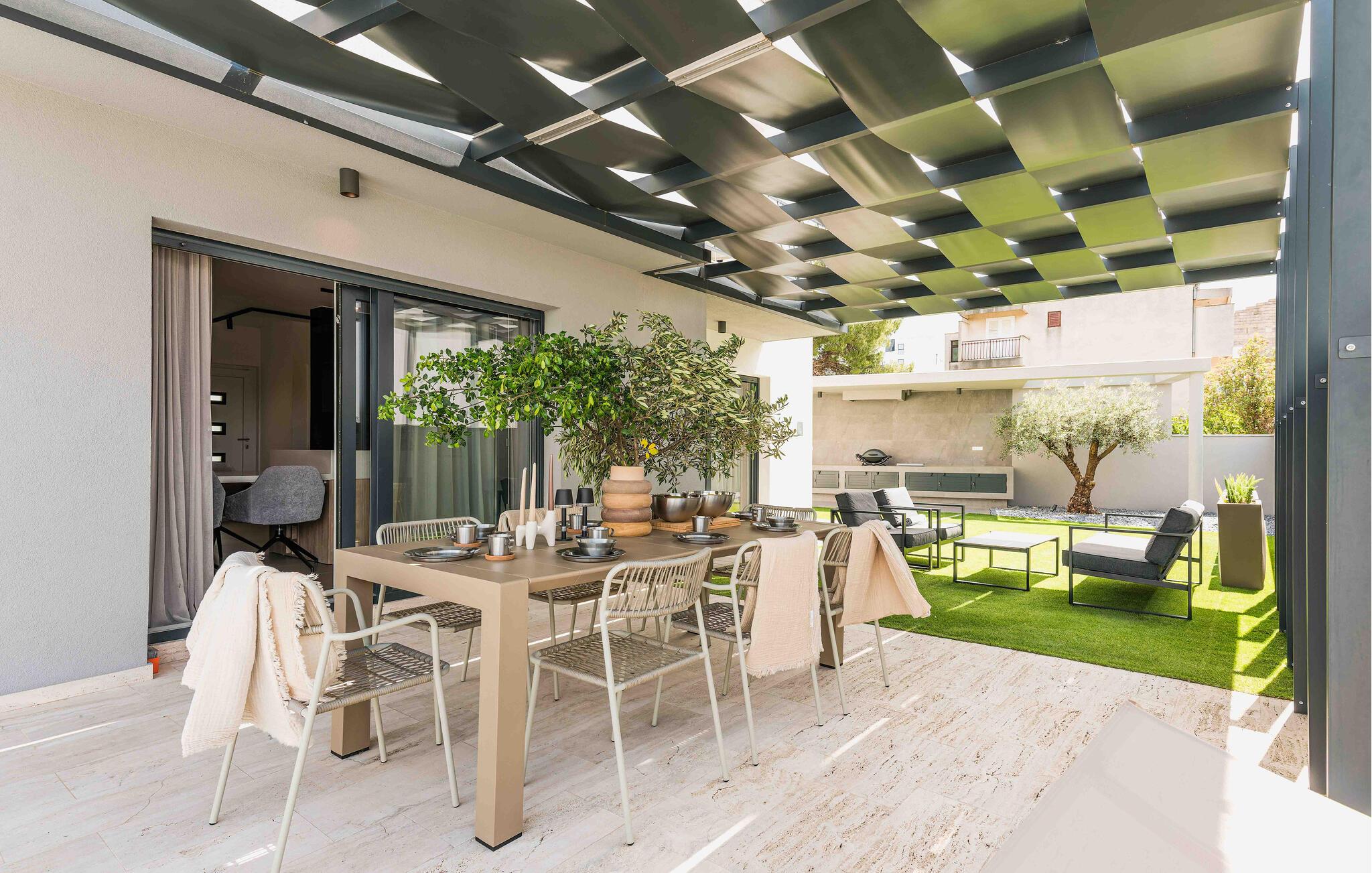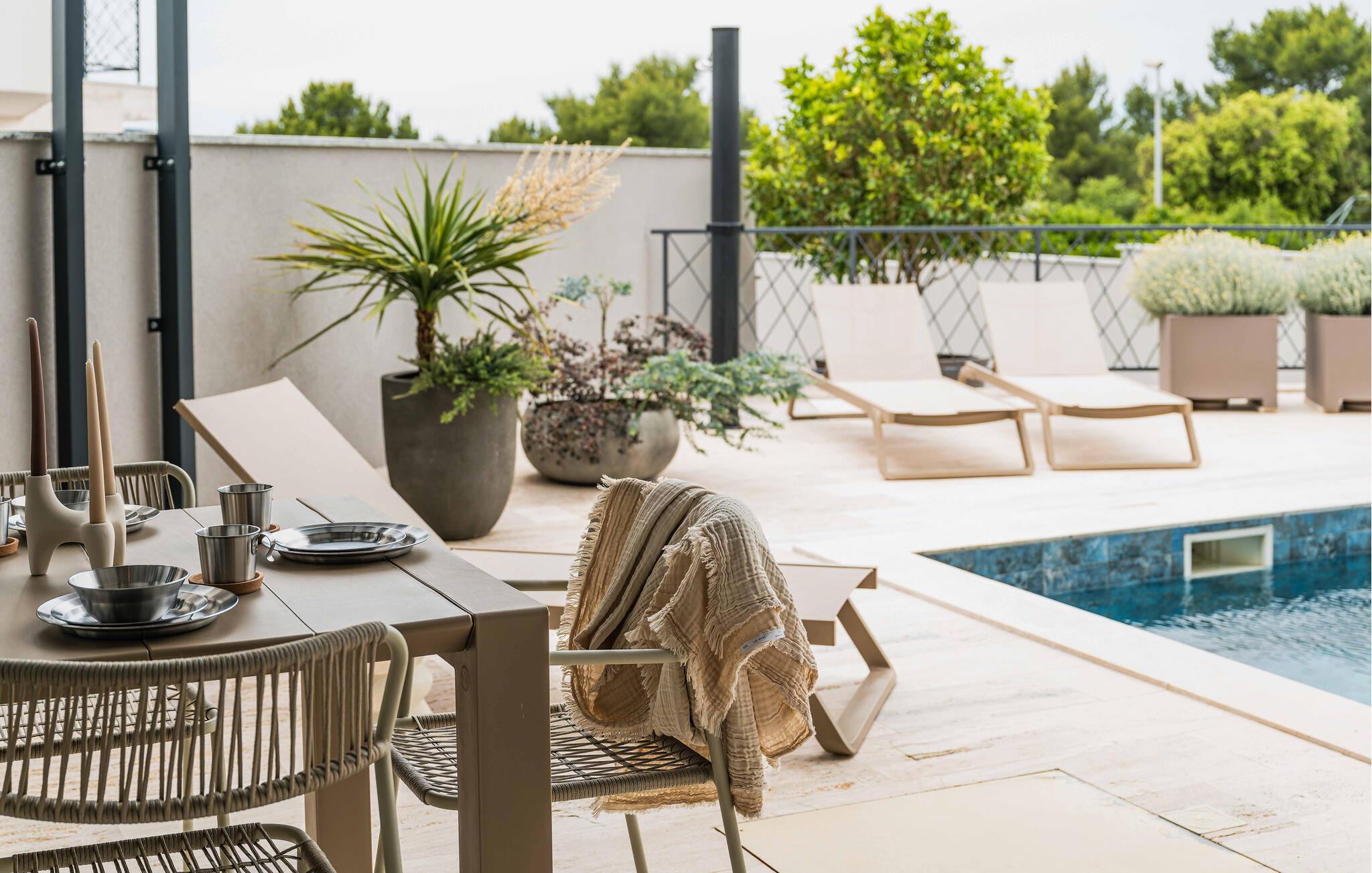 Det elegante udendørsområde er perfekt til fuldt ud at nyde Kroatiens vidunderlige klima. Brug den skyggefulde terrasse til morgenmad, tag en dukkert i den glitrende pool, og genoplad på de komfortable liggestole. Tilbring eftermiddage med at snakke over et glas vin og fejre kvalitetstid sammen med mindeværdige grillmiddage.