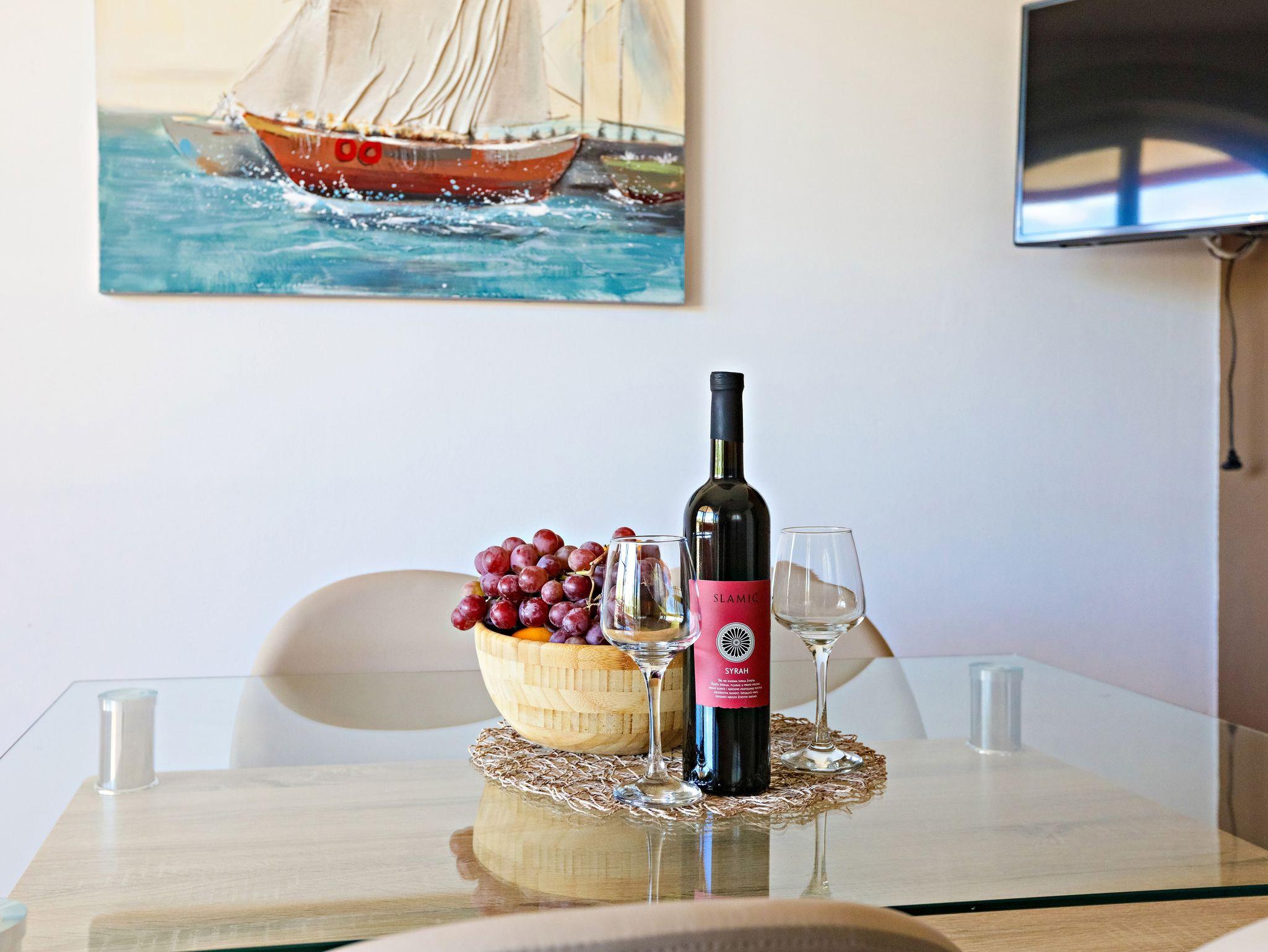 Ferienwohnung bietet Platz für 4 Gäste. Die Betten sind in Schlafzimmern, die es 2 gibt, innerhalb einer Gesamtfläche von 37m2, angeordnet. Die Gäste haben eine eigene Terrasse zur Verfügung, auf der sie in warmen Sommernächten genießen können. Das Apartment bietet Meerblick. Es ist erlaubt, Speisen auf dem Gemeinschafts-Grill vorzubereiten. IM PREIS INBEGRIFFEN: Kurtaxe, Endreinigung, Klimatisierung, Parkplatz, Internet. Die Verfügbarkeit zusätzlicher Dienstleistungen in Ihrem reservierten Termin und die Preise derselben (falls nicht aufgeführt) müssen im Voraus überprüft werden. Zusätzliche Dienstleistungen die in der Zahlungsaufforderung nicht aufgeführt sind werden direkt beim Vermieter bezahlt, angenommen der Gast nutzt auch diese.