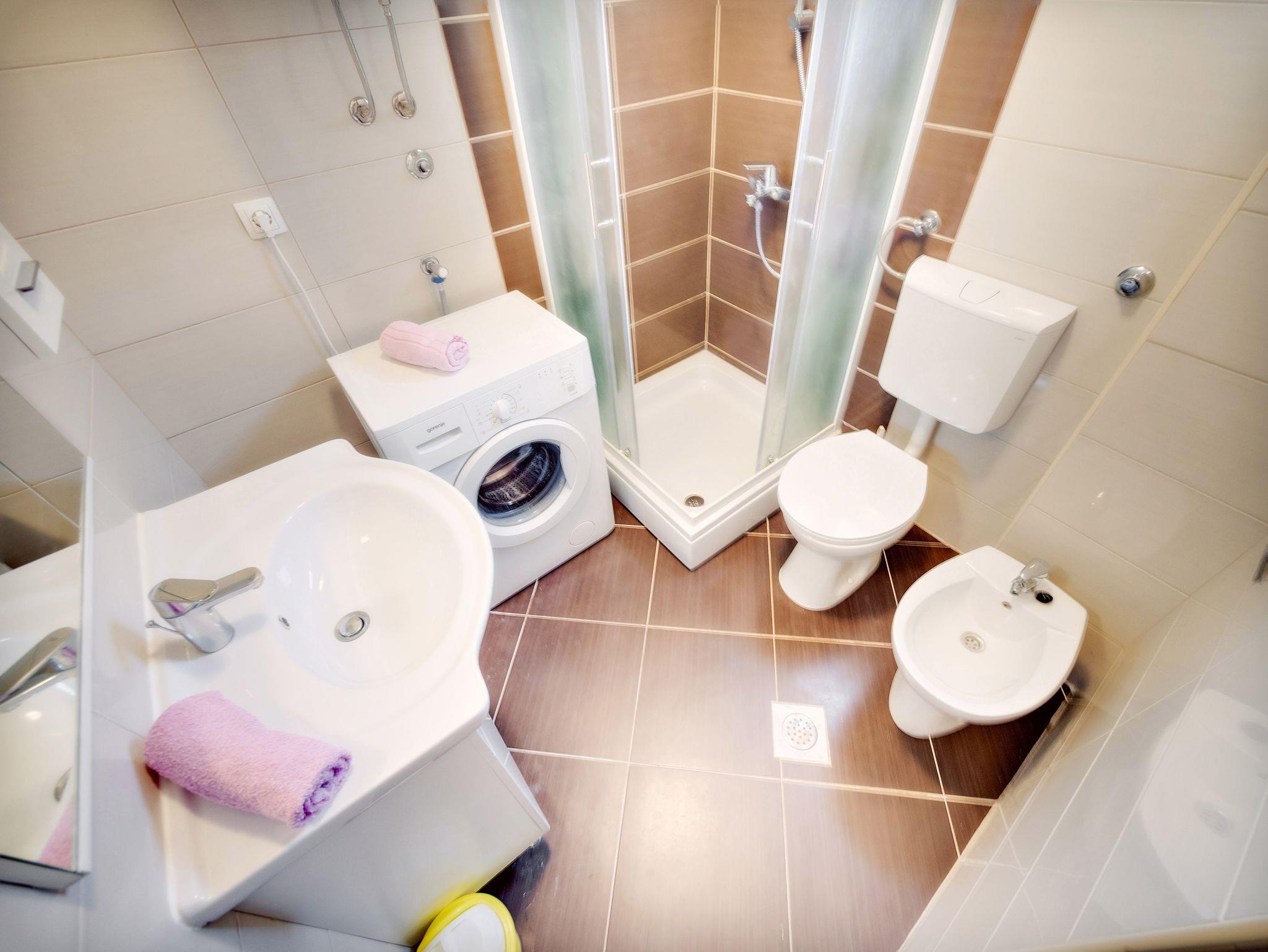 Ferienwohnung bietet Platz für 6 Gäste. Die Betten sind in Schlafzimmern, die es 3 gibt, innerhalb einer Gesamtfläche von 54m2, angeordnet. Die Gäste haben eine eigene Terrasse zur Verfügung, auf der sie in warmen Sommernächten genießen können. Es ist erlaubt, Speisen auf dem Gemeinschafts-Grill vorzubereiten. IM PREIS INBEGRIFFEN: Kurtaxe, Endreinigung, Klimatisierung, Parkplatz, Internet, Bügeleisen, Bügelbrett, Föhn, Sonnenschirm, Liegestühle. VERBINDLICHE ZUSÄTZLICHE KOSTEN: Aufzahlung für Kurzaufenthalte (prozentualer Zuschlag pro Nächtigungsanzahl: 30% - 1, 20% - 2, 10% - 3). Die Verfügbarkeit zusätzlicher Dienstleistungen in Ihrem reservierten Termin und die Preise derselben (falls nicht aufgeführt) müssen im Voraus überprüft werden. Zusätzliche Dienstleistungen die in der Zahlungsaufforderung nicht aufgeführt sind werden direkt beim Vermieter bezahlt, angenommen der Gast nutzt auch diese.