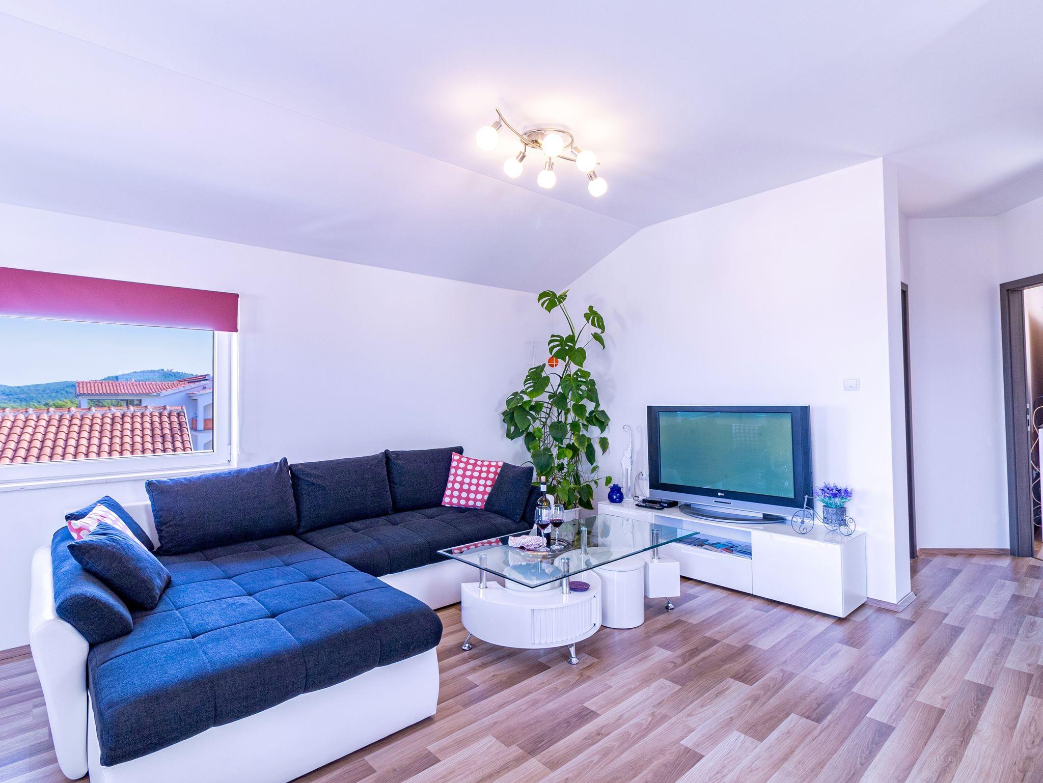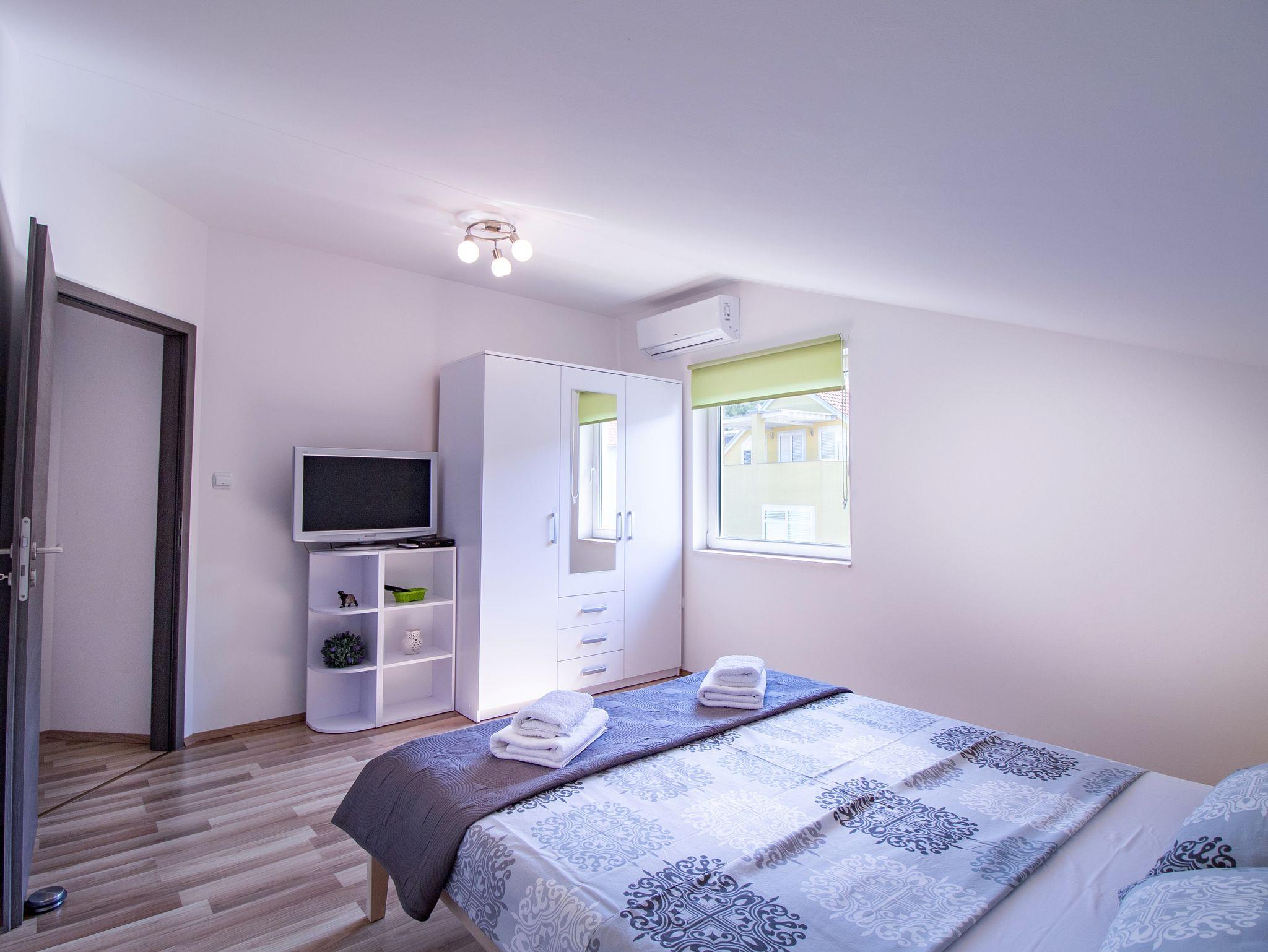 Ferienwohnung bietet Platz für 4 Gäste. Die Betten sind in Schlafzimmern, die es 2 gibt, innerhalb einer Gesamtfläche von 56m2, angeordnet. Die Gäste haben einen eigenen Balkon zur Verfügung, auf der sie in warmen Sommernächten genießen können. Das Apartment bietet Meerblick. Es ist erlaubt, Speisen auf dem Gemeinschafts-Grill vorzubereiten. IM PREIS INBEGRIFFEN: Kurtaxe, Endreinigung, Klimatisierung, Parkplatz, Internet, Kinderbett, Bügeleisen, Bügelbrett, Föhn, tragbarer Grill. VERBINDLICHE ZUSÄTZLICHE KOSTEN: Aufzahlung für Kurzaufenthalte (prozentualer Zuschlag pro Nächtigungsanzahl: 30% - 1, 20% - 2, 10% - 3). Die Verfügbarkeit zusätzlicher Dienstleistungen in Ihrem reservierten Termin und die Preise derselben (falls nicht aufgeführt) müssen im Voraus überprüft werden. Zusätzliche Dienstleistungen die in der Zahlungsaufforderung nicht aufgeführt sind werden direkt beim Vermieter bezahlt, angenommen der Gast nutzt auch diese.